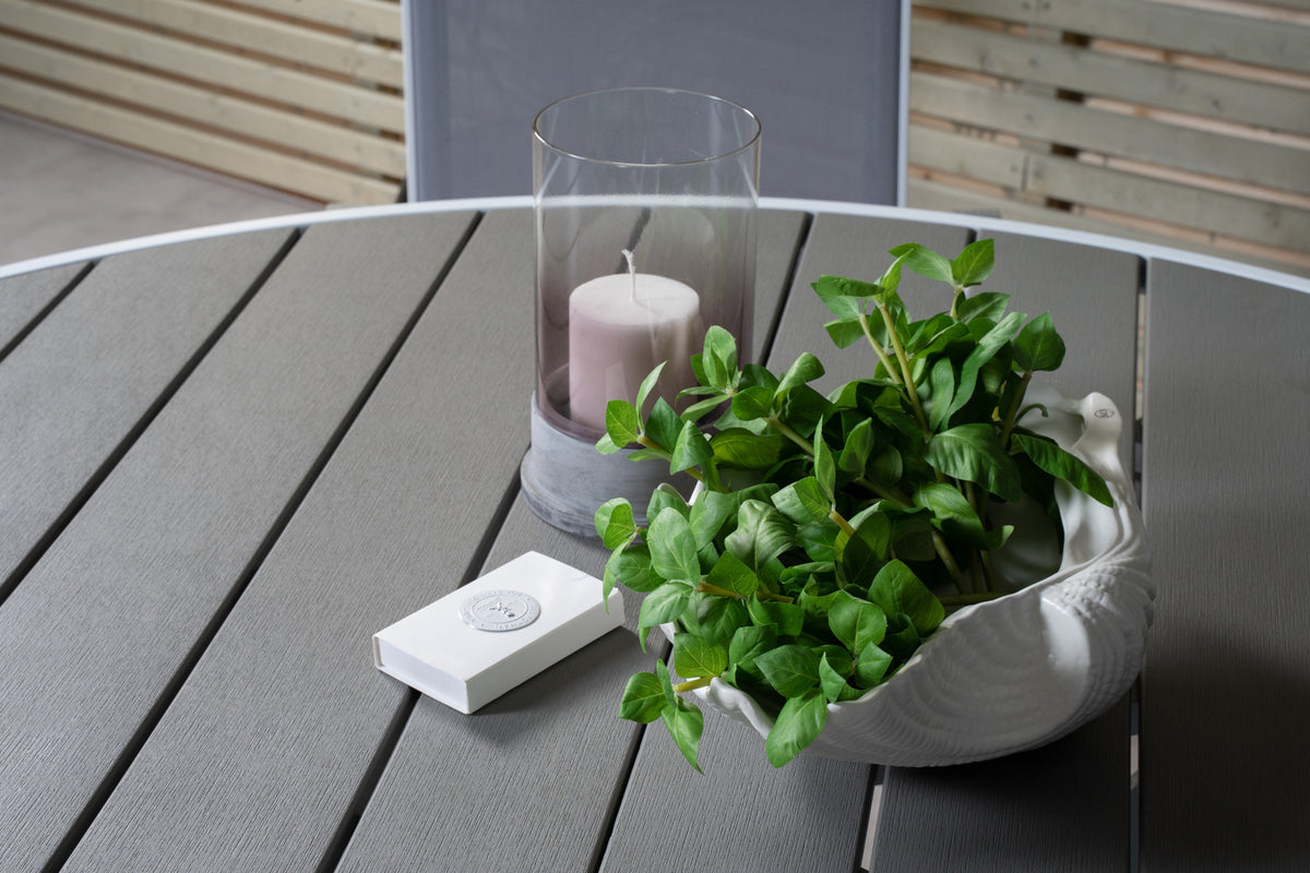 En rund spisegruppe hjælper med at skabe en dejlig stemning på terrassen eller altanen. Her kombineres vores spisebord Parma med vores stilfulde stole i samme serie.