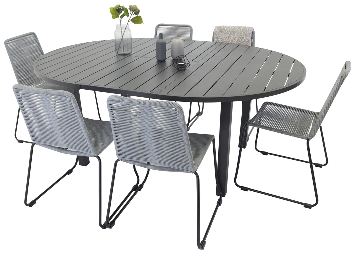Klassisk spisegruppe, der passer i de fleste husholdninger! Spisebord Marbella sammen med elegante spisestole i serien Lindos med et sæde i gråt vævet reb. Som skabt til dig, der vil skabe en hyggelig og moderne følelse i udestuen eller på terrassen.