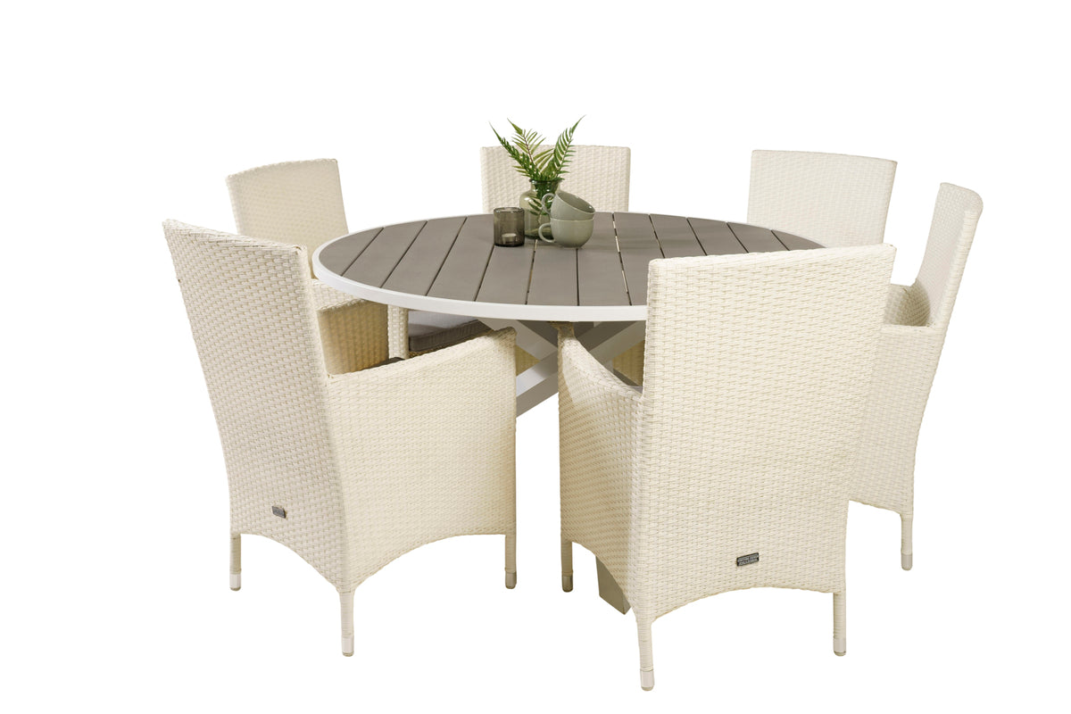 Runde spisegrupper giver en stor familiefornemmelse og samhørighed! Spisebord Parma sammen med vores luksuriøse kunstrattings-spisestole i serien Malin giver dig en spisegruppe at slappe af i. Her sidder du gerne længe og nyder dejligt selskab.