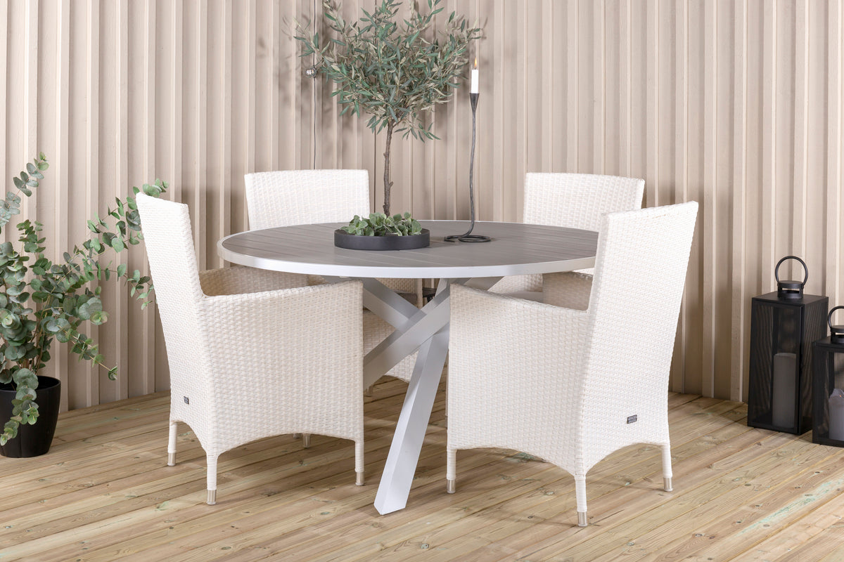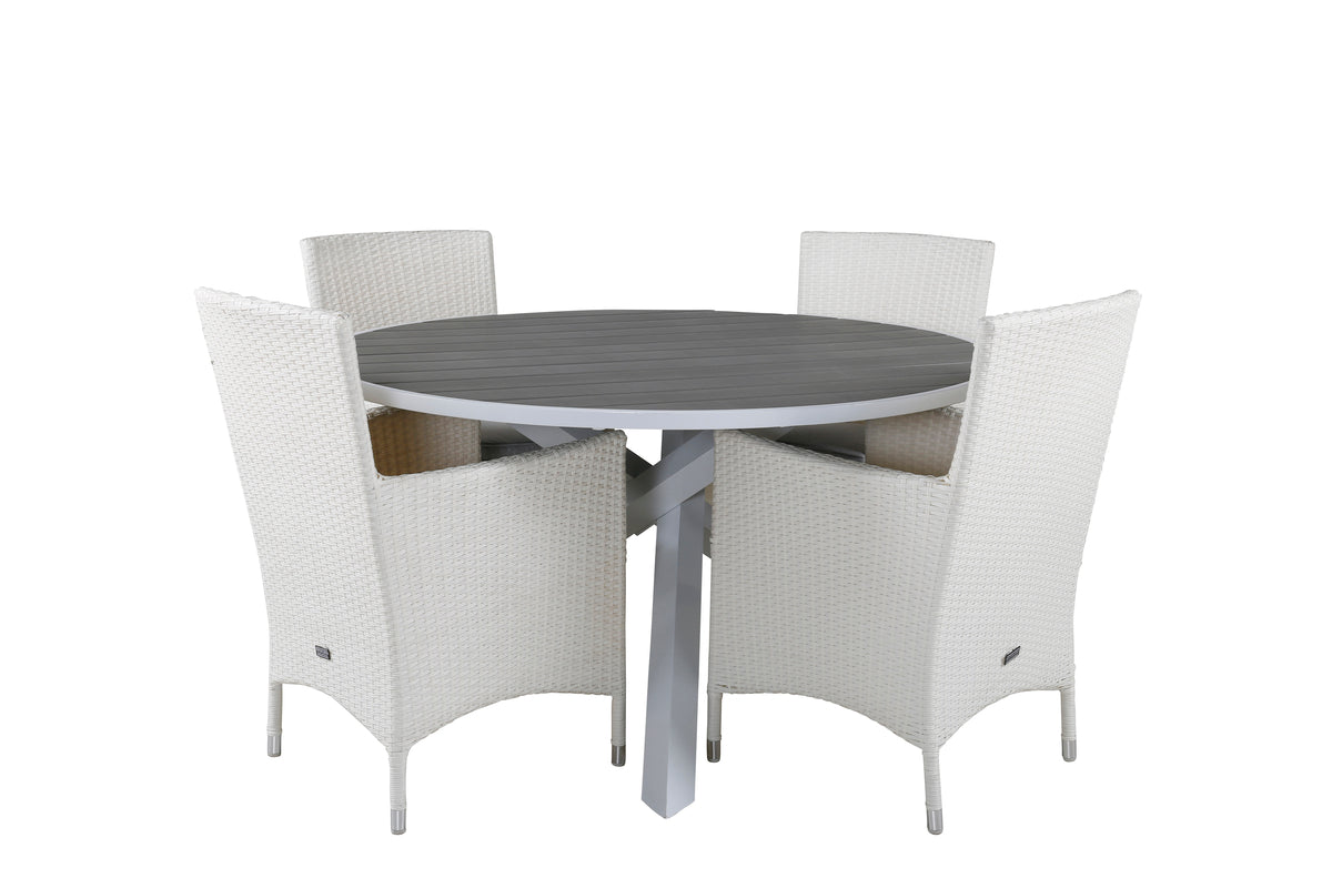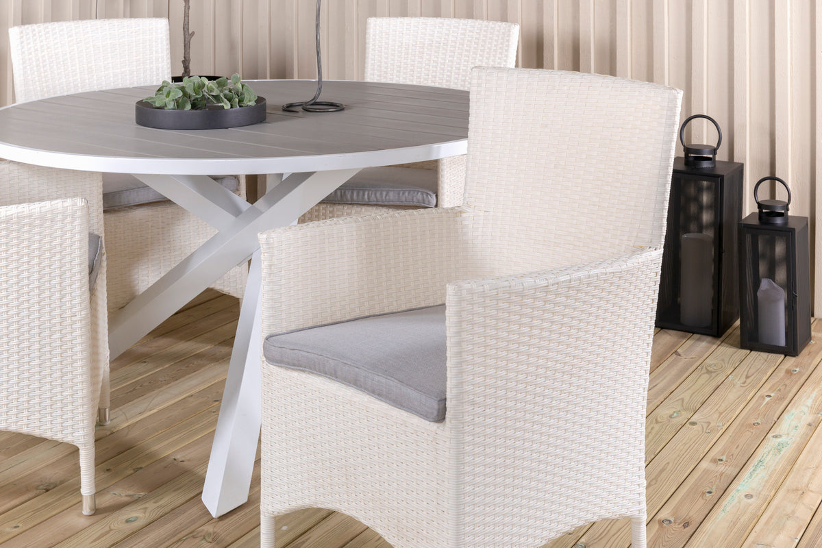 Runde spisegrupper giver en stor familiefornemmelse og samhørighed! Spisebord Parma giver dig sammen med vores hvide robuste kunstfletlænestole Malin en pompøs spisegruppe, der holder over tid!