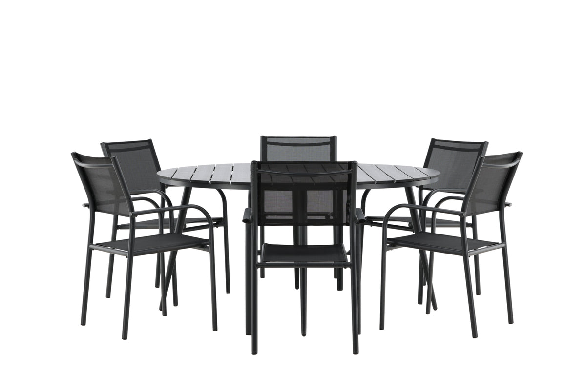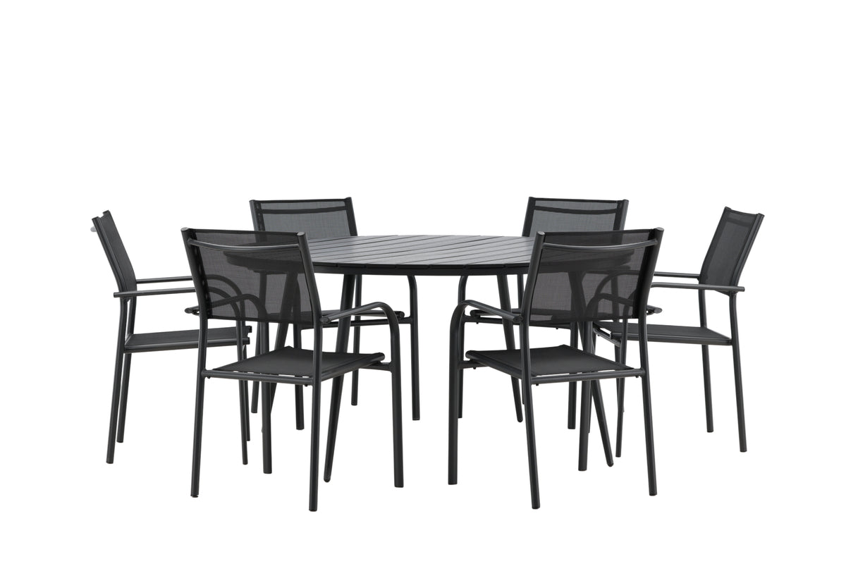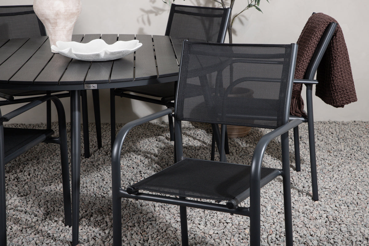 En lækkert matchende spisegruppe i sort farve, der rummer plads til mange - her havner ingen på kanten! Spisebord Break har en sort bordplade i aintwood og et klassisk understel i sort aluminium. Her i perfekt kombination med spisestole fra serien Santorini. Stolene har integrerede armlæn i aluminium og et sæde i sort textilene. Lad tiden her blive dagens højdepunkt!