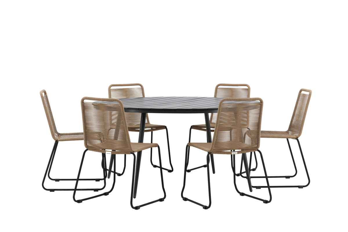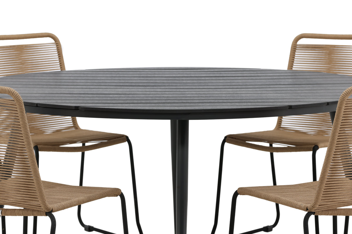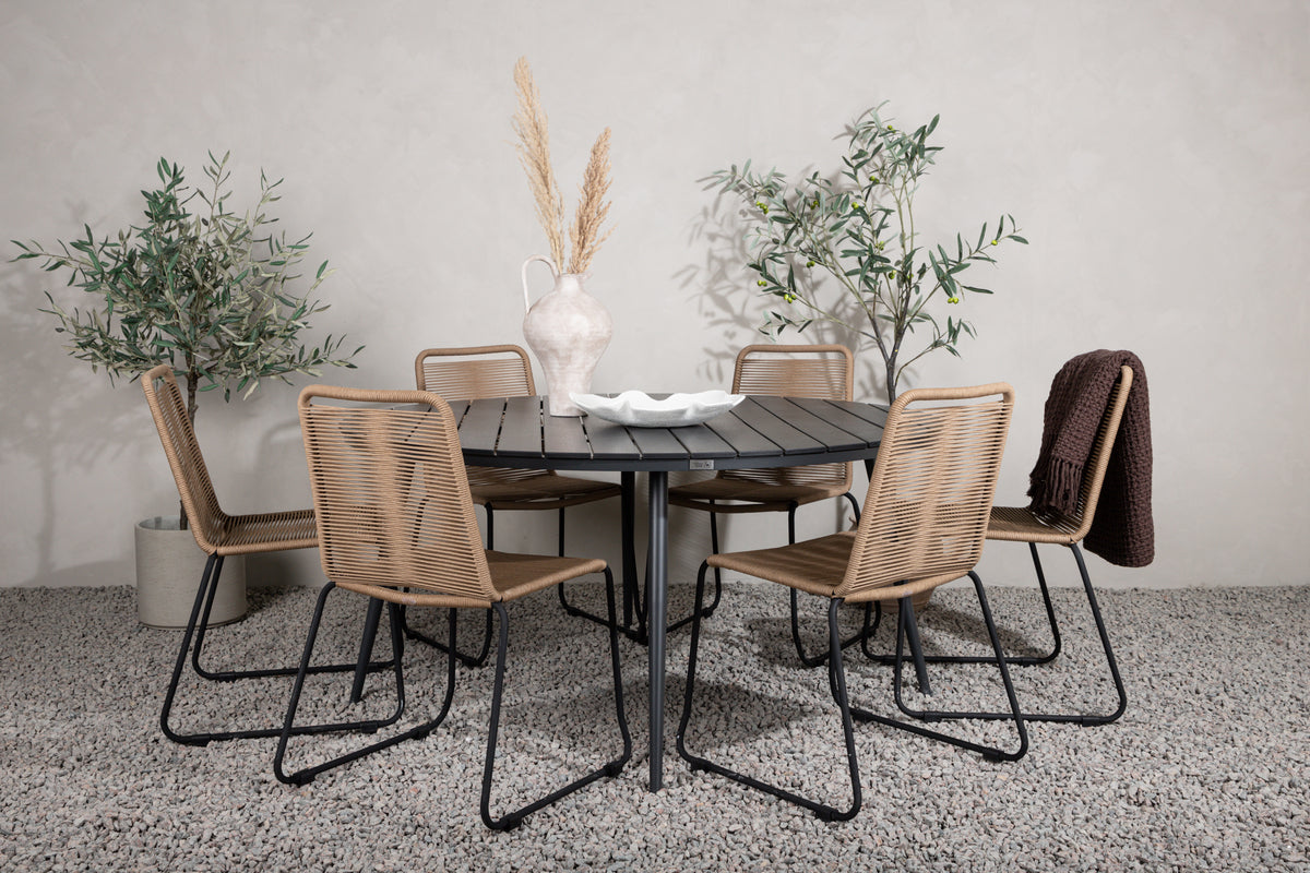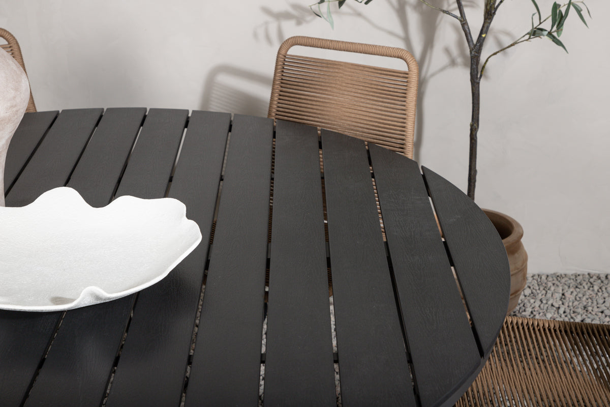 Skab et blikfang i udestuen eller på terrassen, der imponerer. Denne trendsikre spisegruppe har et gennemtænkt helhedsdesign med stole fra serien Lindos i jordnære farver og et sort spisebord fra serien Break. Stolene har stilrent smalle ben i sort stål og et sæde i slidstærkt lattefarvet reb. Bordet har en rund bordplade i aintwood og let udadgående ben i aluminium. Her er der plads til alle, og ingen risikerer at havne på kanten!
