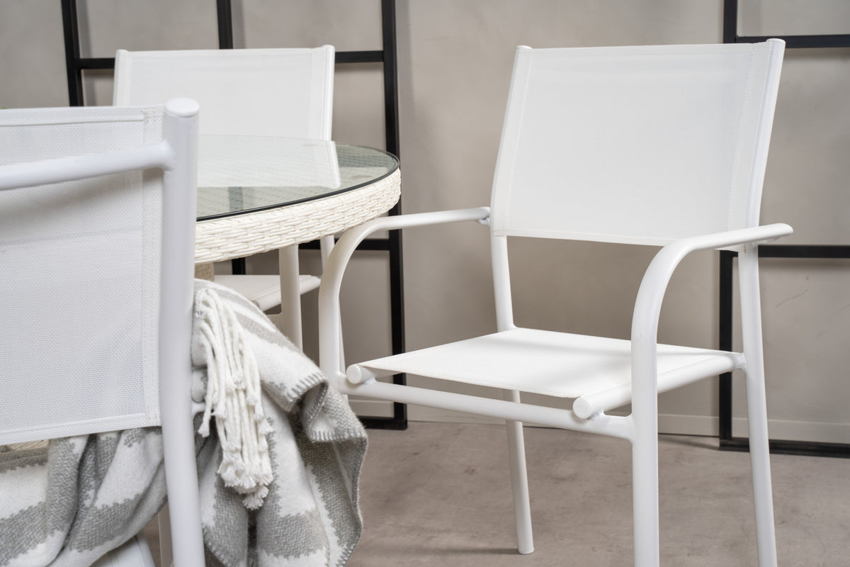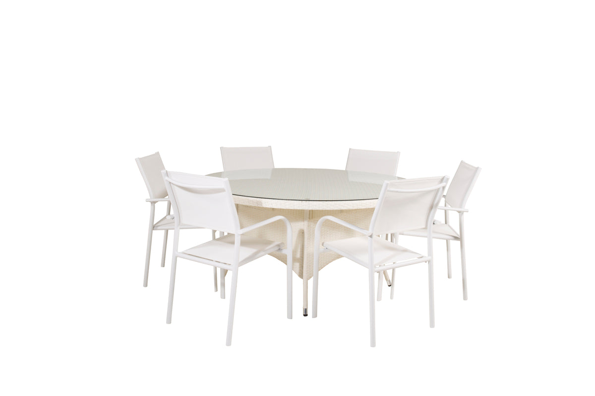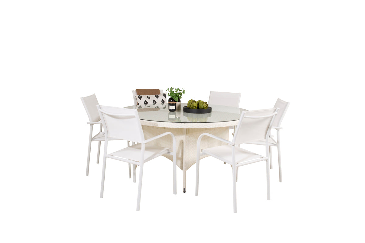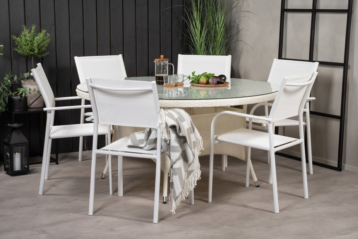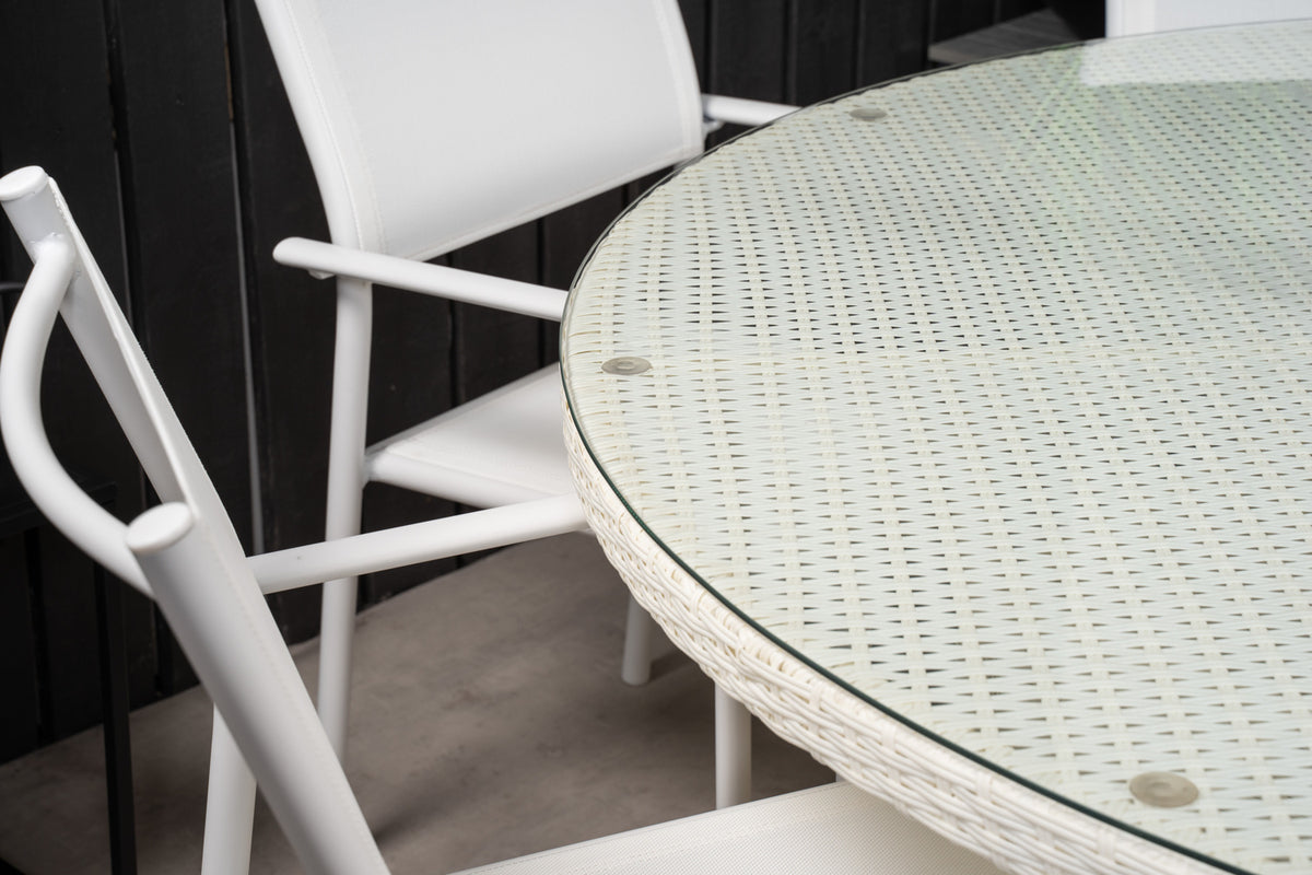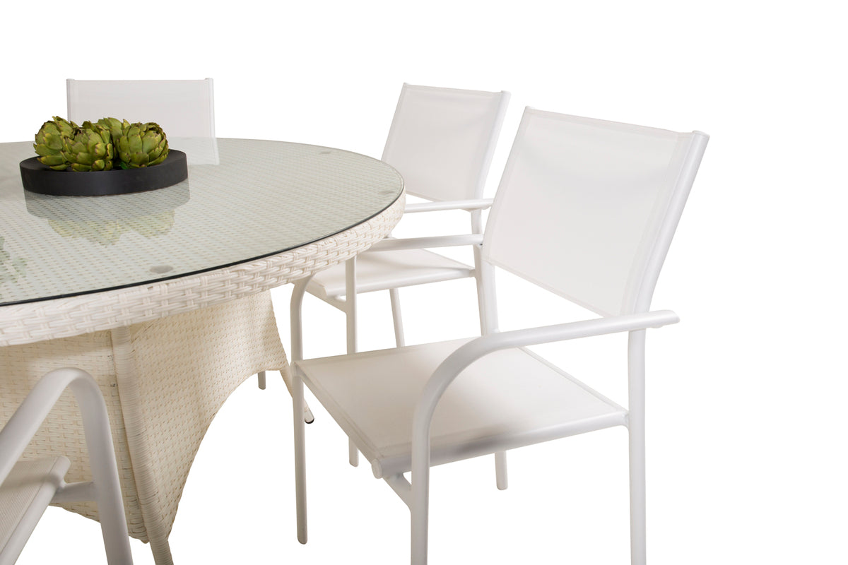 En lys og frisk spisegruppe, der garanteret vil pryde din terrasse til sommer! Vores smukke spisebord Volta med bordplade i glas kombineres perfekt med vores komfortable og robuste spisestole Santorini. Saml familien til en solrig sommerfrokost i denne iøjnefaldende spisegruppe!