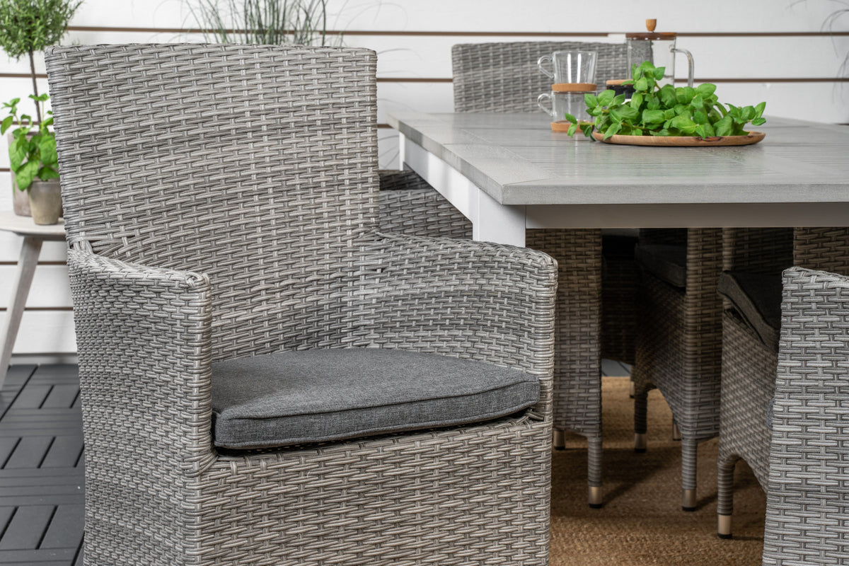 Vores elegante og stilsikre klapstole Malin i gråt kunstflet i kombination med det forlængelsesbare spisebord Albany passer perfekt på terrassen eller i udestuen. Lad din terrasse blive prydet af denne iøjnefaldende spisegruppe og nyd sene sommeraftener!