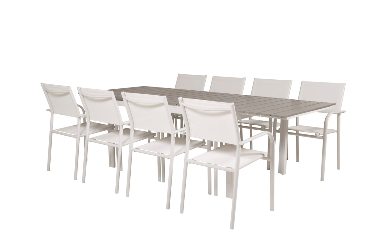 En stilren spisegruppe, der aldrig går af mode! Invitér til dejlige middagsstunder rundt om vores forlængelsesbare spisebord Levels. Her sammen med moderne spisebordsstole i serien Santorini. Lad terrassen præges af din nye iøjnefaldende spisegruppe, der passer til alle lejligheder og rummer plads til alle.