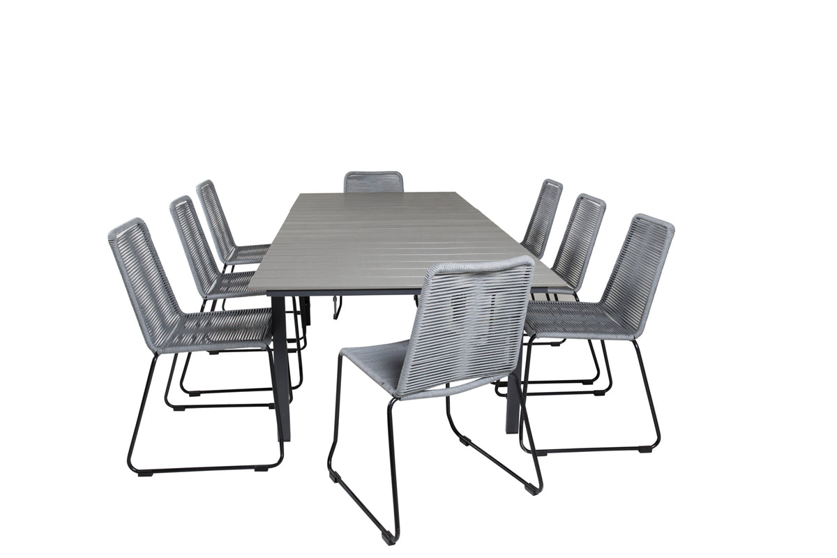Møblér din terrasse med denne iøjnefaldende spisegruppe i dejlig gråskala! Spisebord Levels og stole i serien Lindos udgør den perfekte kombination i kunstnerisk design, der giver en moderne følelse. Invitér nære og kære til lange, hyggelige middagsstunder i sommer!