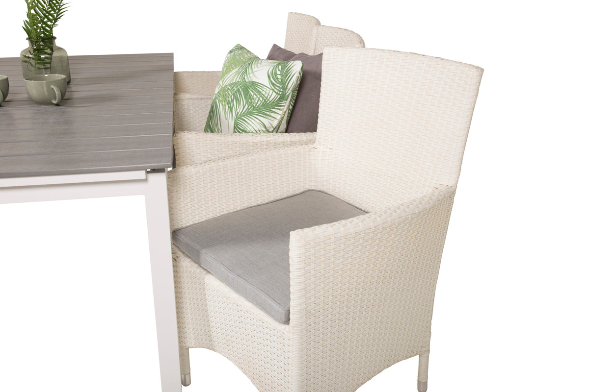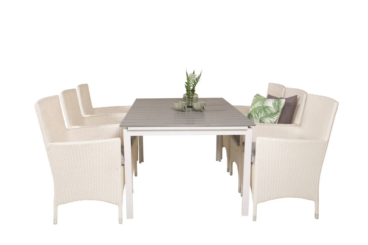 Læng dig efter udesæsonen med os! Det forlængelige spisebord Levels sammen med vores luksuriøse hvide kunstflet-spisebordsstole i serien Malin giver dig en spisegruppe at slappe af i. Her sidder du gerne længe og nyder dejligt selskab.