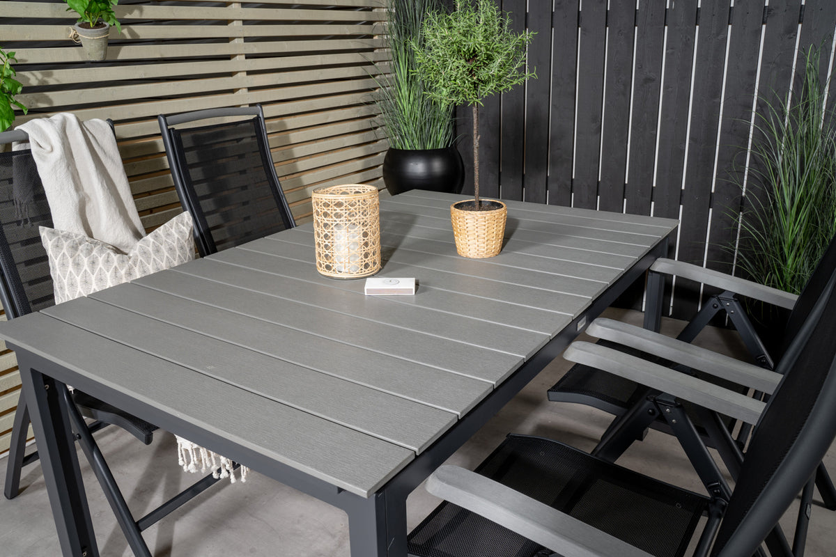 Albanys sammenklappelige spisebordsstole kombineres her til terrassen med Levels forlængelsesbare spisebord. Med denne spisegruppe slipper du for at bekymre dig om plads, den passer lige så godt til hverdag som til fest!