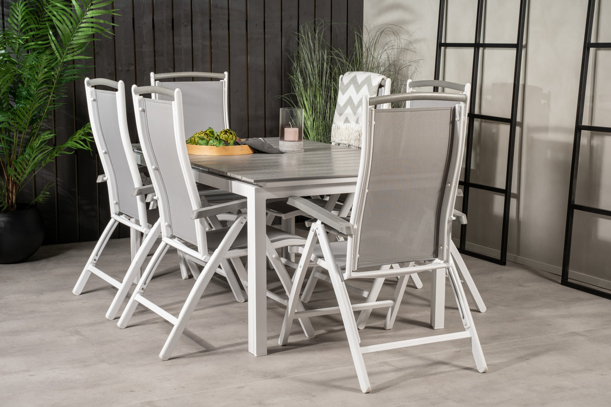 Moderne og tidløst! Gør dig klar til udesæsonen med denne dejlige spisegruppe. Med det forlængelige spisebord Levels og de forlængelige spisebordsstole Albany slipper du for at bekymre dig om pladsen. Invitér til mange sociale stunder fremover!