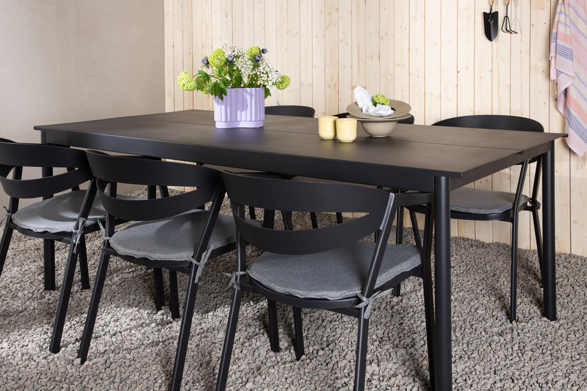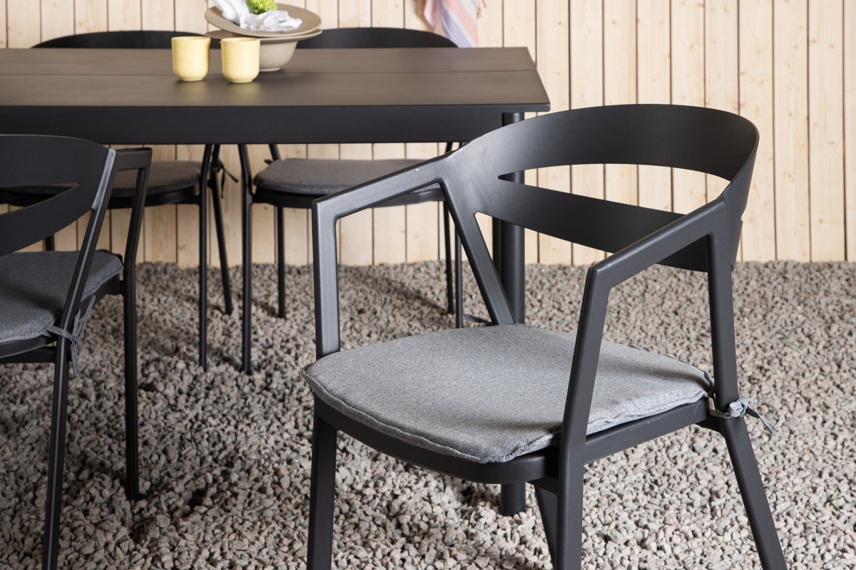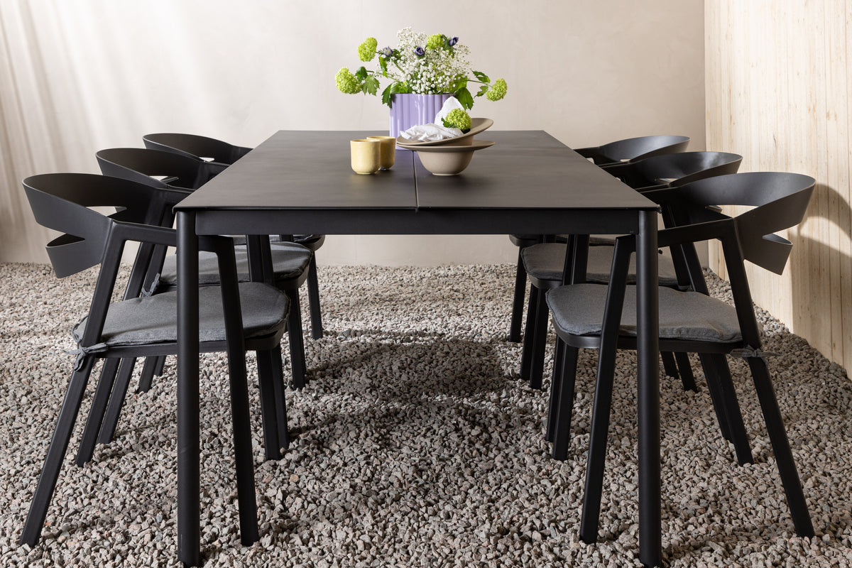 Skab et charmerende midtpunkt at samle nære og kære omkring! Modena er vores populære spisebord i lige nordiske former, der har plads til mange. Bordet har en rektangulær bordplade i sort aluminium og cylinderformede ben i minimalistisk stil. Spisebordsstolene fra serien Slit har integrerede armlæn i sort aluminium og en grå hynde for ekstra komfort. Sid behageligt og nyd hyggelige måltider!