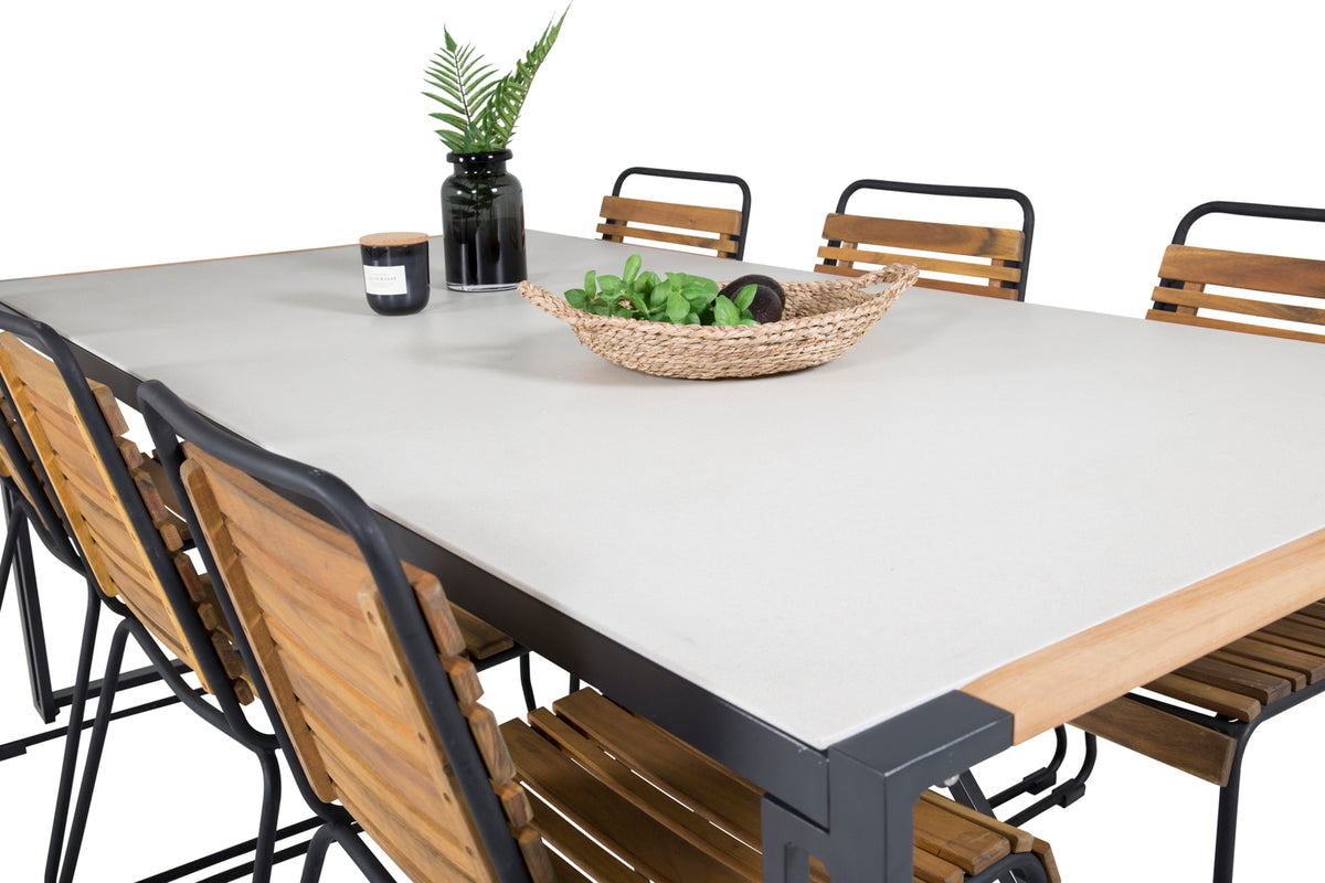 Nette spisestole Bois i et dejligt træfarvet look sammen med spisebordet Texas. Kombinationen af sort, grå og træ giver et hyggeligt udtryk på enhver terrasse!
