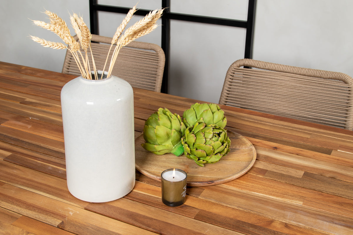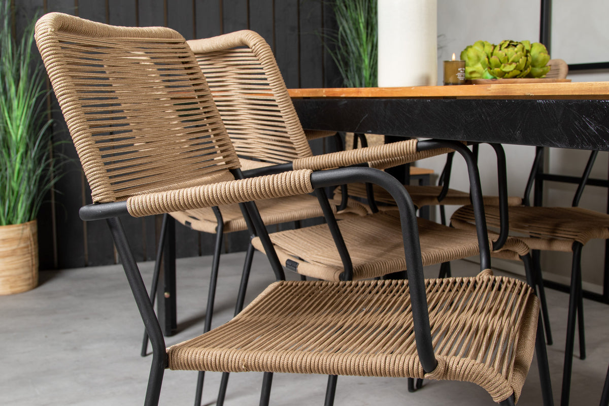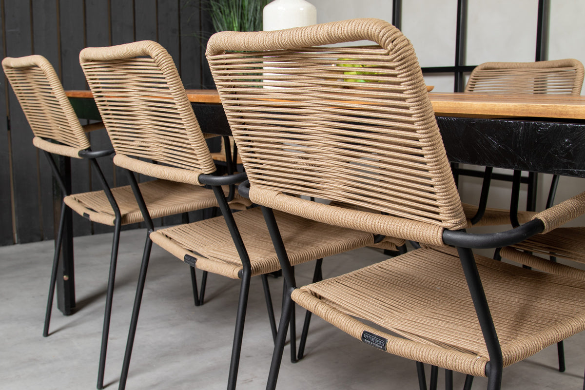 En moderne spisegruppe, der passer perfekt til terrassen! Spisebordet Bois i klassisk stil har en smuk bordplade i træ. Her sammen med vores stilrene spisestole Lindos med et sæde i brunt vævet reb. Lad din terrasse blive prydet af denne iøjnefaldende spisegruppe og nyd sene sommeraftener!
