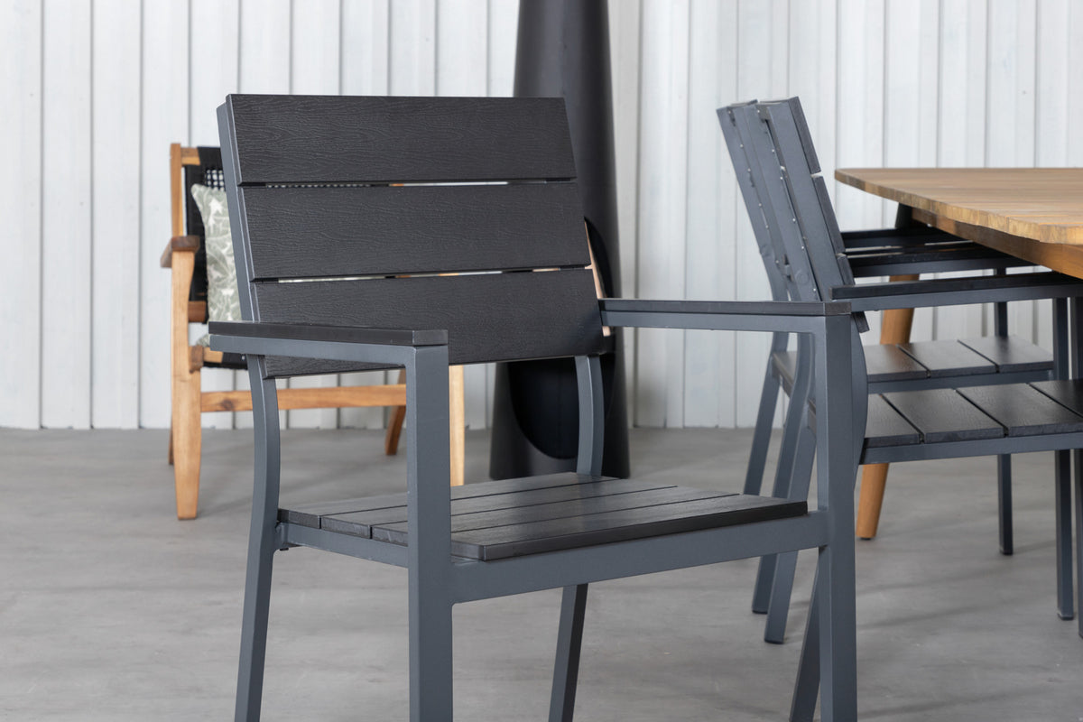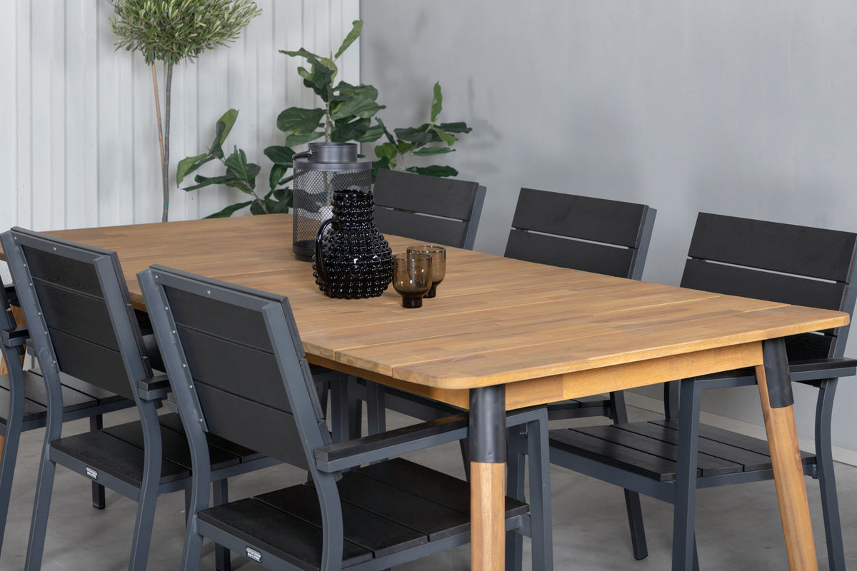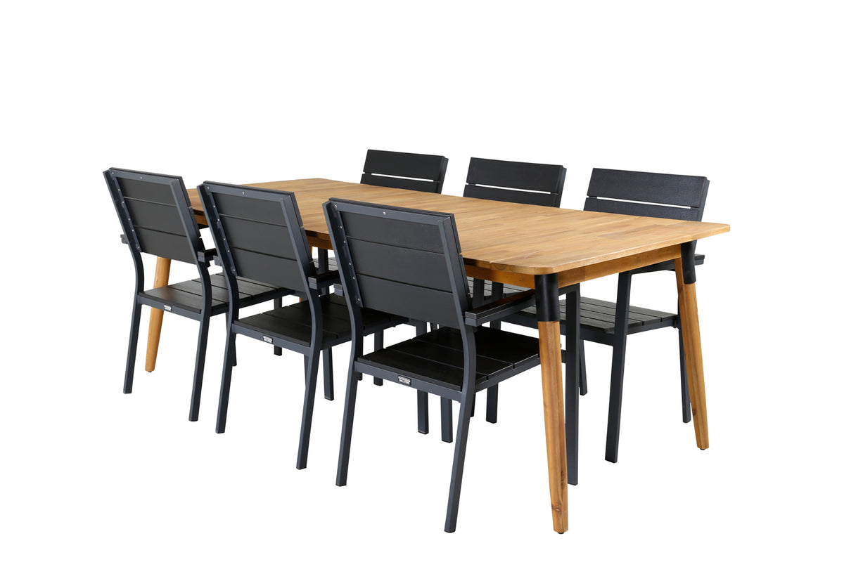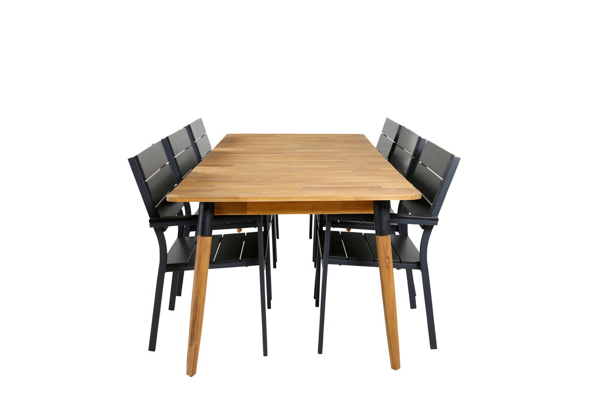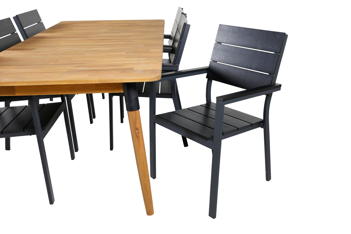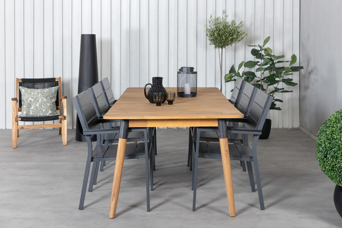Det klassiske træ-look går aldrig af mode! Her kombineres de sorte spisestole Levels med spisebord Julian i lækkert akacie! Lad denne smukt matchede spisegruppe med moderne følelse blive et naturligt samlingssted i udestuen.