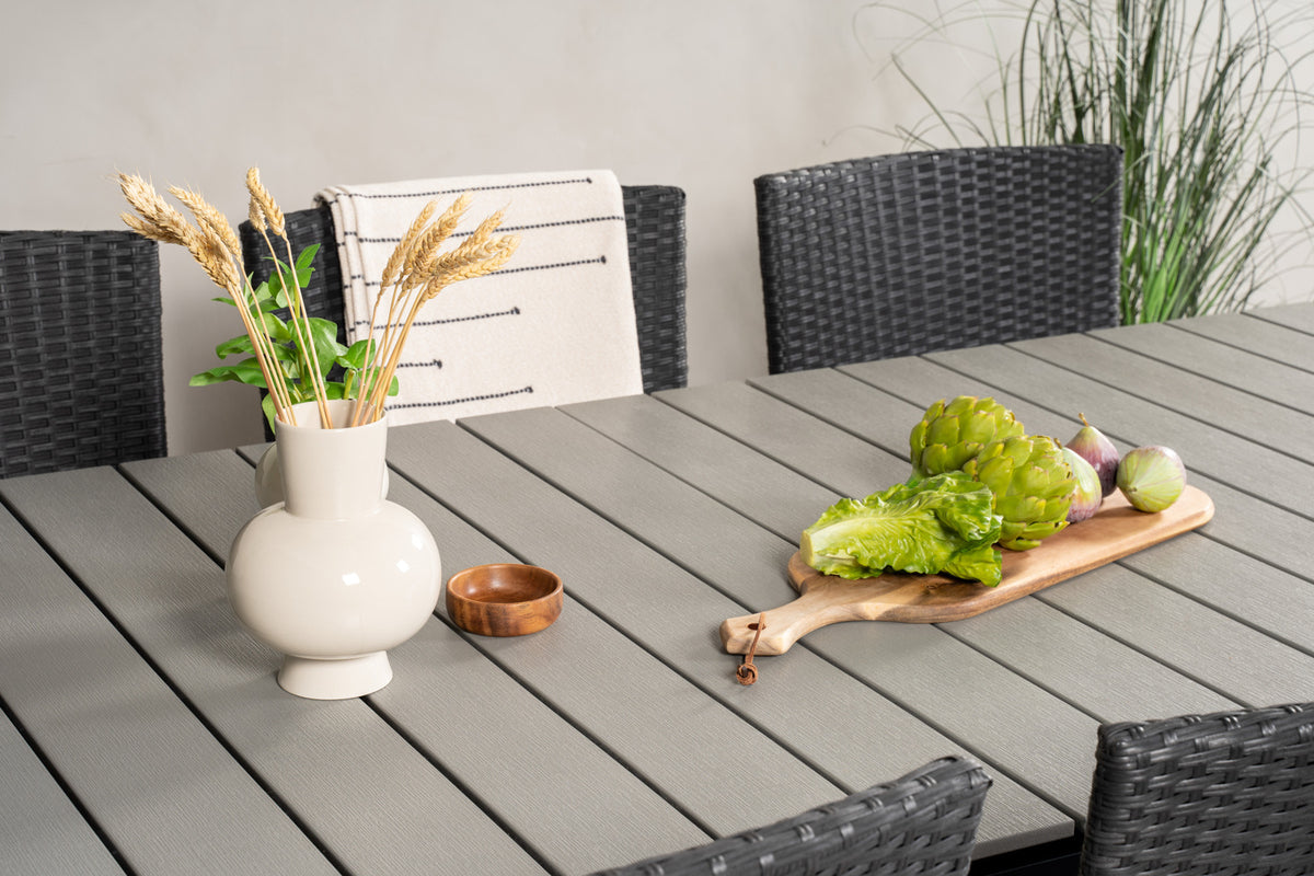 En spisegruppe i moderne og stilrent design. Spisebord Levels og spisebordsstole Malin er den perfekte kombination til havens hjerte!