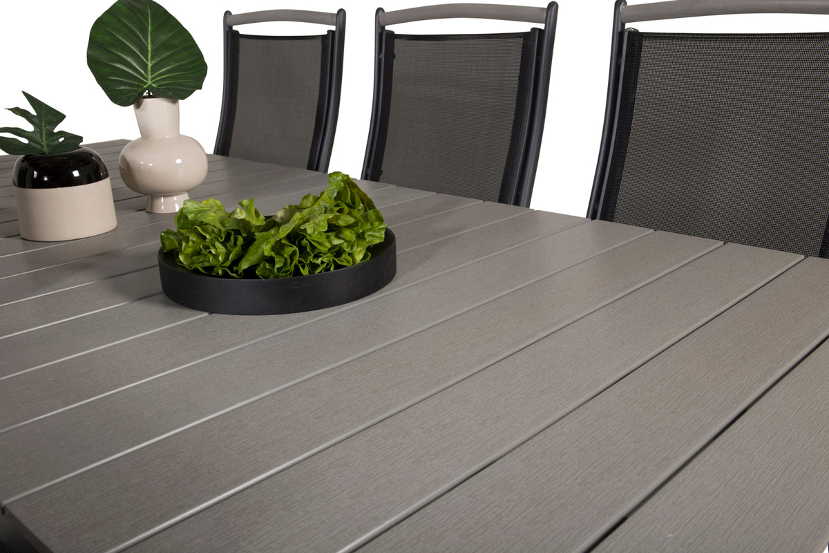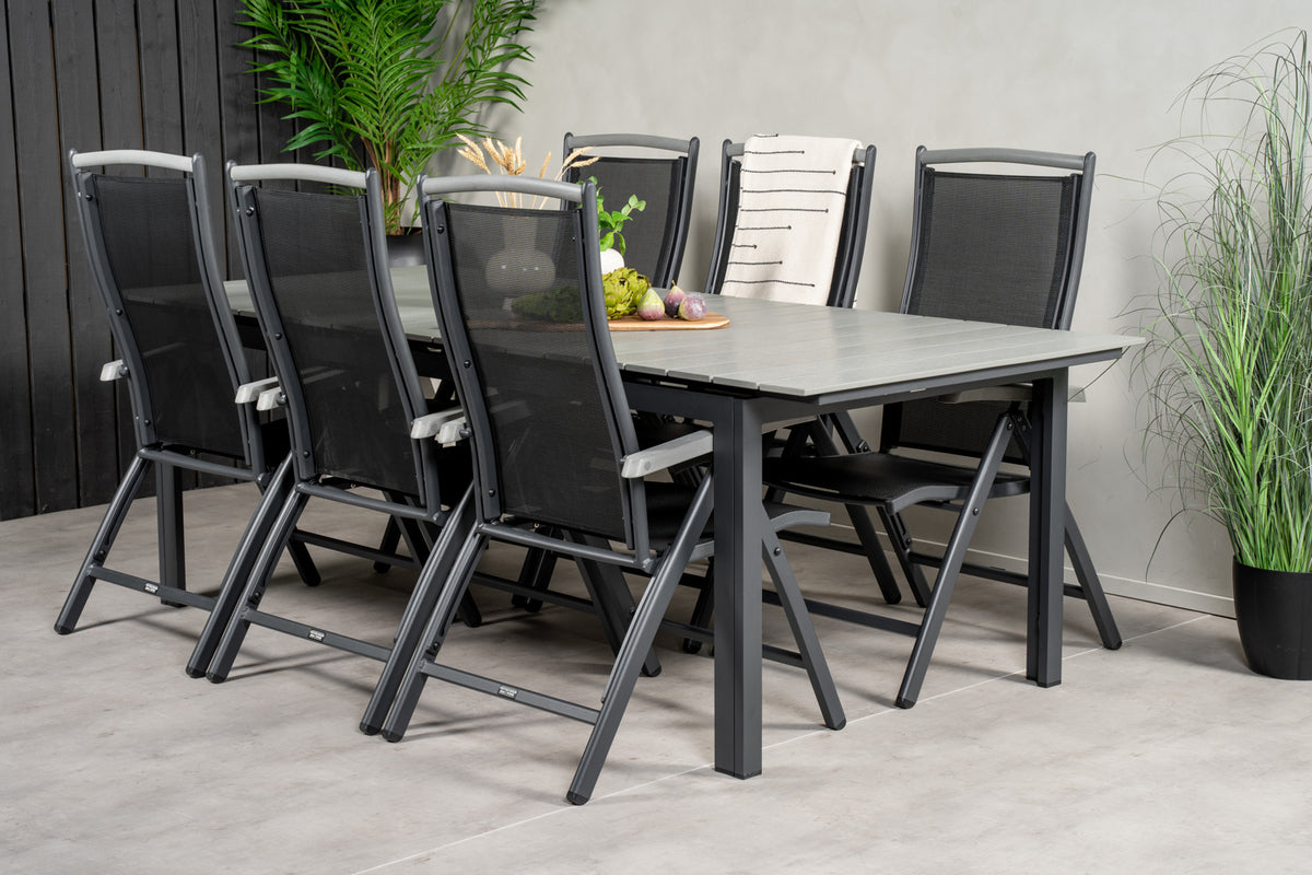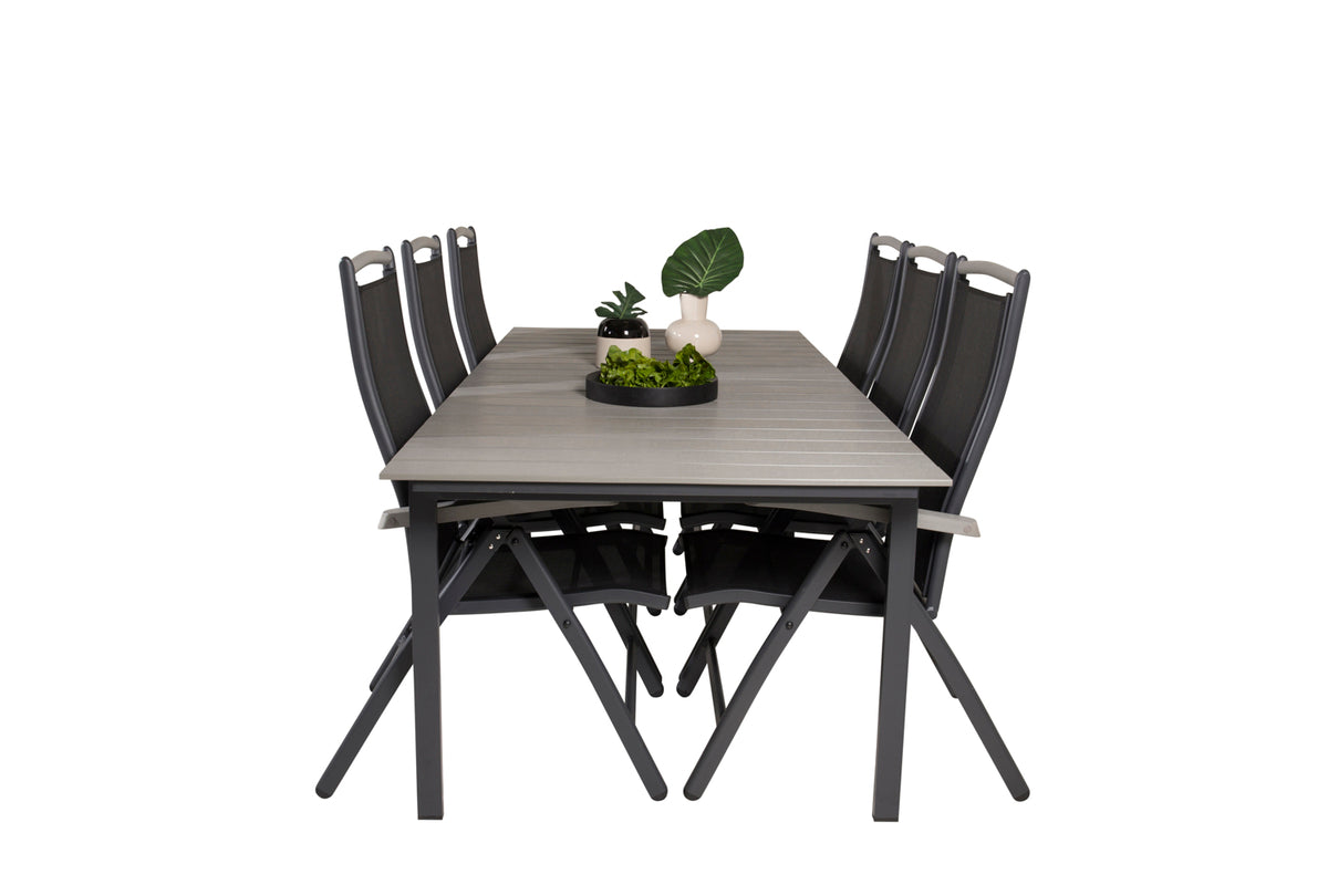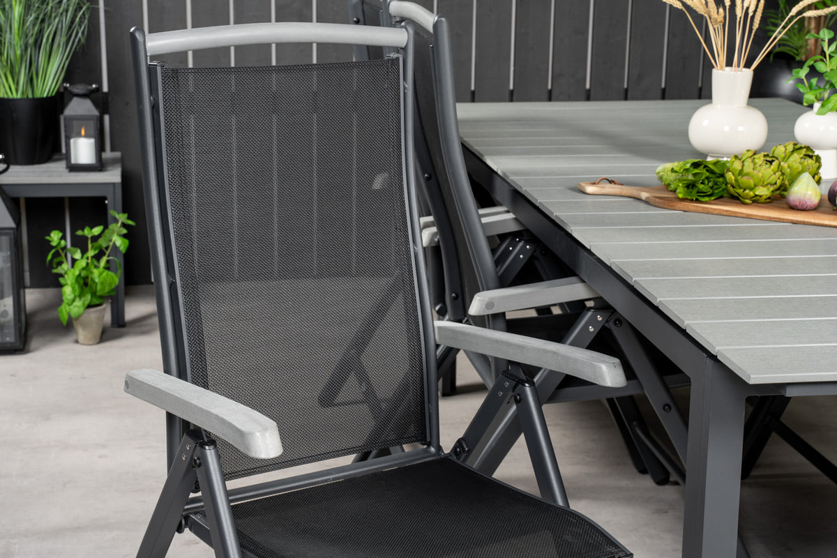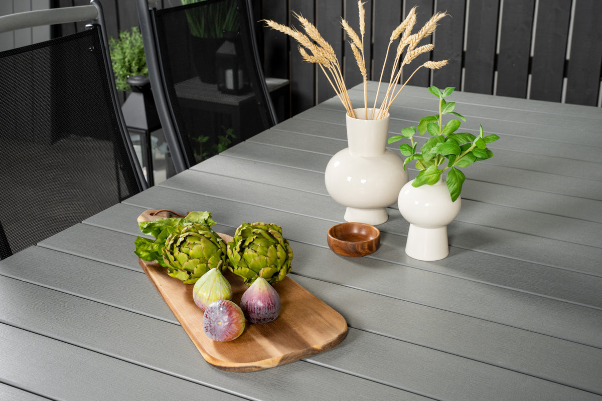Lad denne smukt matchede spisegruppe med moderne følelse blive et naturligt samlingssted på terrassen. Spisestole Albany har god komfort, og spisebord Levels gør, at du slipper for at bekymre dig om, hvorvidt der er plads til alle.