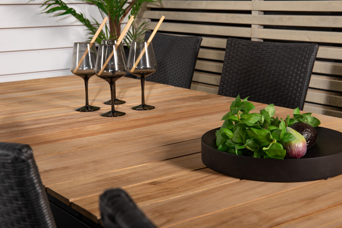 Flot træ i perfekt kombination med elegant sort! Her har vi kombineret vores populære træspisebord Mexico med stilrene sorte spisebordsstole i serien Anna. Forlæng de dejlige sommeraftener og inviter nære og kære til en festmiddag i denne moderne spisegruppe!