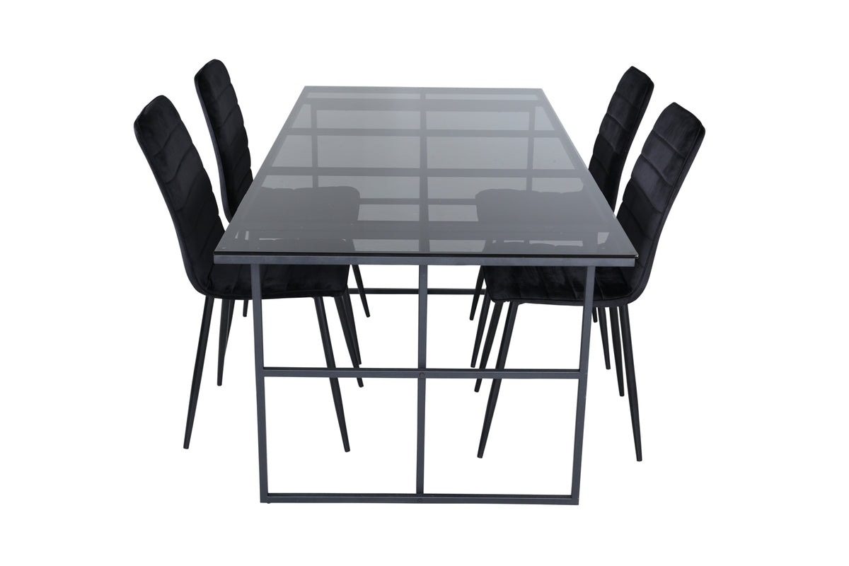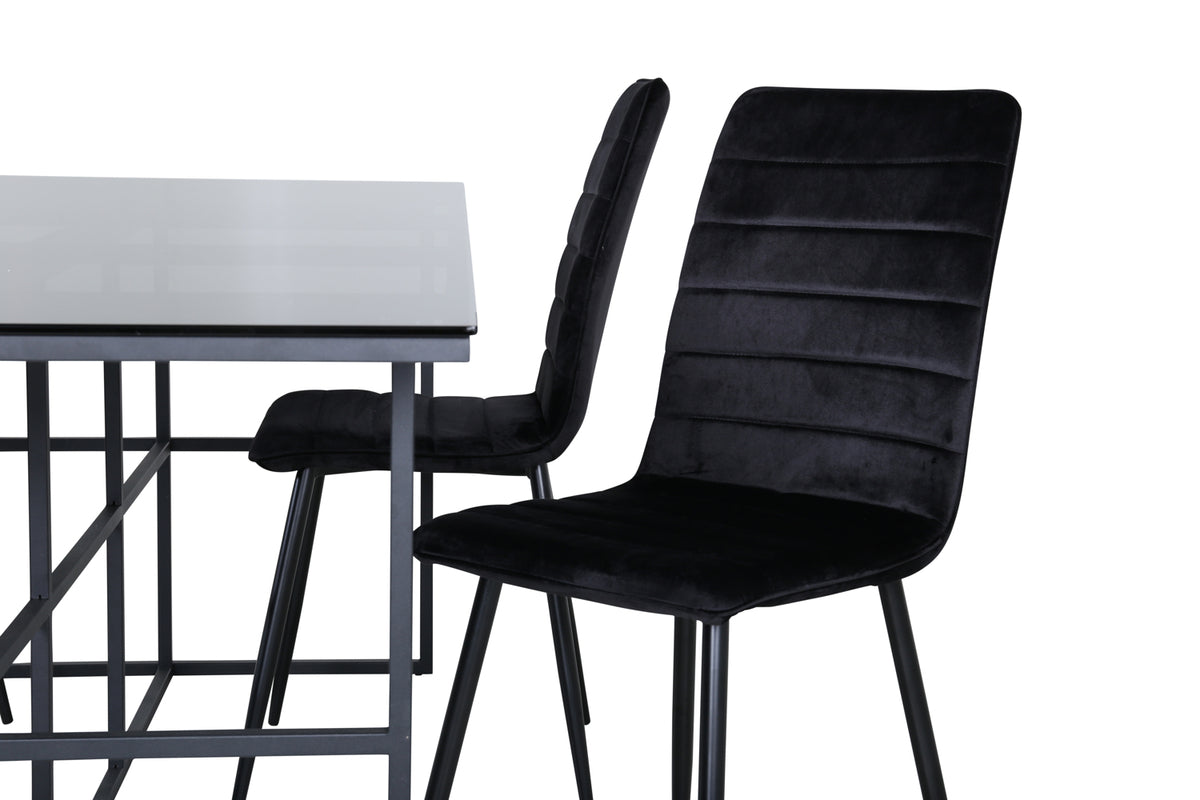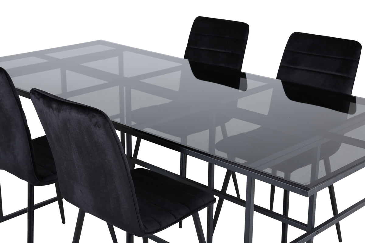 En spisegruppe med stil og finesse - lige så iøjnefaldende som praktisk! Spisebord Leif har et iøjnefaldende design med en elegant bordplade i røget sort glas og stel i sort metal - inspireret af de industrielle vægge, der klatrer på trendlisterne. Bordets mål: Længde: 200cm, Bredde: 90cm, Højde: 74cm. Her sammen med 4 stk. Windu Lyx spisebordsstole med sorte stoleben i jern og sorte sæder i blødt velourstof. Stolens mål: Højde: 94cm, Siddehøjde: 47cm, Bredde: 43cm, Dybde: 49cm. Sid behageligt og nyd dagens alle måltider!