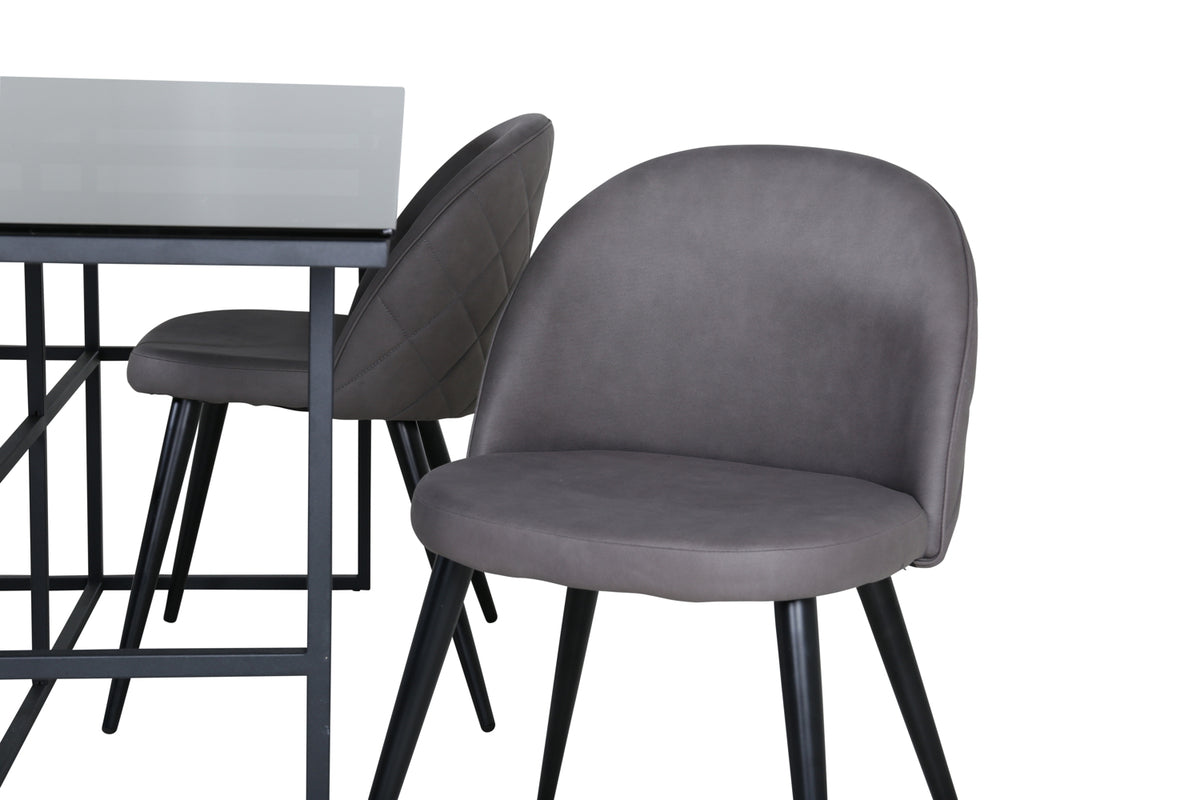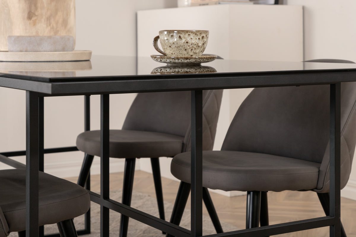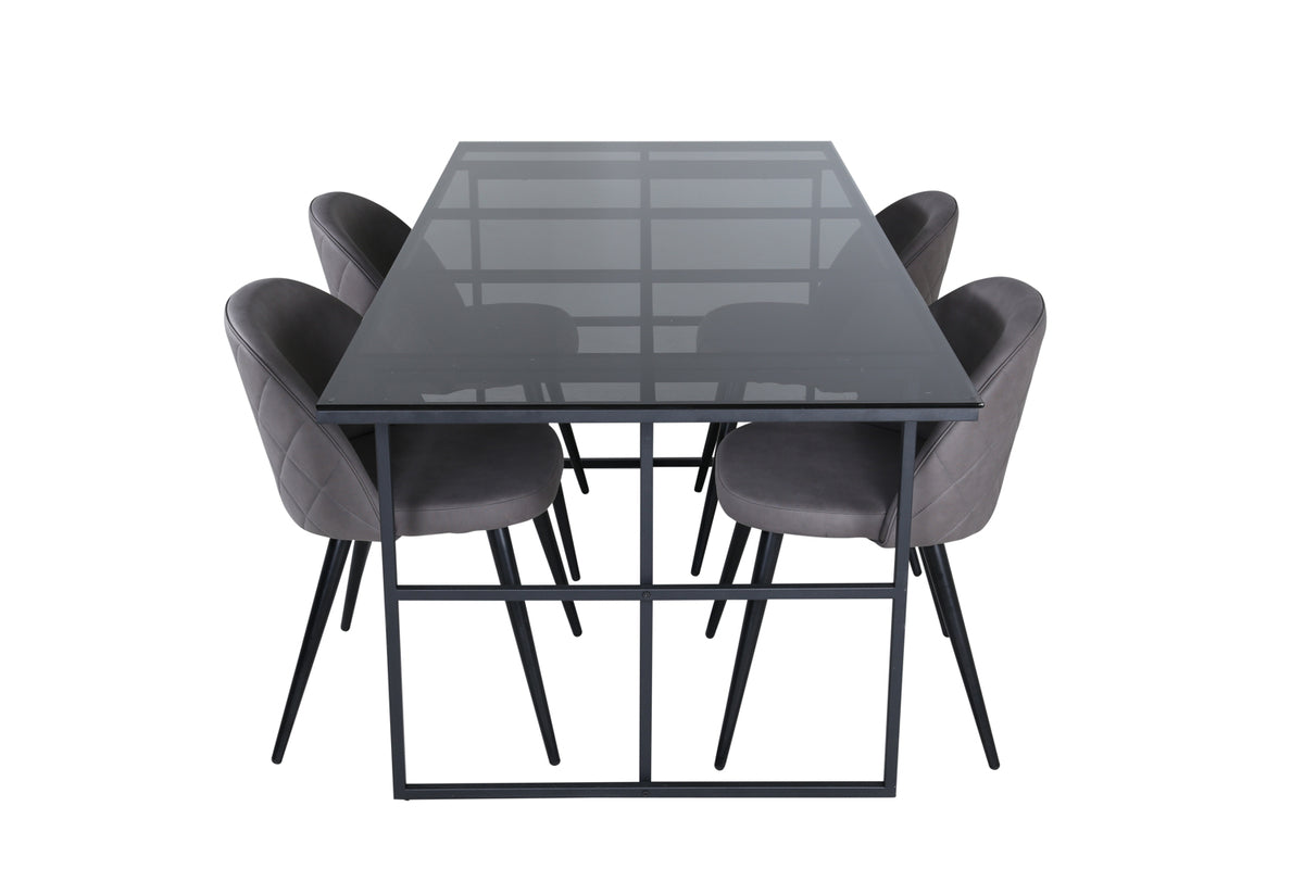 Indret stuen moderne og stilsikkert! Spisebord Leif har et iøjnefaldende design med en elegant bordplade i røget sort glas og stel i sort metal - inspireret af de industrielle vægge, der klatrer på trendlisterne. Bordets mål: Længde: 200cm, Bredde: 90cm, Højde: 74cm. Matches med 4 stk. Velvet Stitches spisebordsstole med grå sæder i mikrofiber med dekorsøm og sorte stoleben i jern. Stolens mål: Højde: 76,5cm, Siddehøjde: 46,5cm, Bredde: 50cm, Dybde: 57cm. Invitér til mange hyggelige måltider fremover!