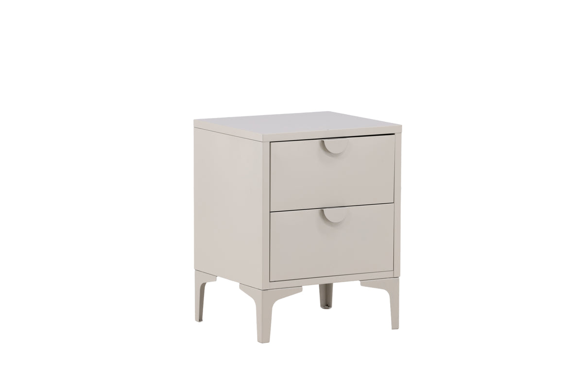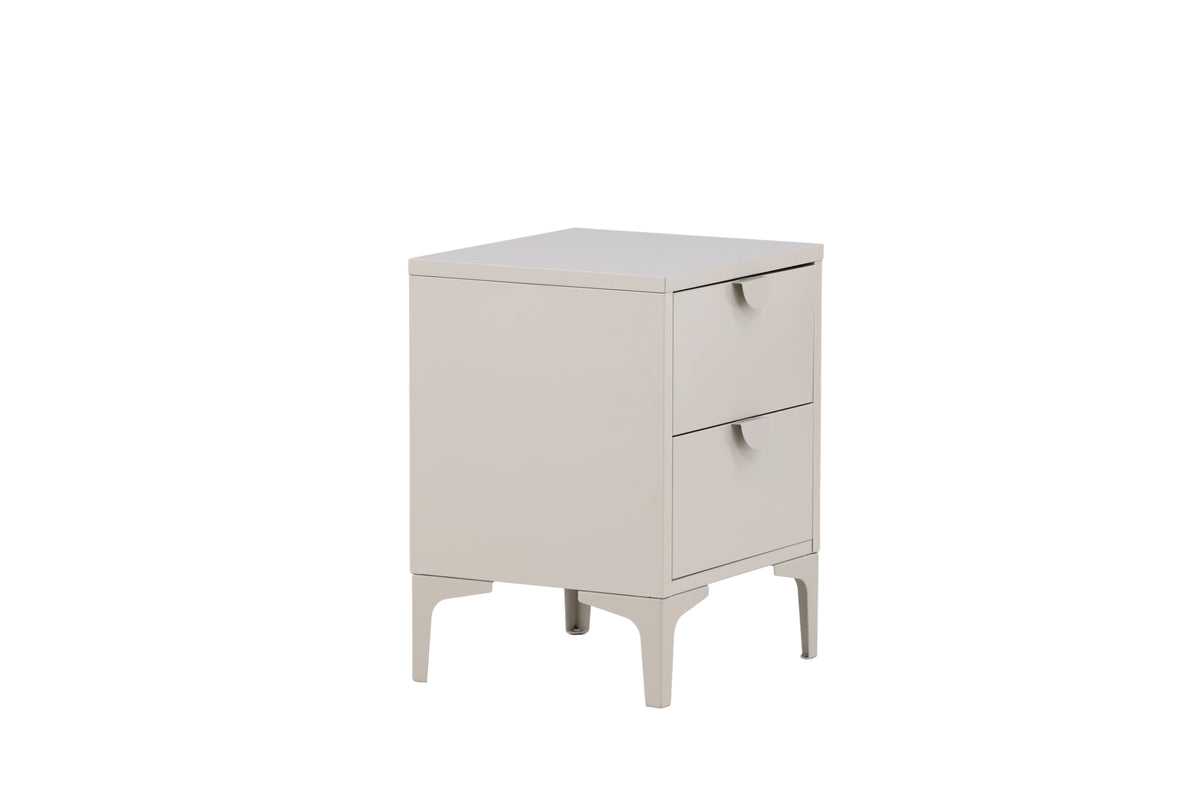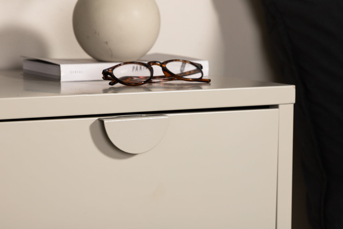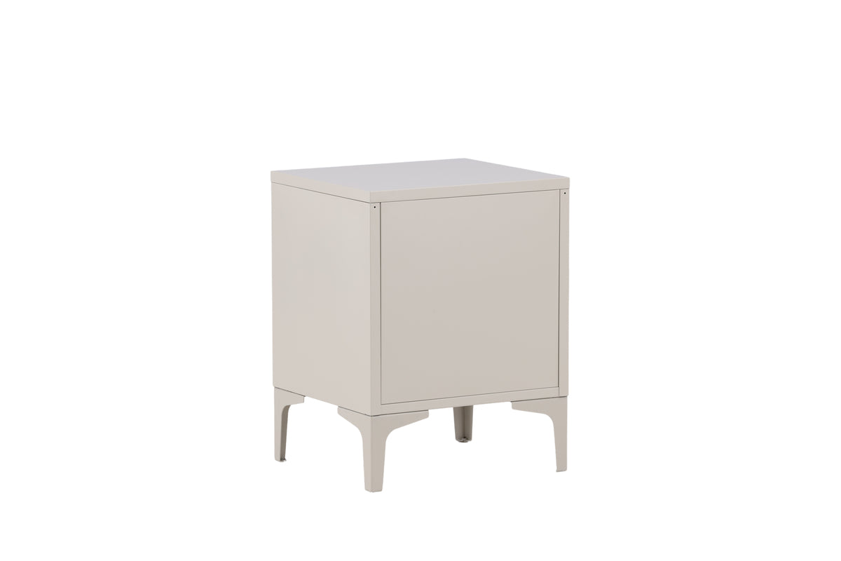 Sengebordet i serien Piring er perfekt som opbevaringsløsning! Det kvadratiske sidebord i beige stål har to skuffer til skjult opbevaring og en stilren overside med passende plads til en sengelampe, en god bog og eventuel pyntelig indretningsdetalje for et moderne look. Sengebordet løftes op af fire ben, som giver en luftigere følelse, og det lige design gør bordet let at placere og nemt at matche. Se vores billeder for inspiration!