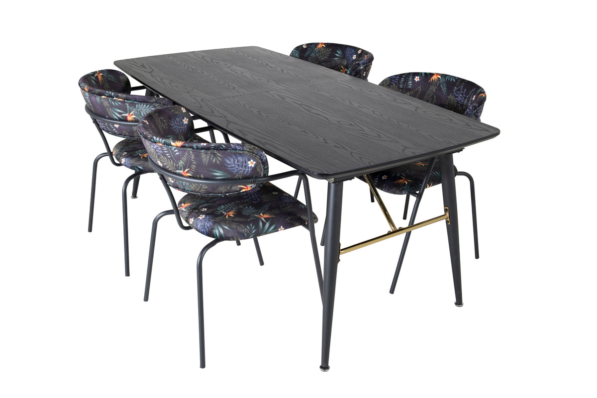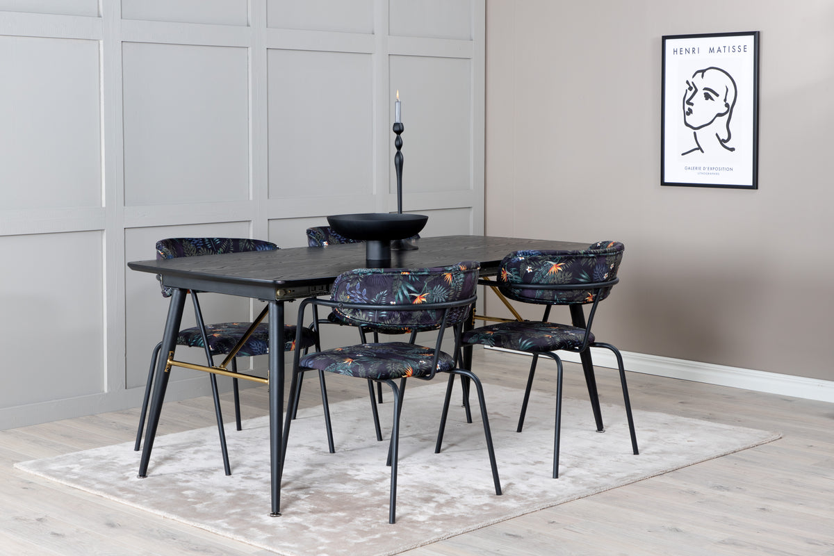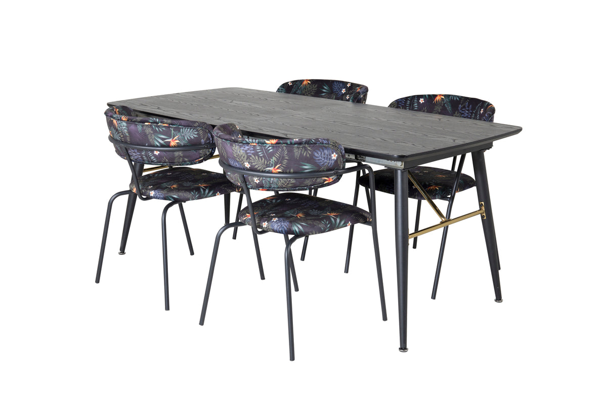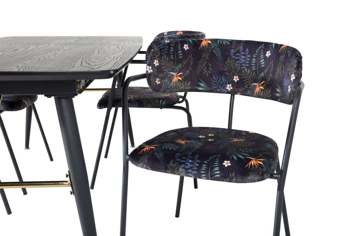 Trendy og hjemligt! Spisebordet Gold har luksuriøse gulddetaljer i bunden og er udtrækkeligt, og sammen med Arrow's sorte spiseborde i blomsterprint, er spisegruppen lavet til dem, der ønsker at skabe en hyggelig og moderne stemning i hjemmet.