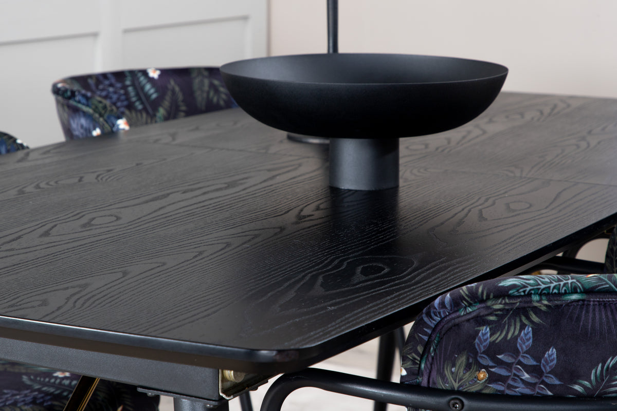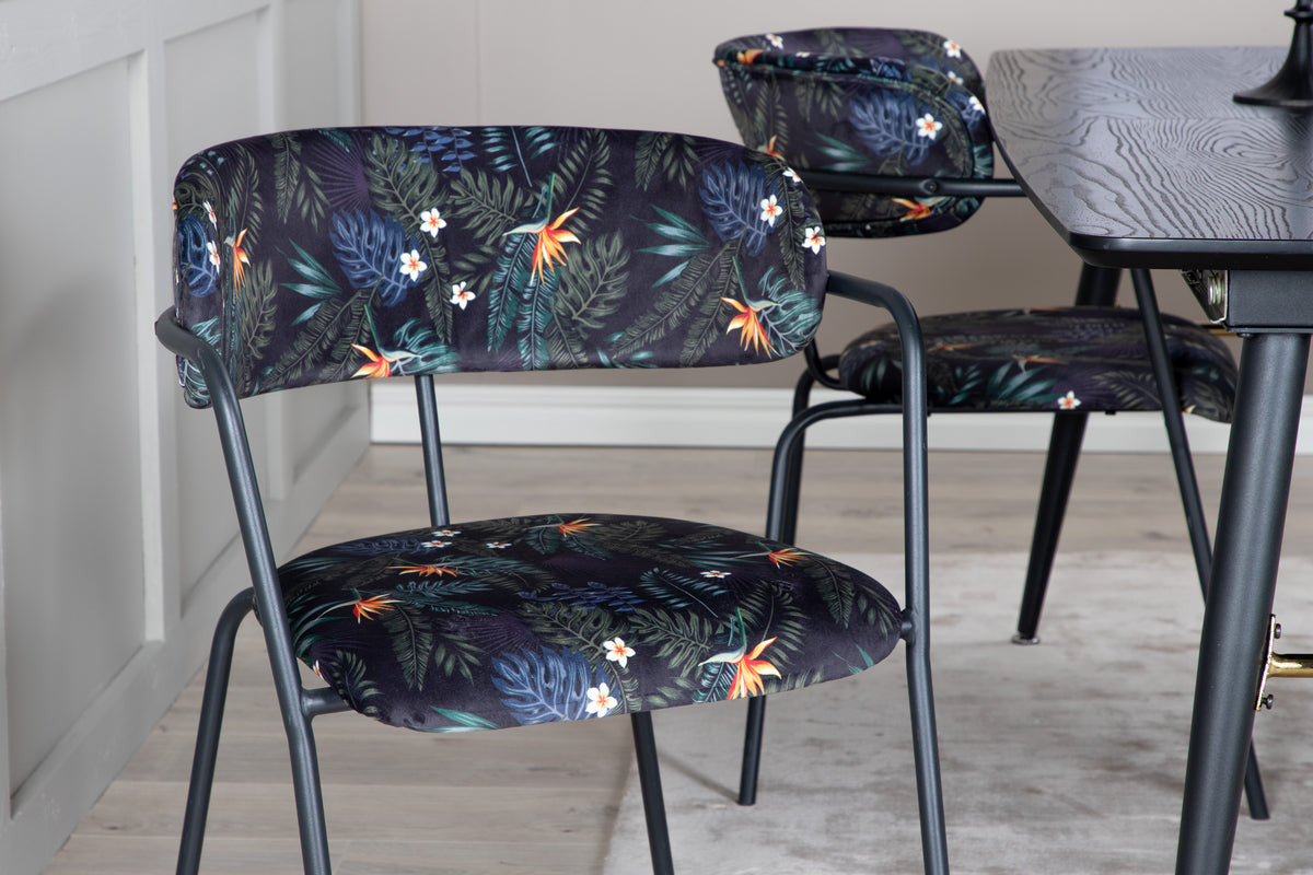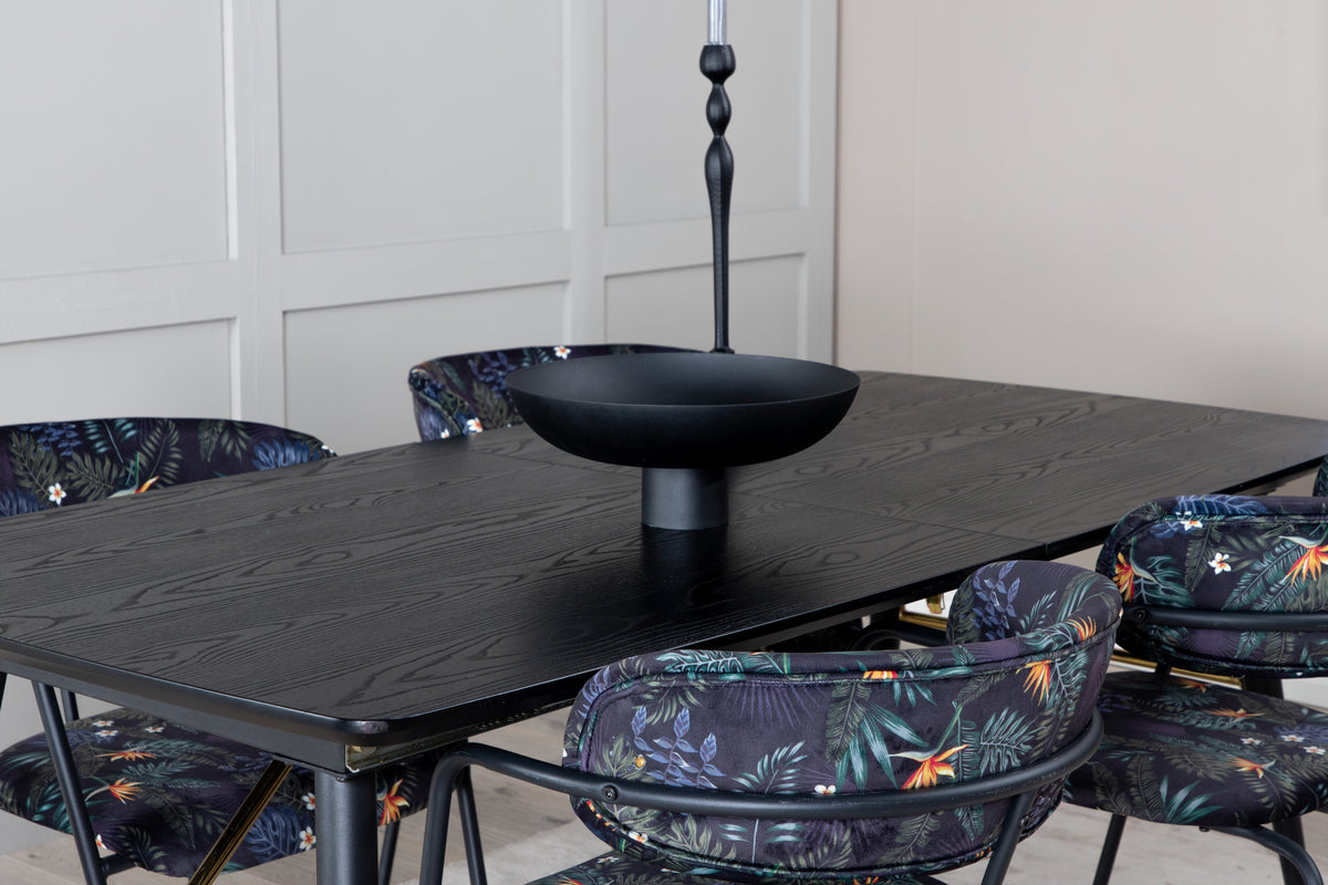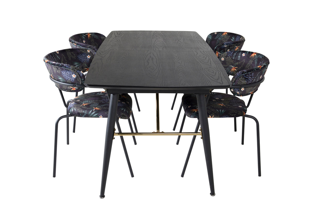 Trendy og hjemligt! Spisebordet Gold har luksuriøse gulddetaljer i bunden og er udtrækkeligt, og sammen med Arrow's sorte spiseborde i blomsterprint, er spisegruppen lavet til dem, der ønsker at skabe en hyggelig og moderne stemning i hjemmet.