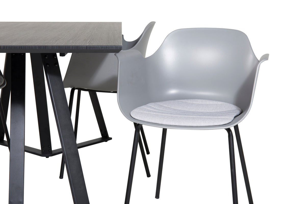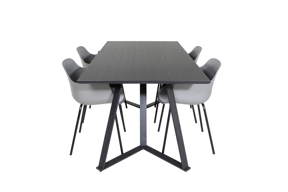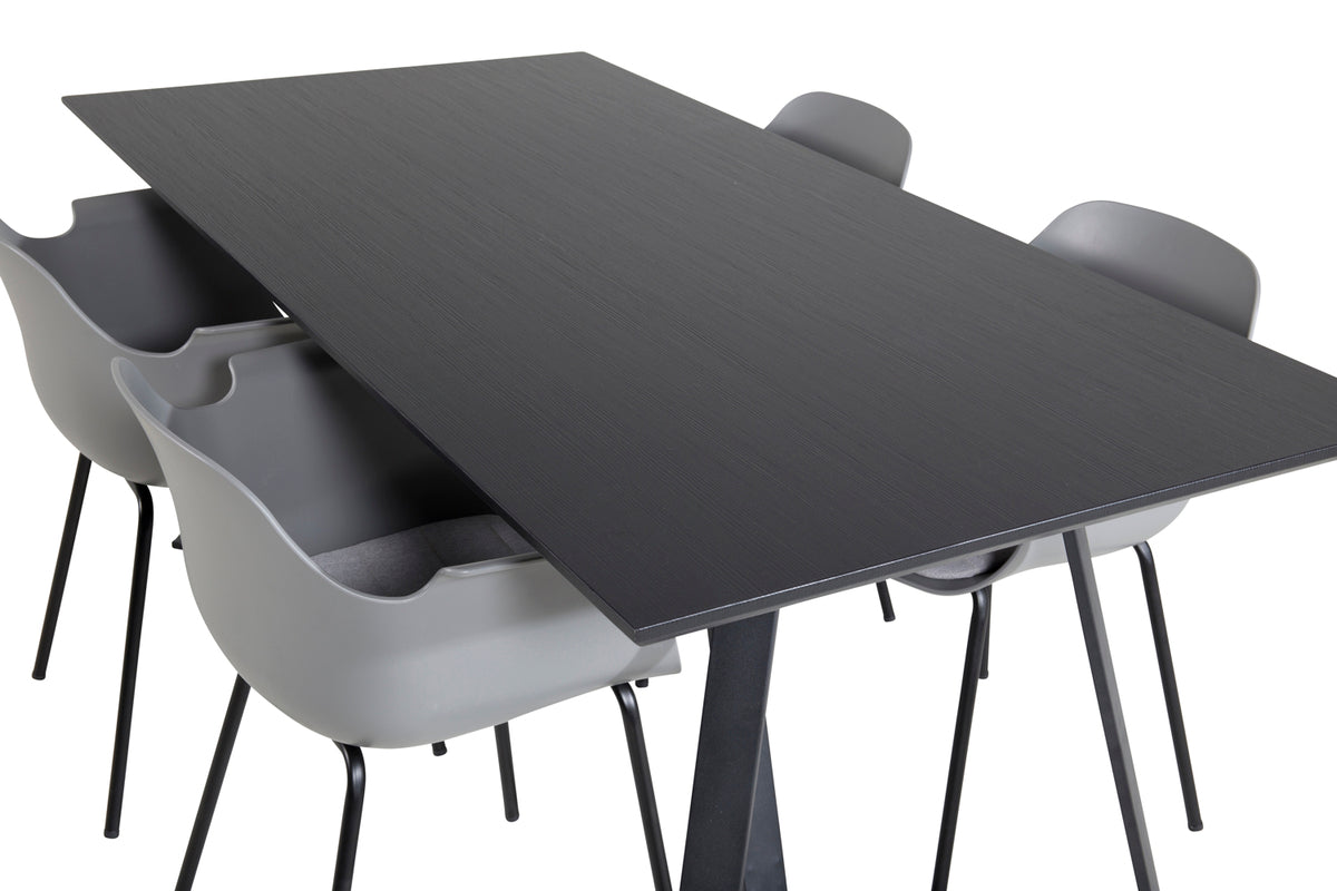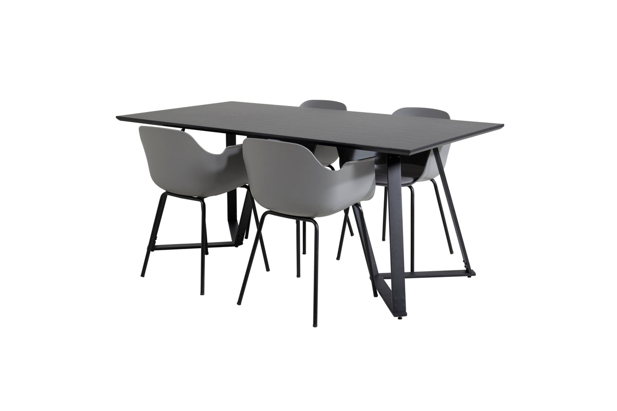 Stilfuldt spisebord Marina med en MDF bordplade og en dekorativ metalunderkonstruktion er her kombineret med rammesstole i Comfort-serien i et trendy design. Lad hjemmets hjerte blive præget af din nye iøjnefaldende spisegruppe!