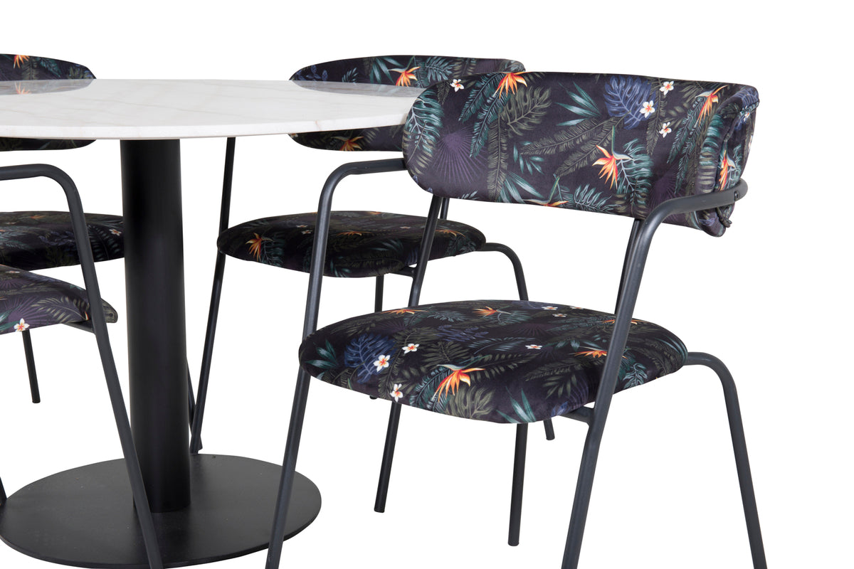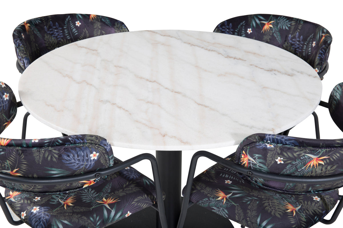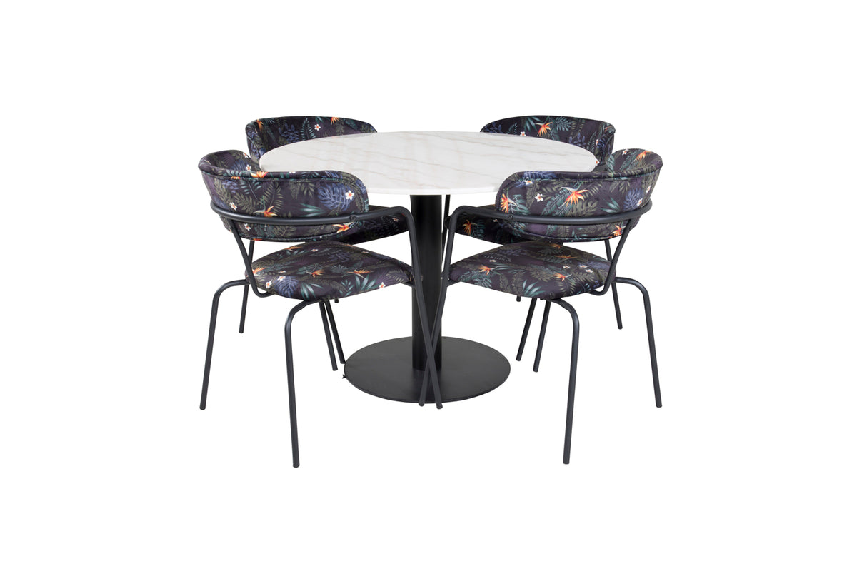 Spisebord Estelle i smuk marmor sammen med komfortable sorte blomster-mønstrede spisebordsstole i Arrow serien - den perfekte kombination for dem, der ønsker en trendy spisegruppe!