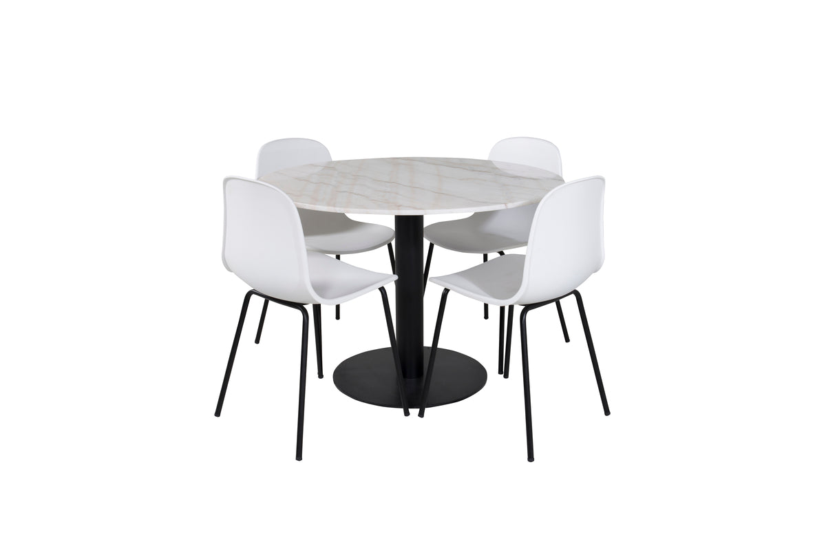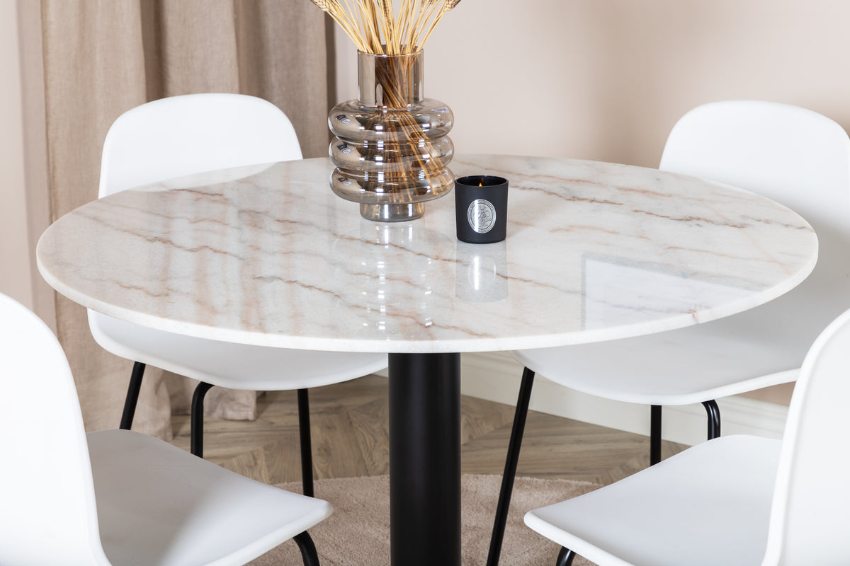 Vores moderne marmorlignende spisebord Estelle sammen med klassiske spisebordsstole i Arctic serien. Her får du en spisegruppe, der direkte indgyder luksus og elegance.