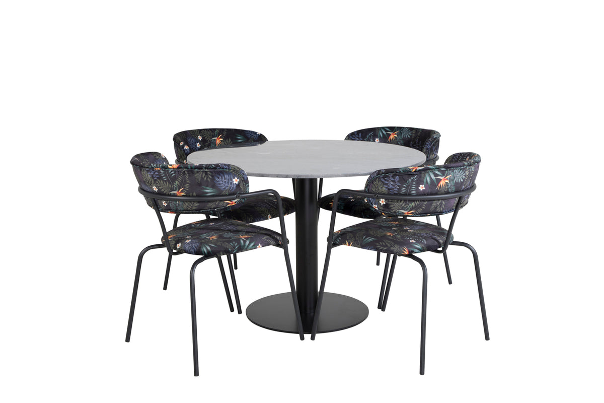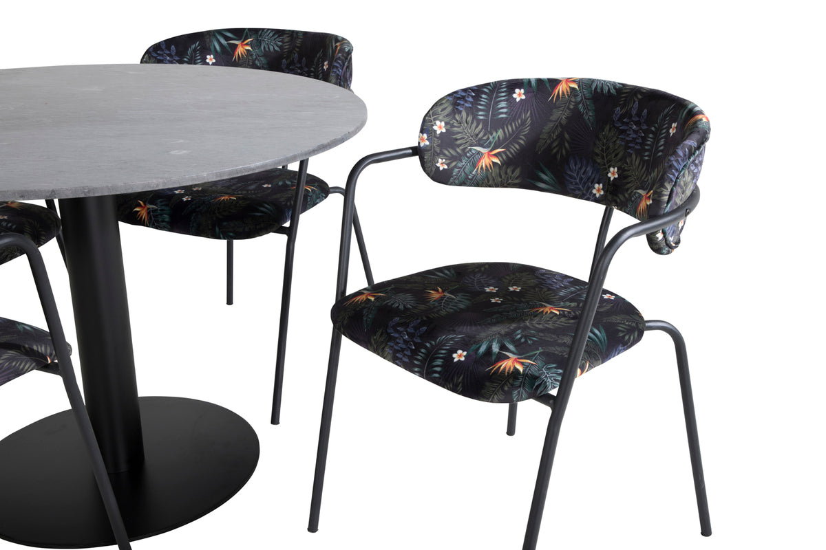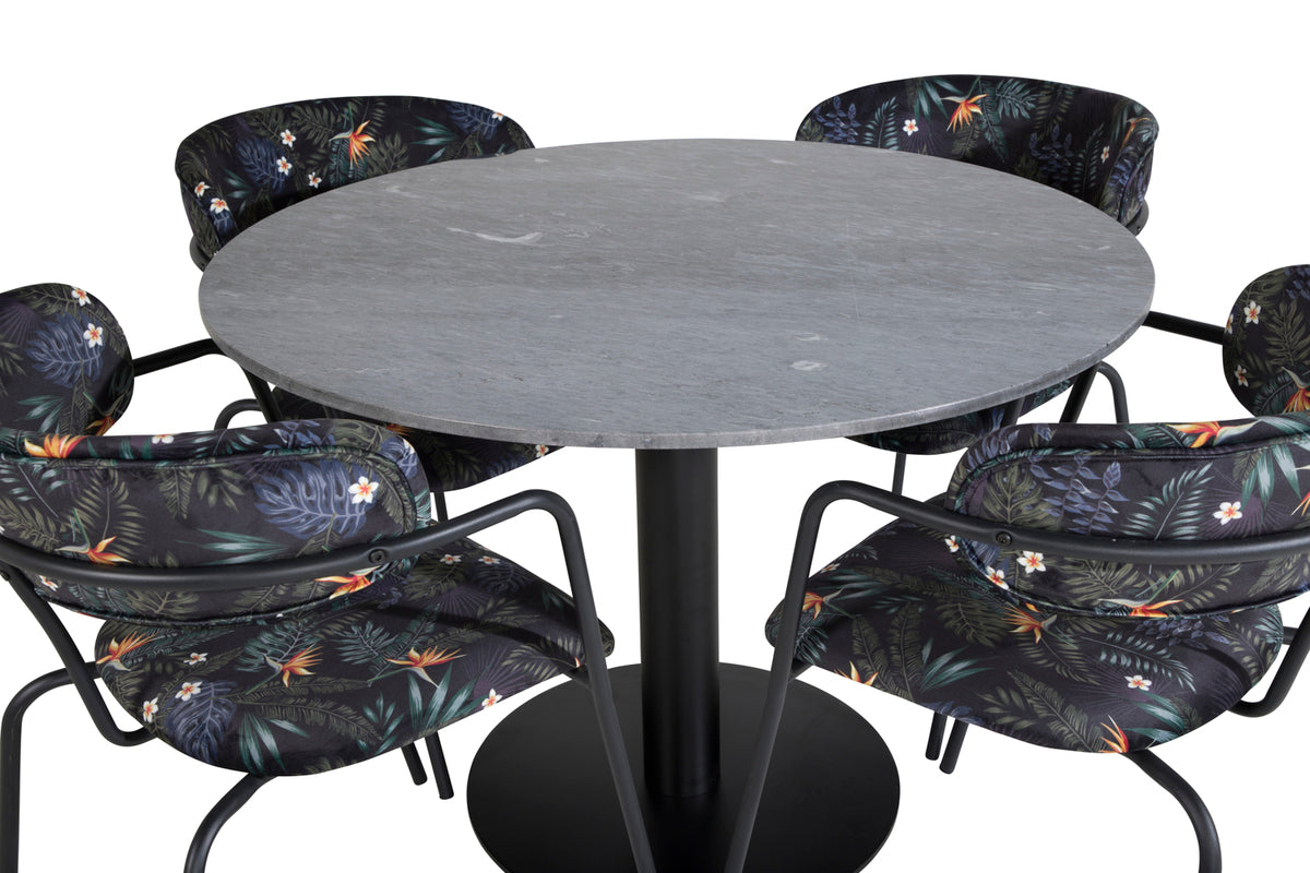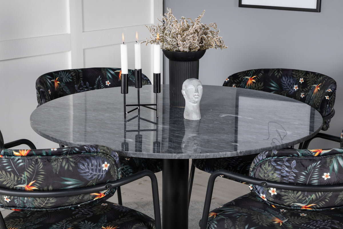 Spisebordet Estelle i smuk marmor, sammen med komfortable sorte blomster-mønstrede spisebordsstole i Arrow-serien - her får du en spisegruppe, du vil længes efter!