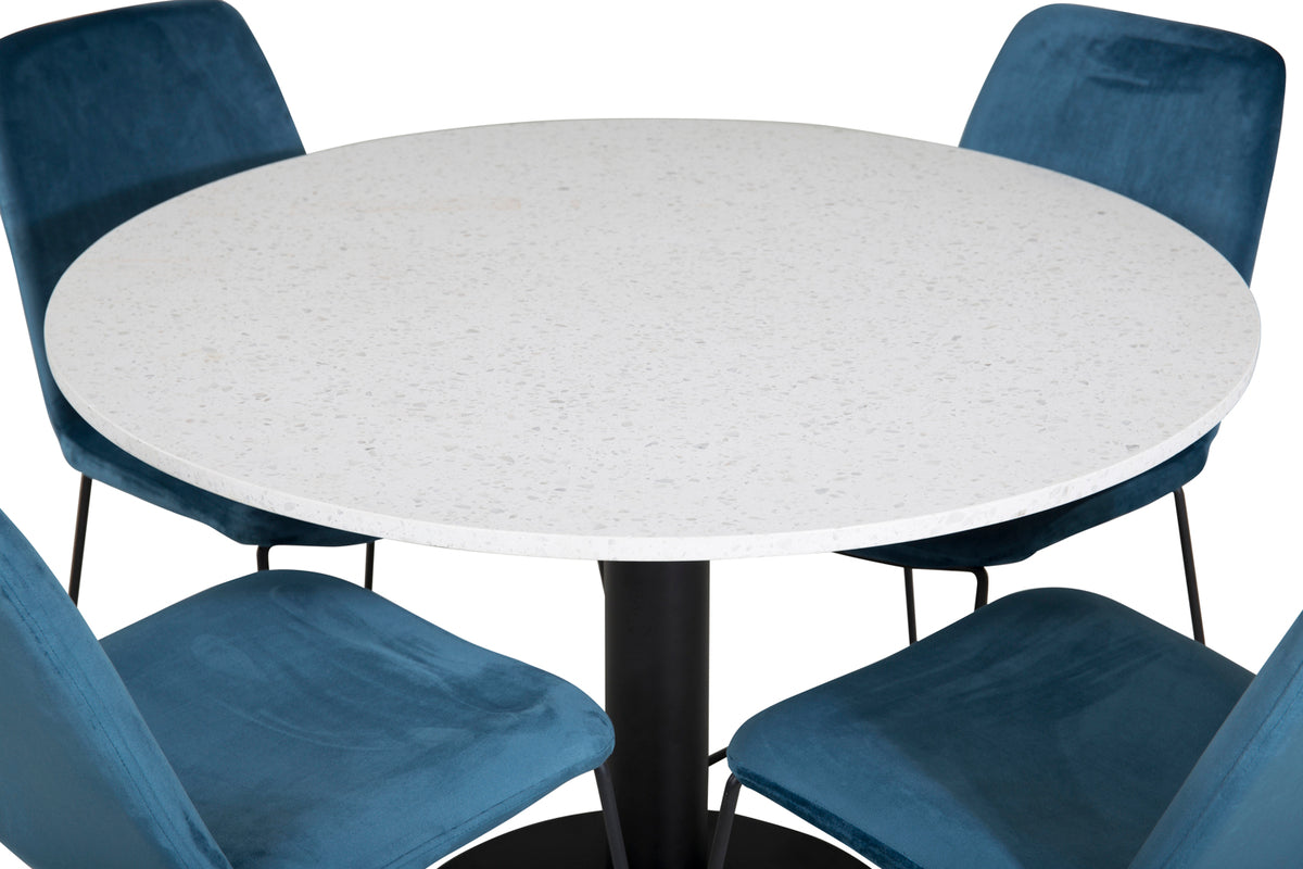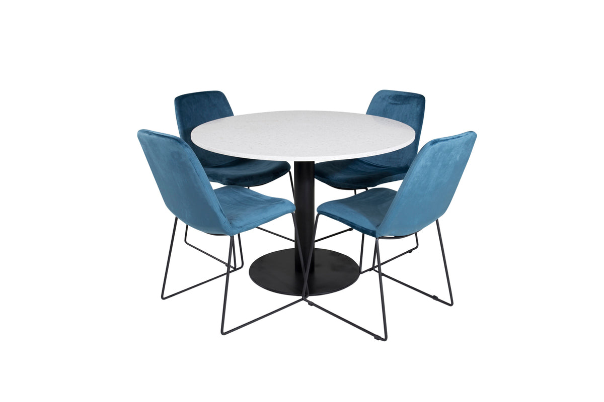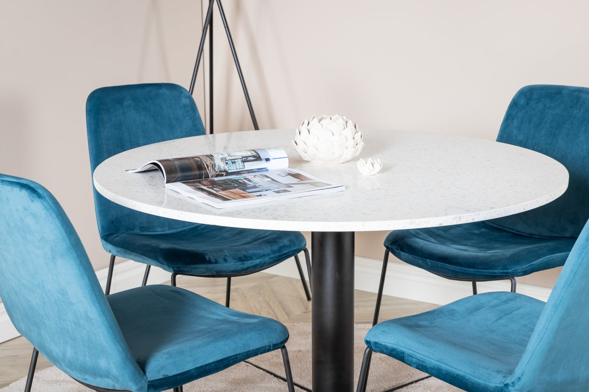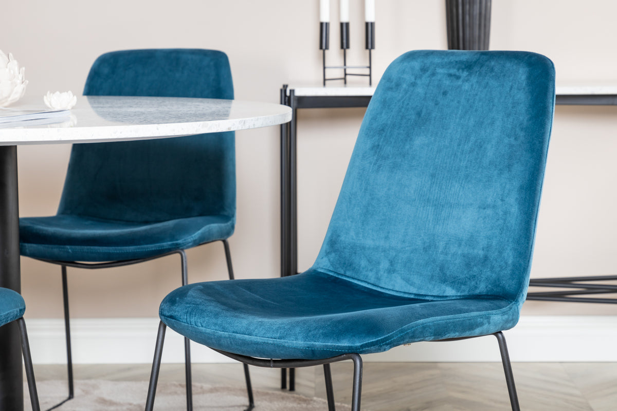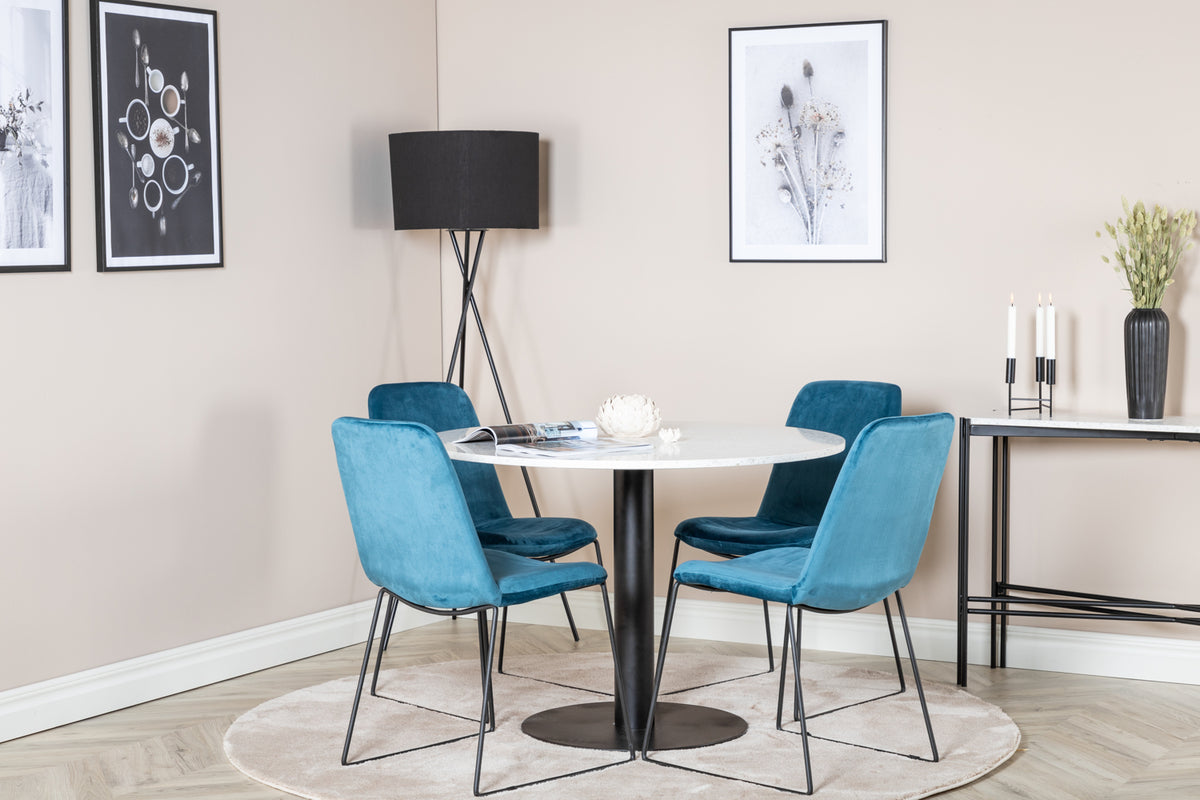 Wow! Vores trendy og dejlige spisebordsstole Muce i blå velour er her matchet med vores runde spisebord Razzia. Kombinationen er lavet til dem, der ønsker en spisegruppe at længes efter!