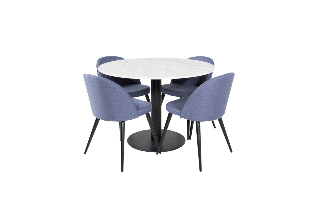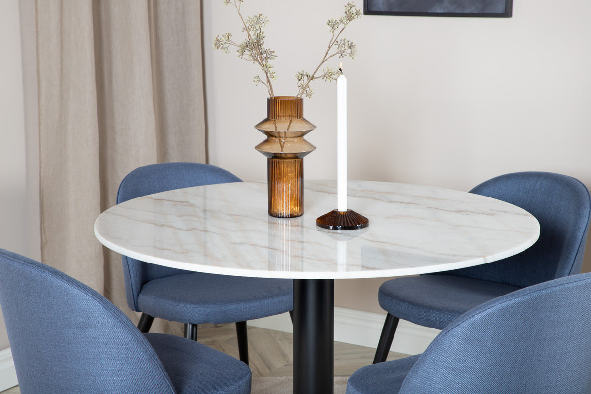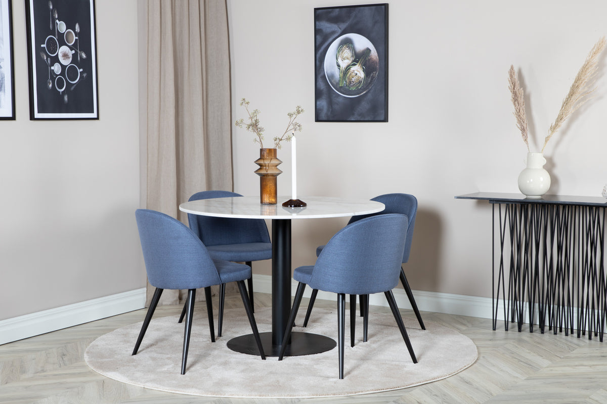 Estelle, et moderne rundt spisebord med en smuk marmor bordplade. Bordet er matchet med blå stole i Velvet serien. Spisegruppen er lavet til dem, der ønsker at skabe en hyggelig og moderne følelse i hjemmet.