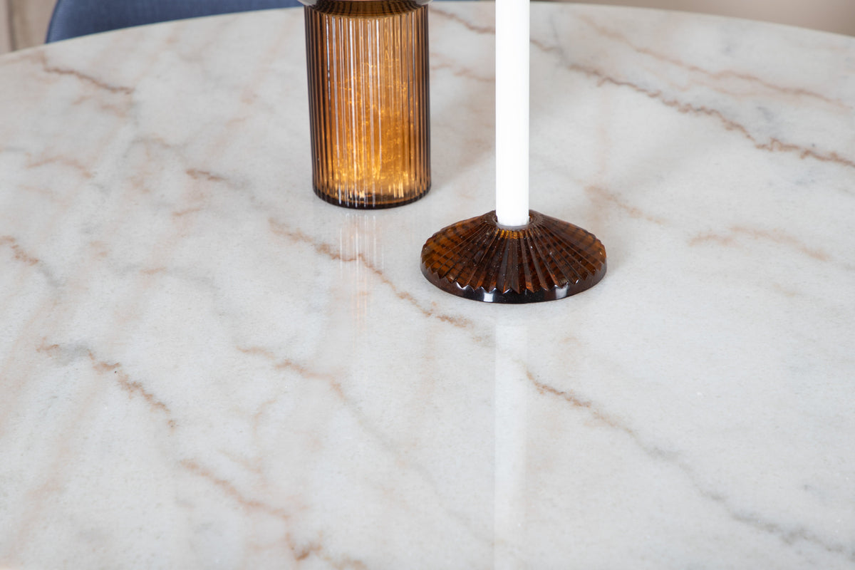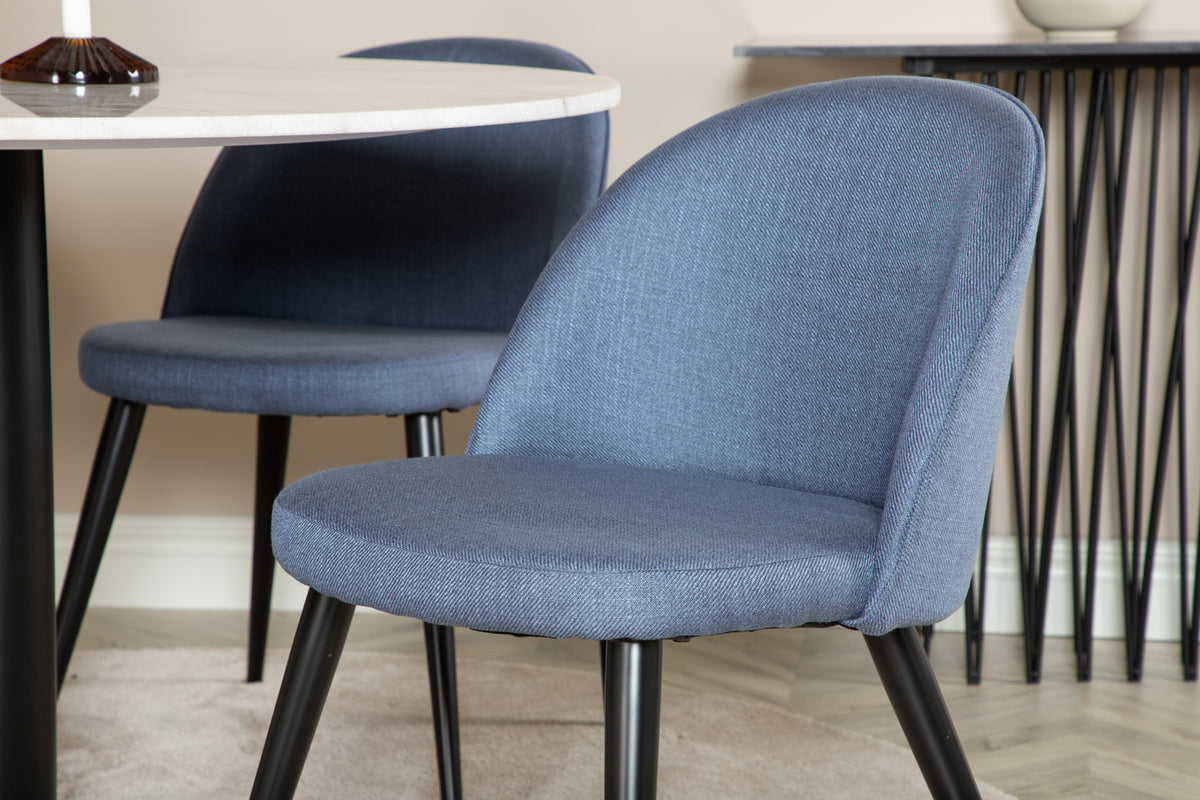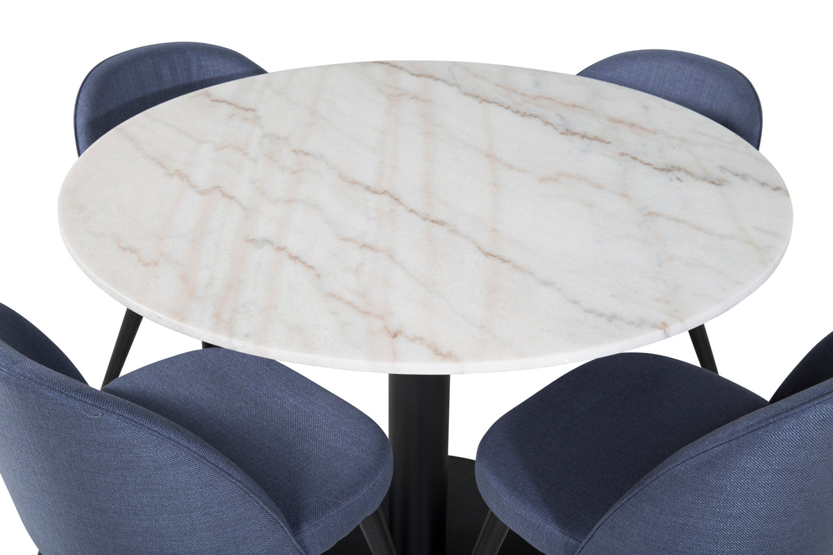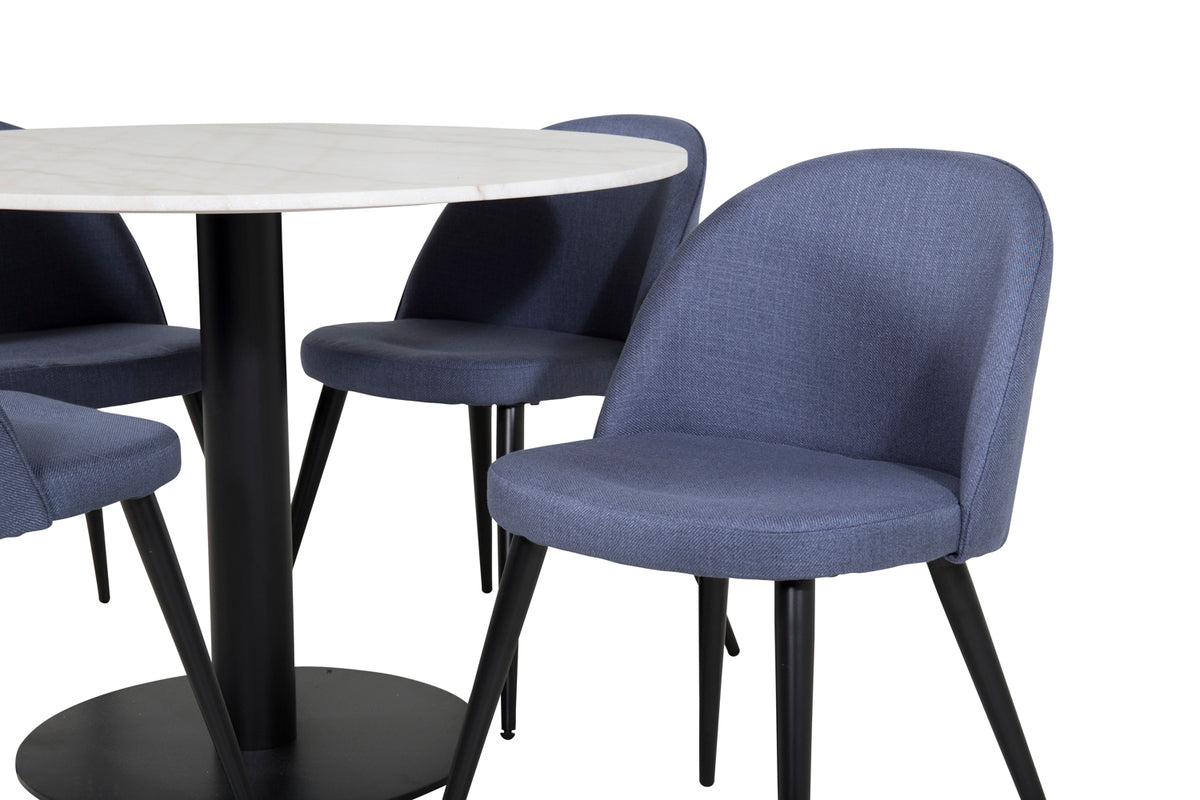 Estelle, et moderne rundt spisebord med en smuk marmor bordplade. Bordet er matchet med blå stole i Velvet serien. Spisegruppen er lavet til dem, der ønsker at skabe en hyggelig og moderne følelse i hjemmet.