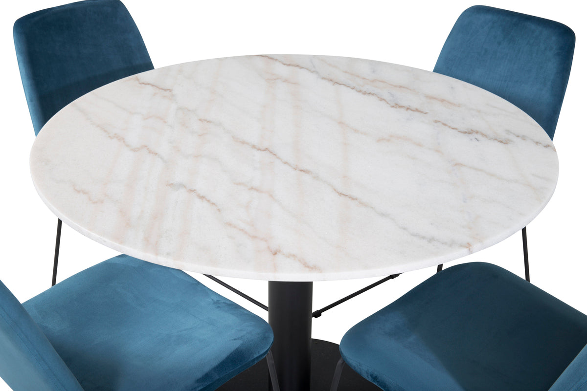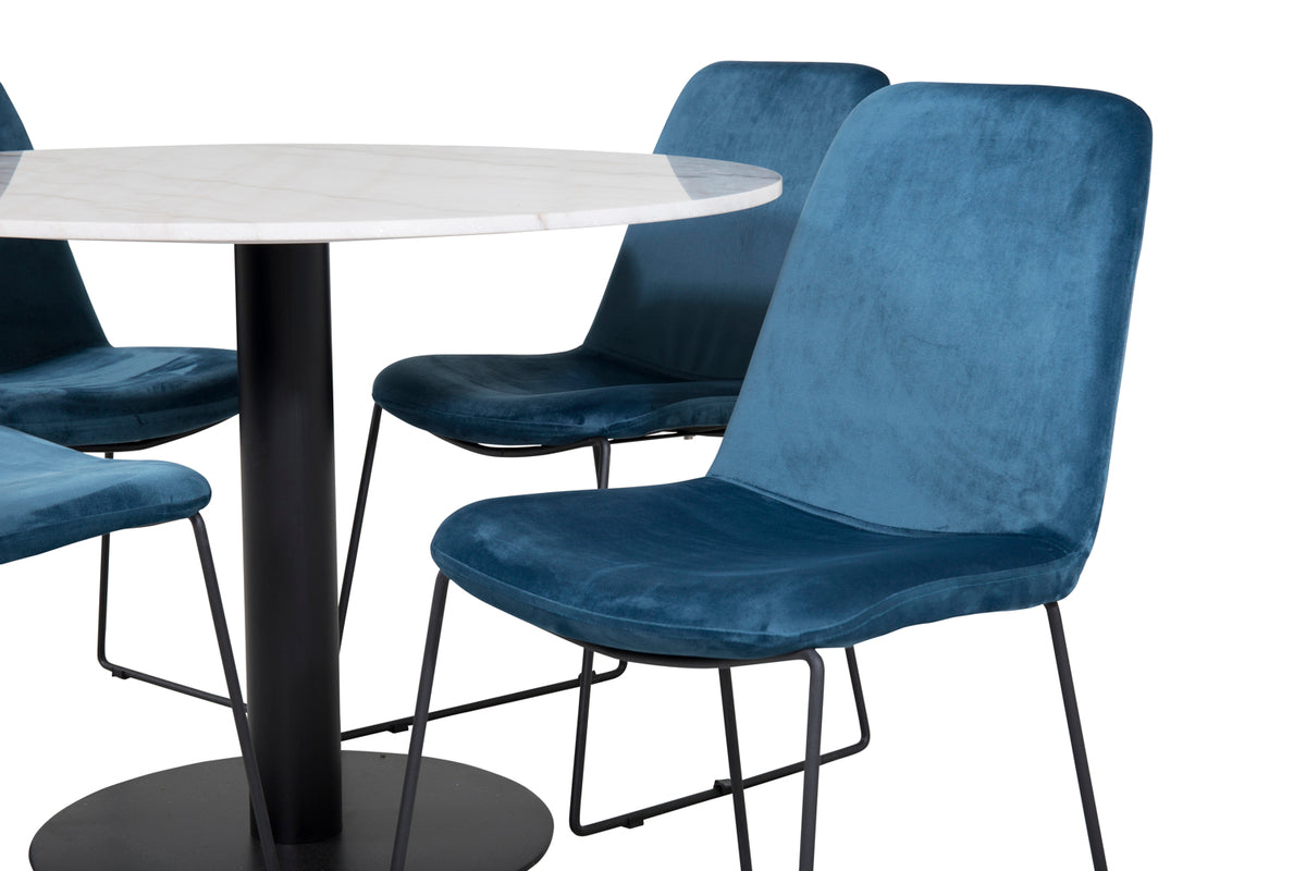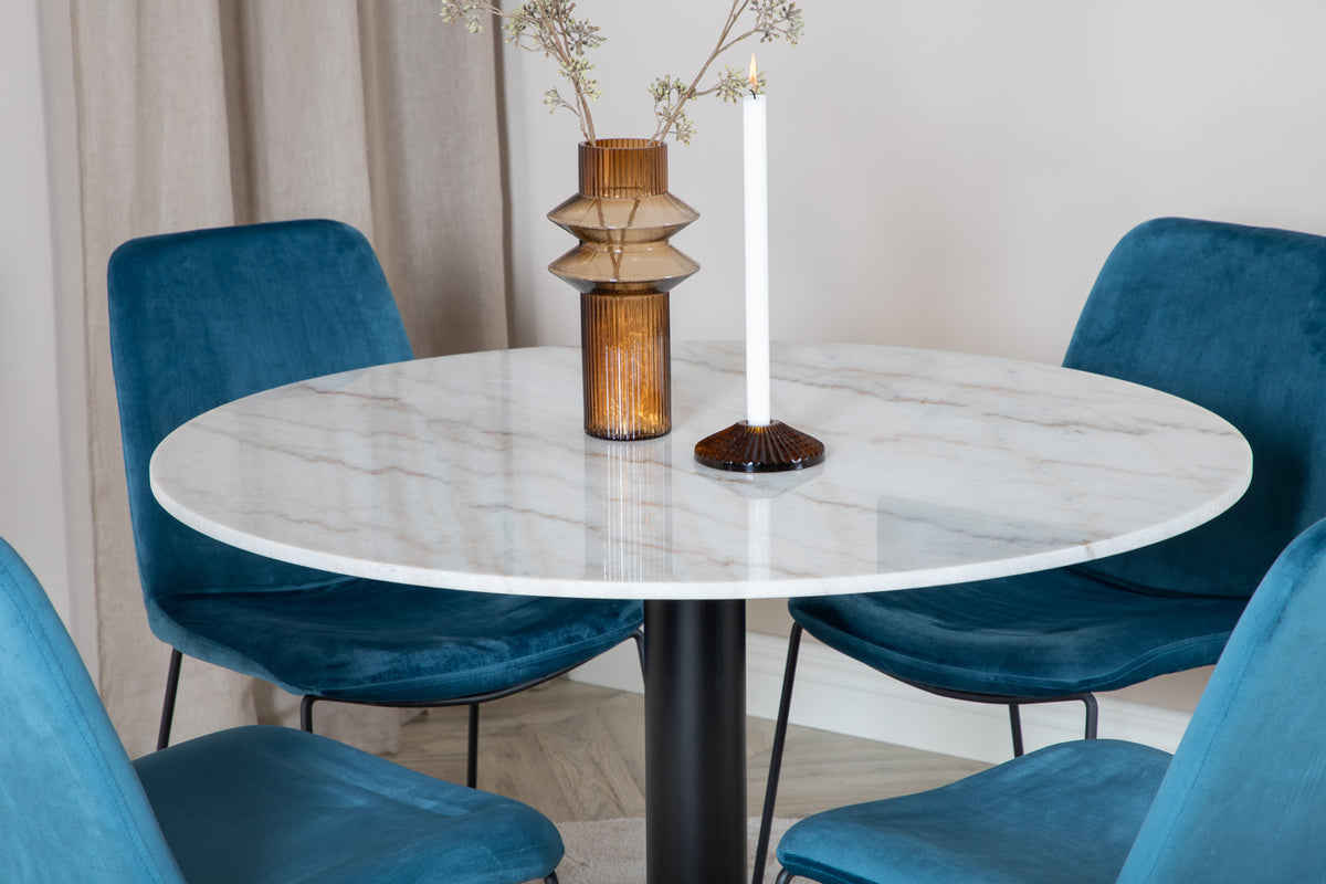 Wow! Vores trendy og dejlige spisestole Muce i blå velour er her matchet med vores runde spisebord Estelle i smuk marmor. Kombinationen er lavet til dem, der ønsker en spisegruppe at længes efter!