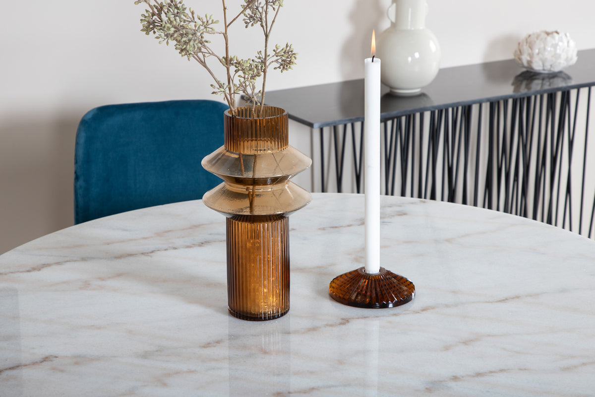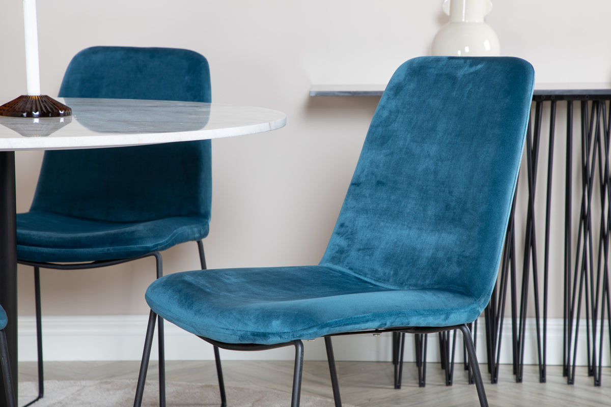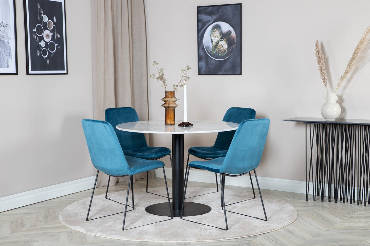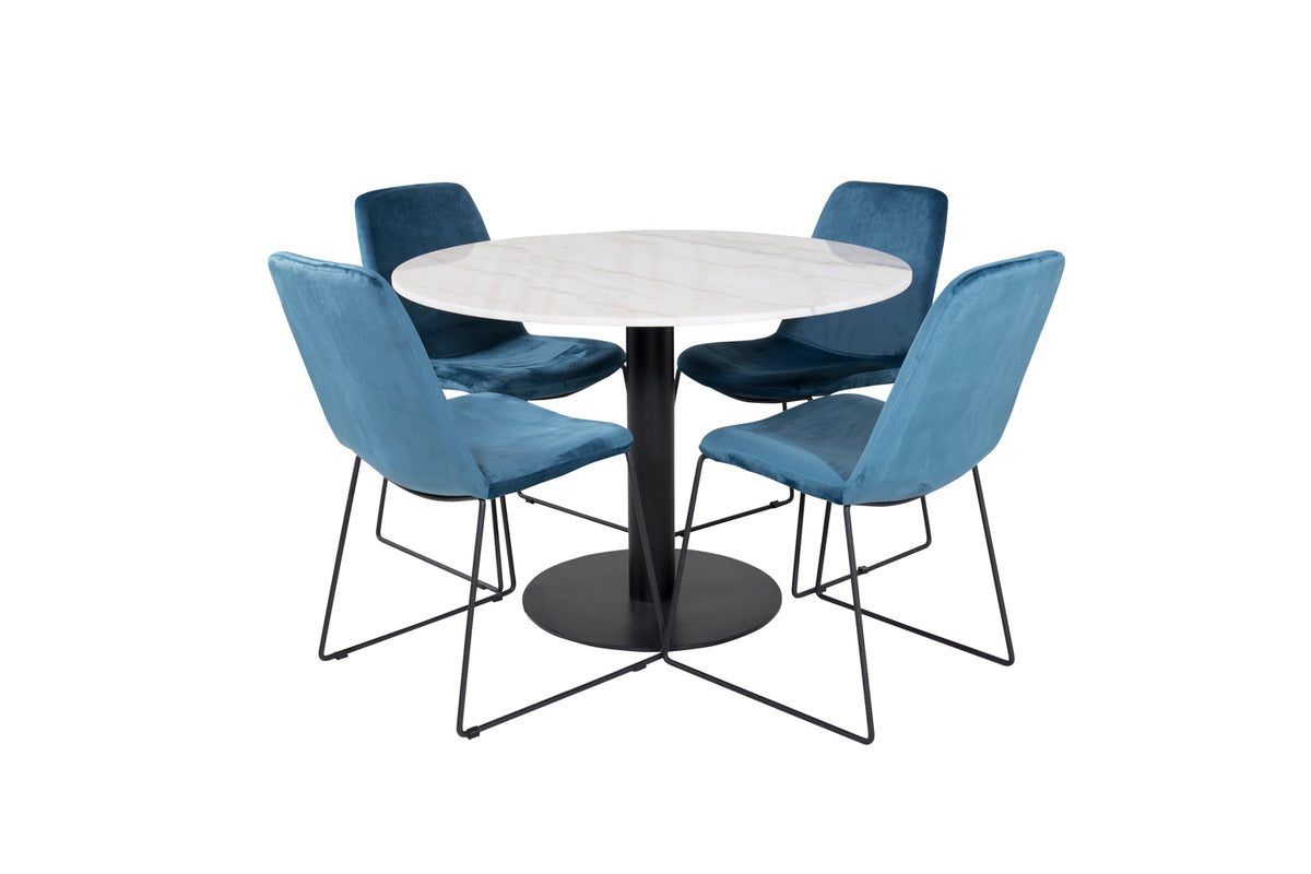 Wow! Vores trendy og dejlige spisestole Muce i blå velour er her matchet med vores runde spisebord Estelle i smuk marmor. Kombinationen er lavet til dem, der ønsker en spisegruppe at længes efter!