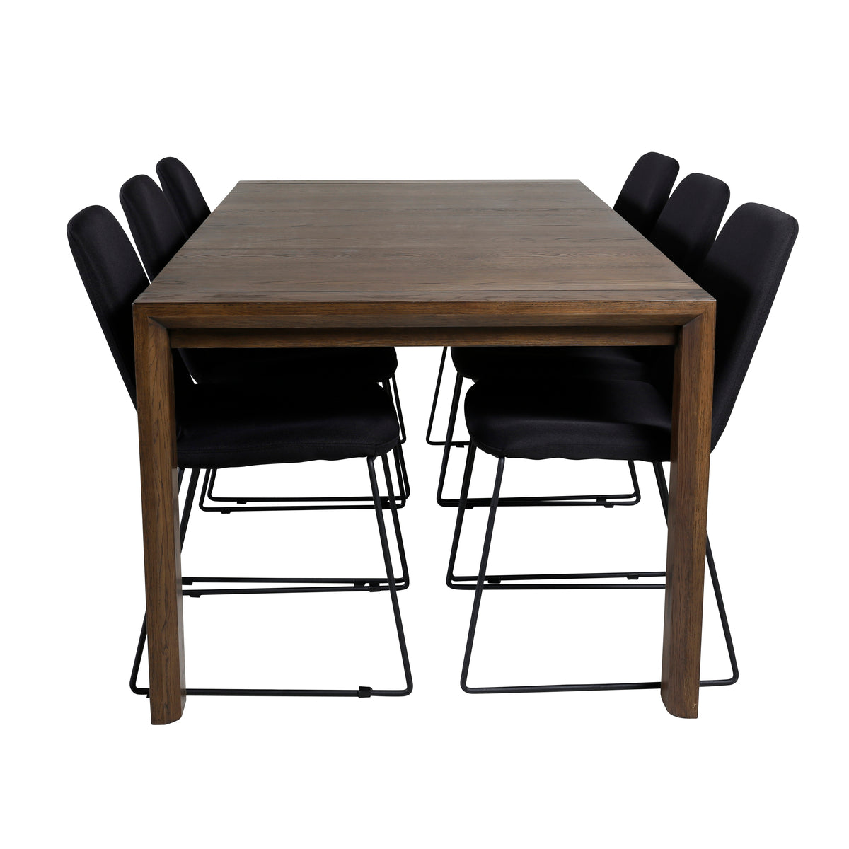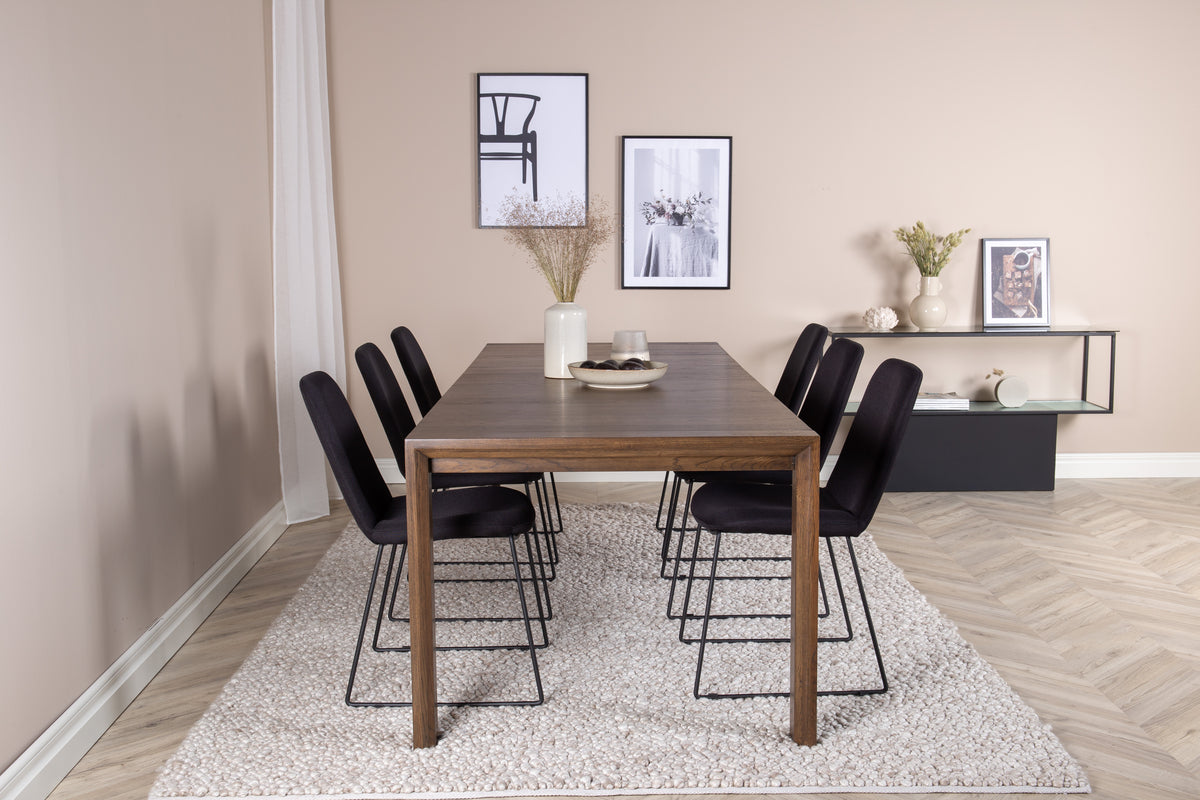 Du behøver ikke at gå på kompromis mellem klassisk og moderne - denne spisegruppe går aldrig af mode! Spisebordet slider i egetrælook imponerer med sin varme, jordnære farve. Bordet kan udvides om nødvendigt, og de lige nordiske former skaber et luftigt og moderne helhedsindtryk i rummet. Her i perfekt kombination med spisestole fra serien Muce. Stolen har et stilfuldt, minimalistisk design i sort farve. Den smalle benstand er i sort pulverlakeret metal. Ryg og sæde er i sort polyesterstof med blød polstring for ekstra komfort. Sid komfortabelt og indret smart!