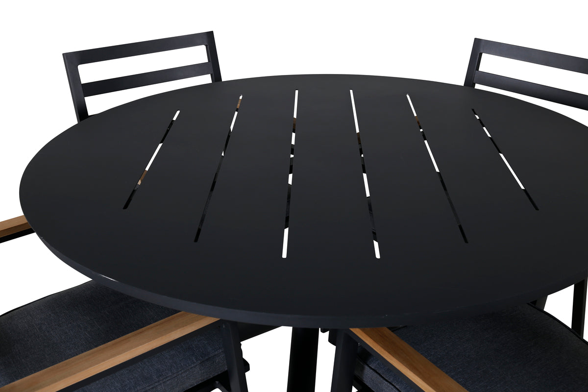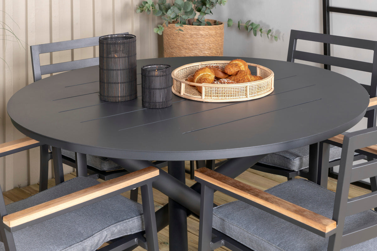 Moderne, praktisk og stilfuld - en spisegruppe, der imponerer med sit gennemtænkte design! Her matcher vi vores runde spisebord Alma i sort aluminium med vores populære spisebordsstole Brasilia. Stolene er i sort aluminium med lækre detaljer i teak, der virkelig hæver det samlede indtryk. Her kan du samle venner og familie til hyggelige måltider denne sommer!