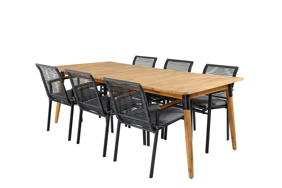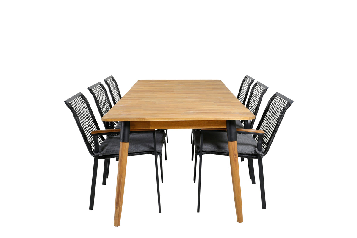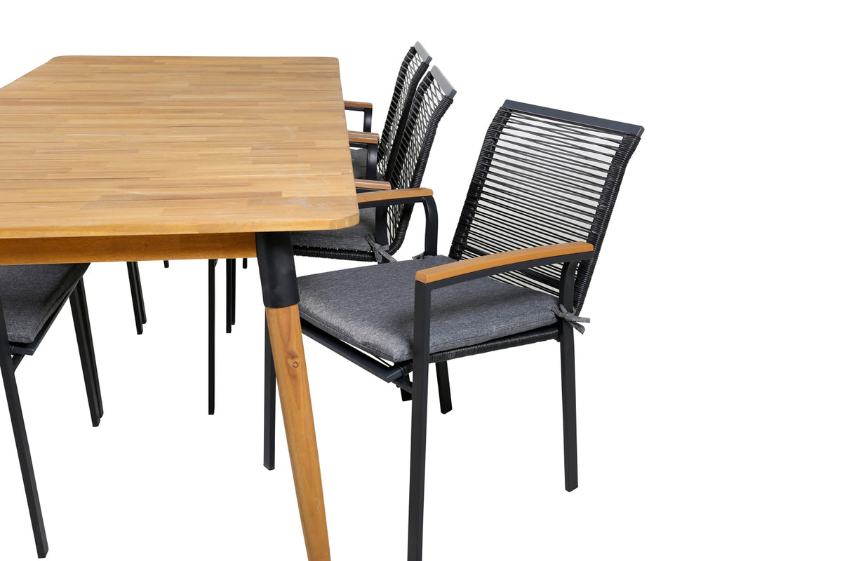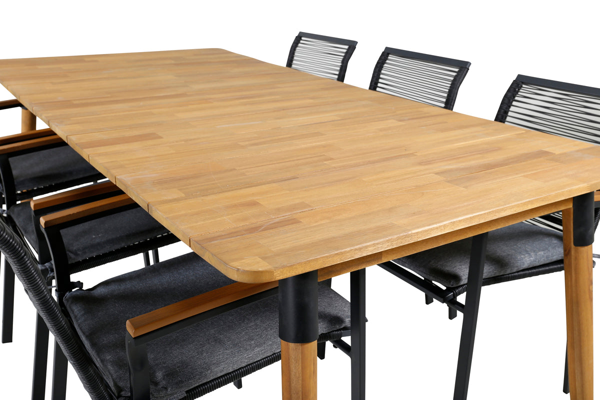 Lækkert, smart og holdbart spisegruppe - perfekt til nattelivet denne sommer! Her er det det træbord Julian, der er kombineret med lækre spisestole Dallas i sort reb. Skab en moderne og luksuriøs stemning i udendørsområdet med denne spisegruppe, der har plads til mange!