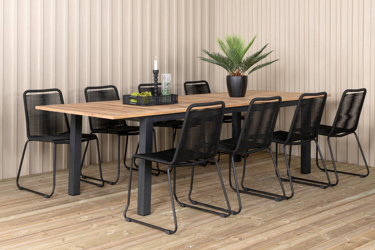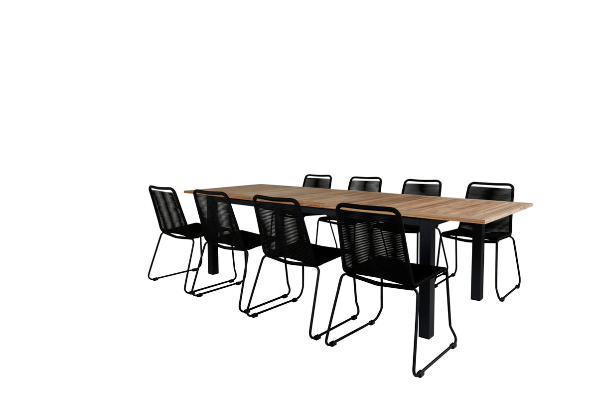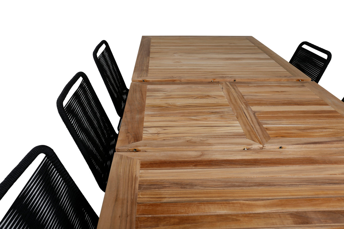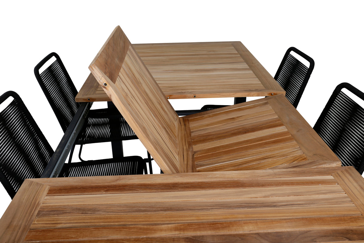 Det forlængelsesbare spisebord Panama i en klassisk stil og dekorativ bordplade i træ. Til bordet medfølger vores populære spisebordsstole Lindos i sort farve, en kombination som skaber en trendy og indbydende følelse til udestuen. Udvid dine middagsinvitationer og slip for at bekymre dig om, at alle skal få plads.