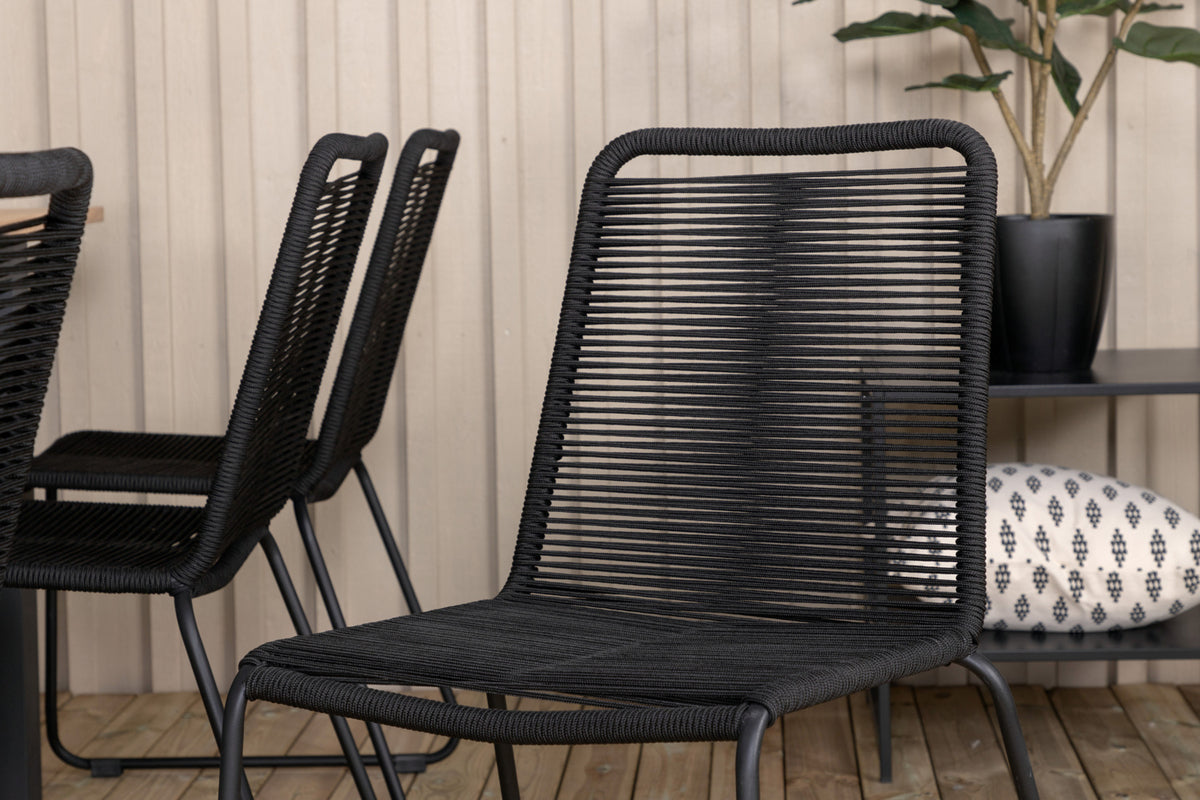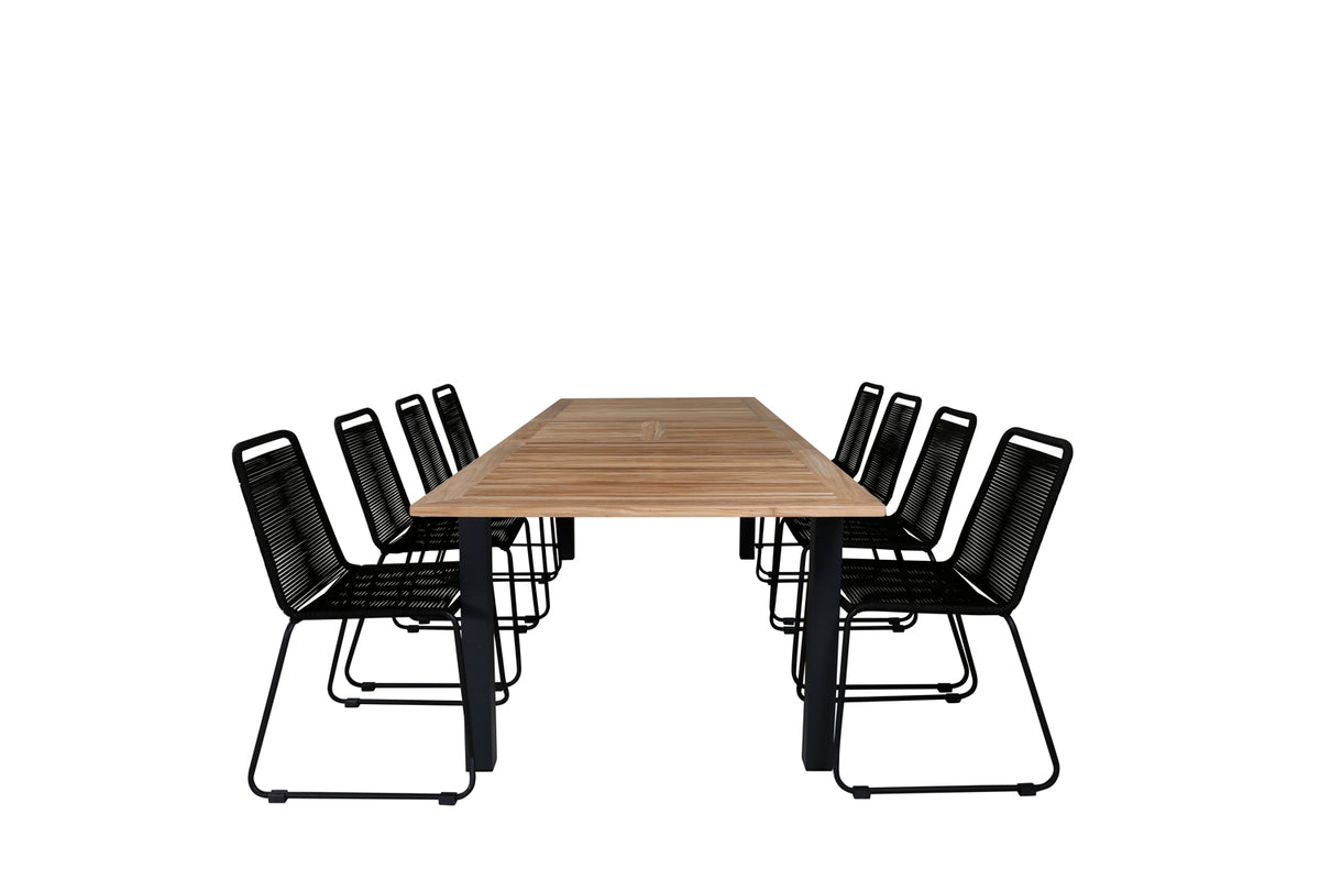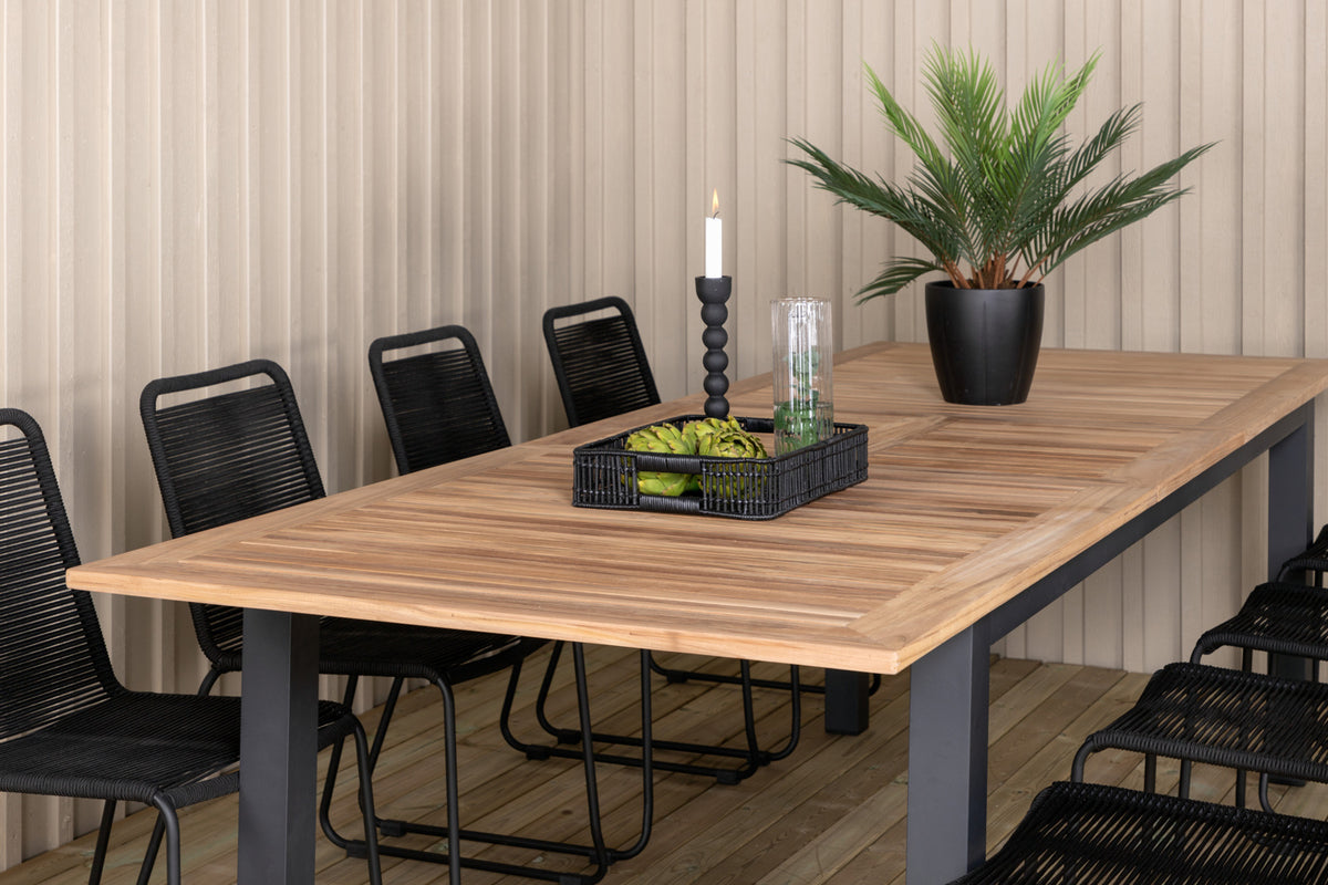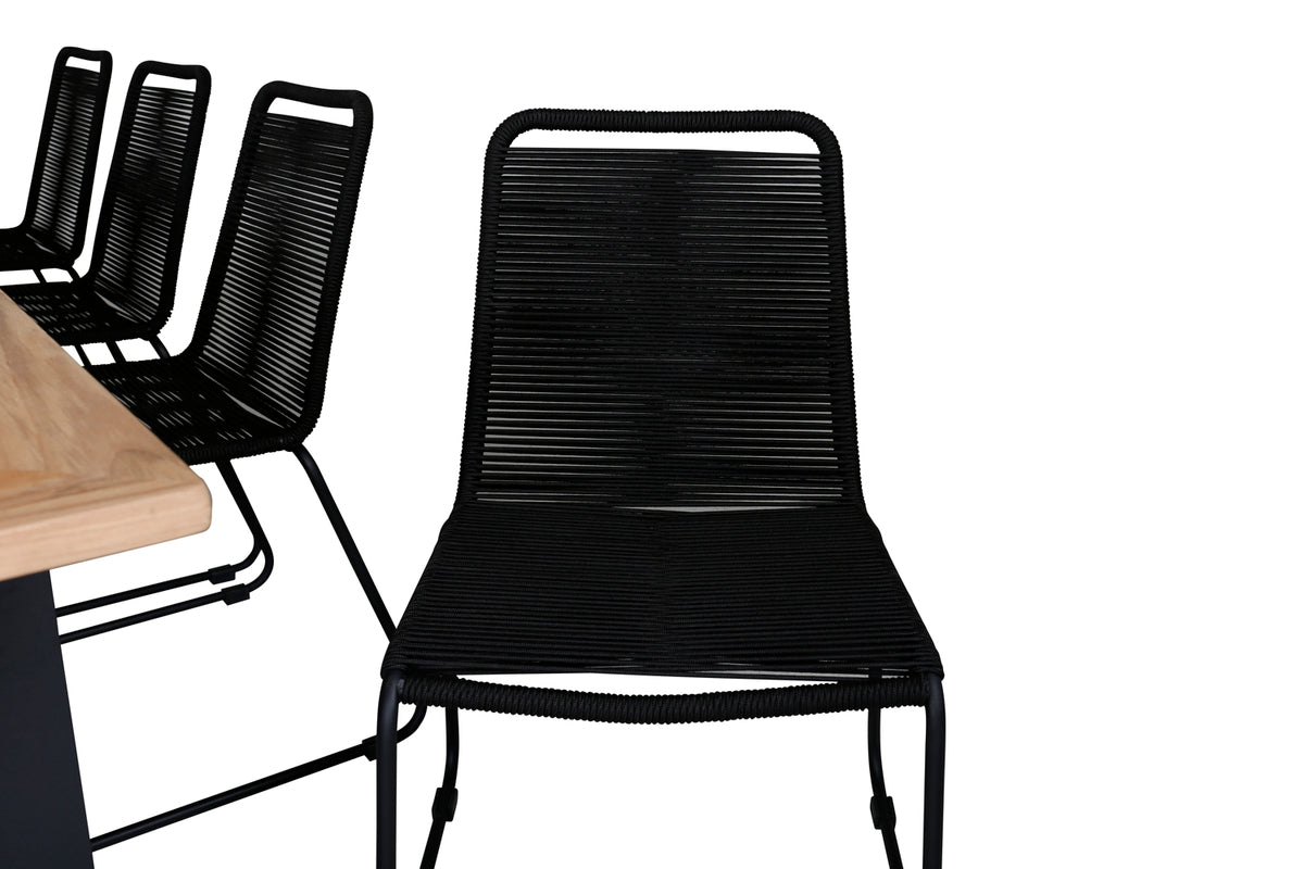 Det forlængelsesbare spisebord Panama i en klassisk stil og dekorativ bordplade i træ. Til bordet medfølger vores populære spisebordsstole Lindos i sort farve, en kombination som skaber en trendy og indbydende følelse til udestuen. Udvid dine middagsinvitationer og slip for at bekymre dig om, at alle skal få plads.
