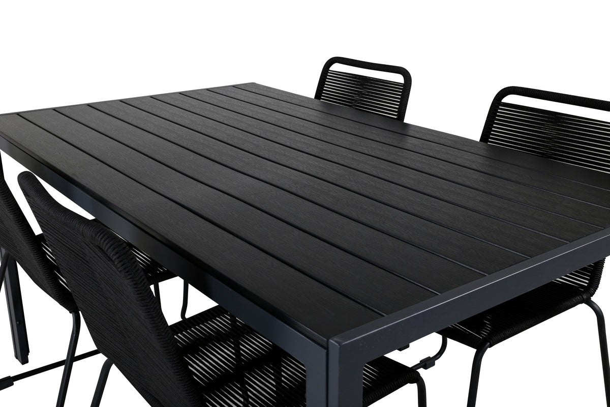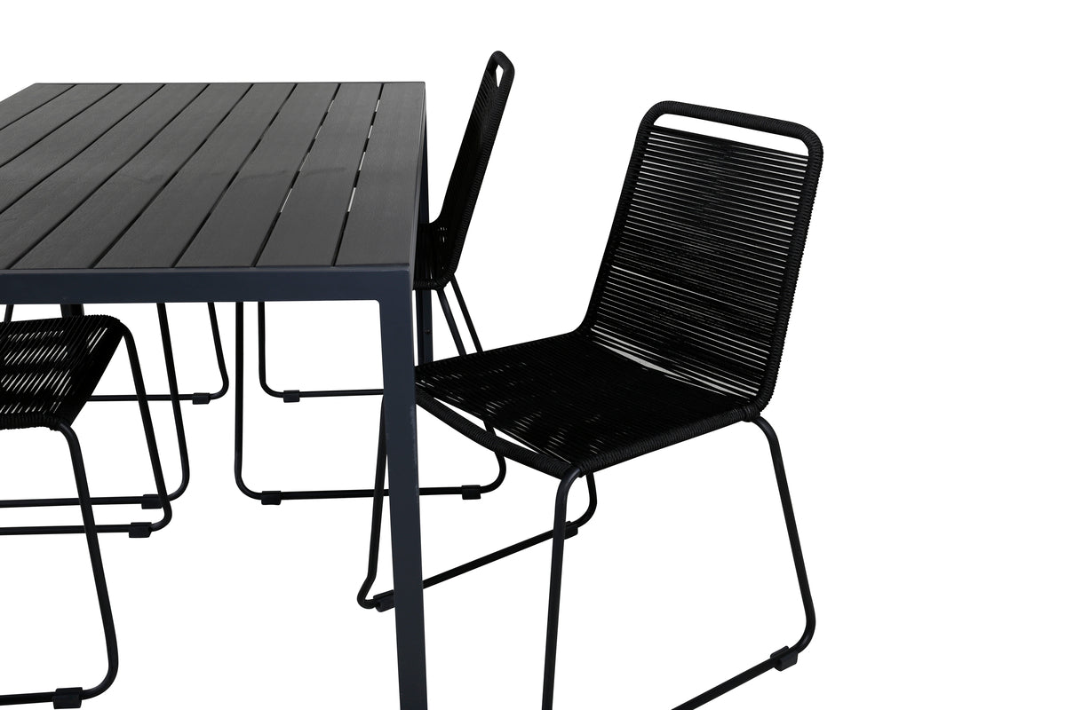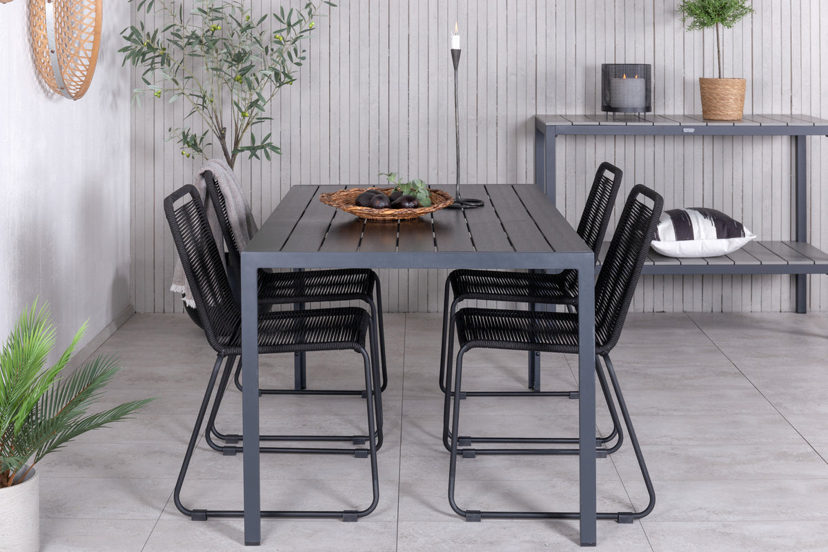 Skab en stilren atmosfære i udestuen med en iøjnefaldende spisegruppe i moderne ånd! Vores populære spisestole Lindos sætter virkelig tonen med deres minimalistiske design. Stolene er stabelbare for praktisk opbevaring og fremstillet i en smal, sort aluminiumskonstruktion med et sæde i sort vævet reb. Her sammen med vores rektangulære spisebord Break i lige nordisk form. Bordpladen er i sort krydsfiner og understellet i aluminium. Simpelthen en gennemtænkt spisegruppe, som du nemt skaber charmerende udendørsmiljøer med!
