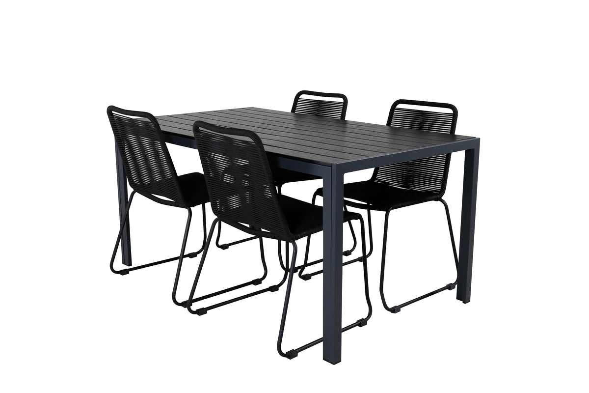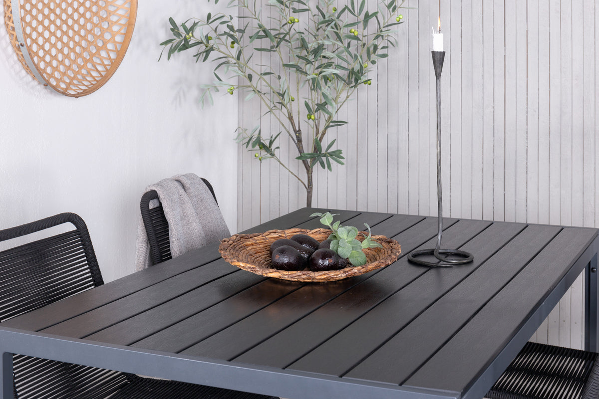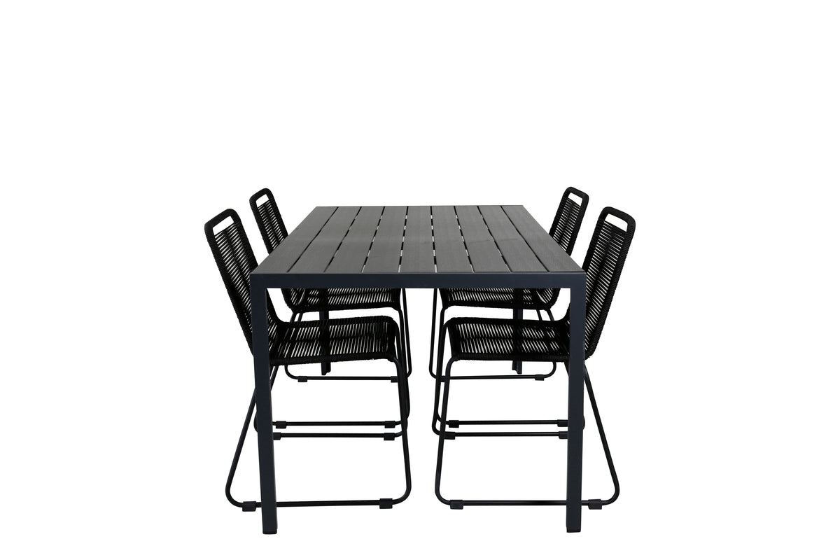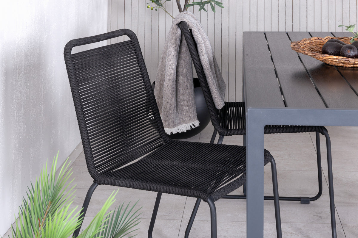 Skab en stilren atmosfære i udestuen med en iøjnefaldende spisegruppe i moderne ånd! Vores populære spisestole Lindos sætter virkelig tonen med deres minimalistiske design. Stolene er stabelbare for praktisk opbevaring og fremstillet i en smal, sort aluminiumskonstruktion med et sæde i sort vævet reb. Her sammen med vores rektangulære spisebord Break i lige nordisk form. Bordpladen er i sort krydsfiner og understellet i aluminium. Simpelthen en gennemtænkt spisegruppe, som du nemt skaber charmerende udendørsmiljøer med!