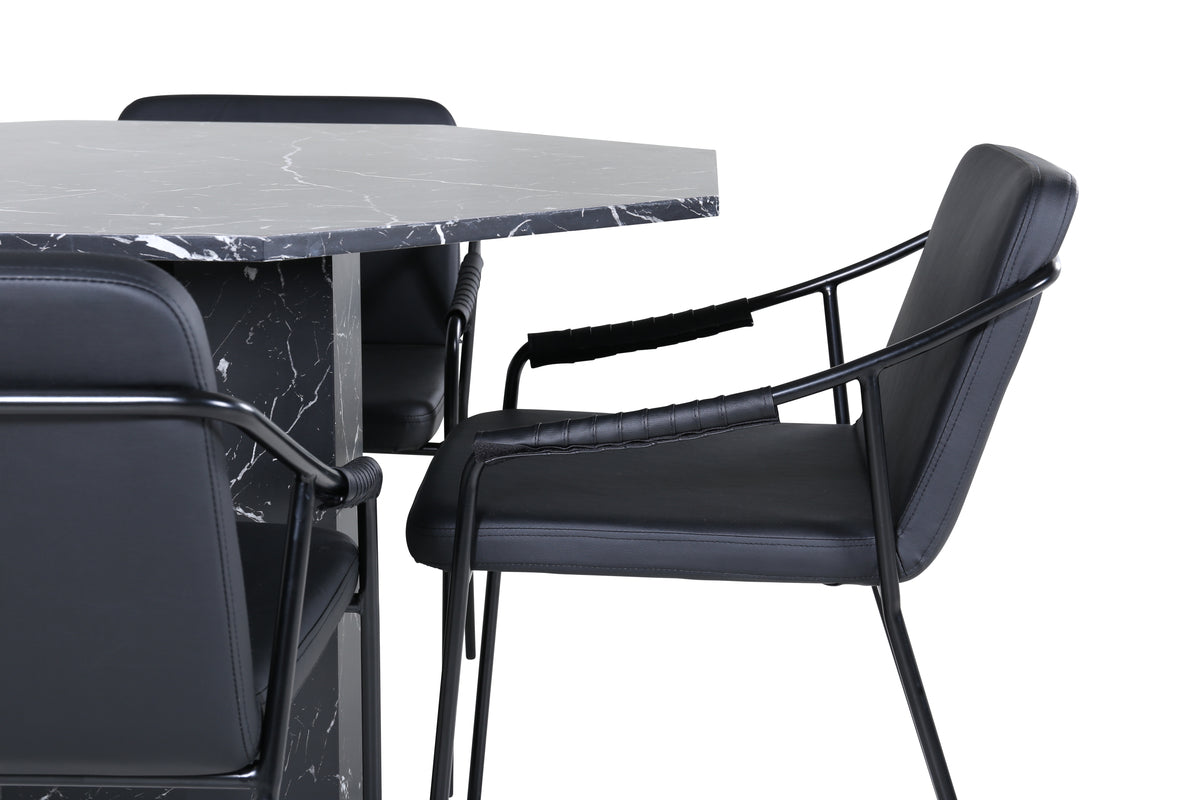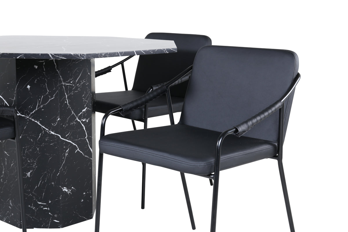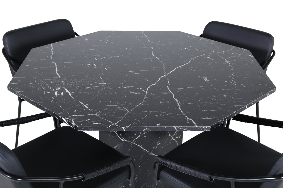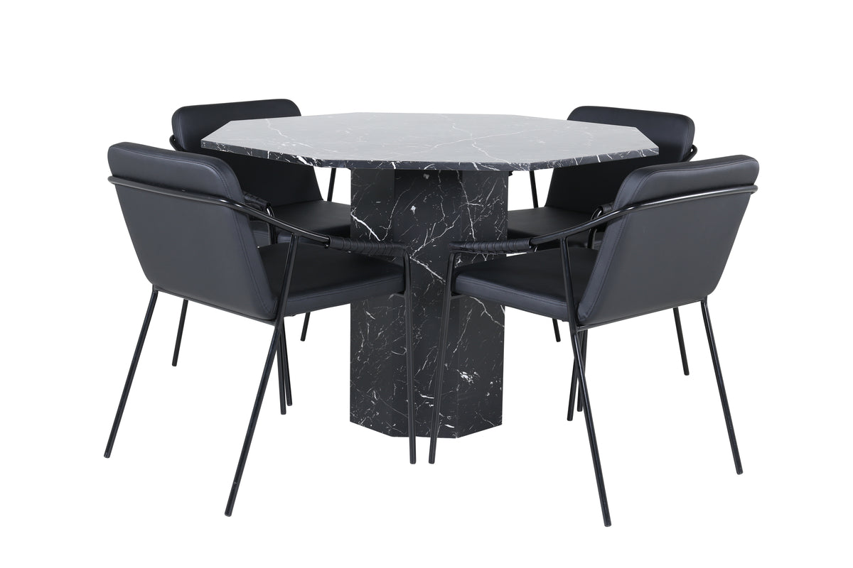 Spisebordet Marbs skaber en øjenfanger, der imponerer! Bordet er formet som en oktagon og har et fuldt klædt design med en bordplade i sort marmor glas med sprøjtede hvide mønstre og bordben i MDF og marmorpapir. Bordmål: Diameter: 110 cm, Højde: 75 cm. Her er det matchet med 4 Tvist spisebordsstole i lækkert design. Sæderne er i sort kunstlæder og har integrerede armlæn samt stolben i sort jern. Stolmål: Højde: 77 cm, sædehøjde: 48 cm, bredde: 53 cm, dybde: 59 cm.