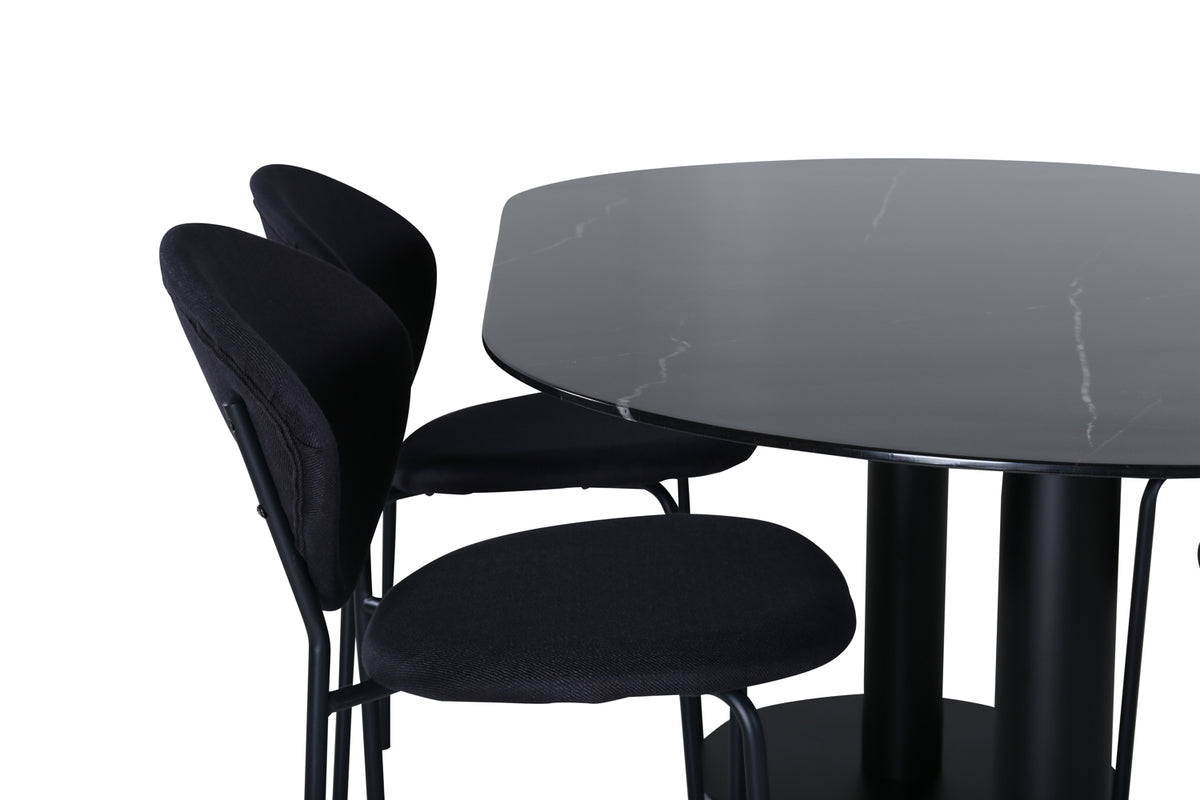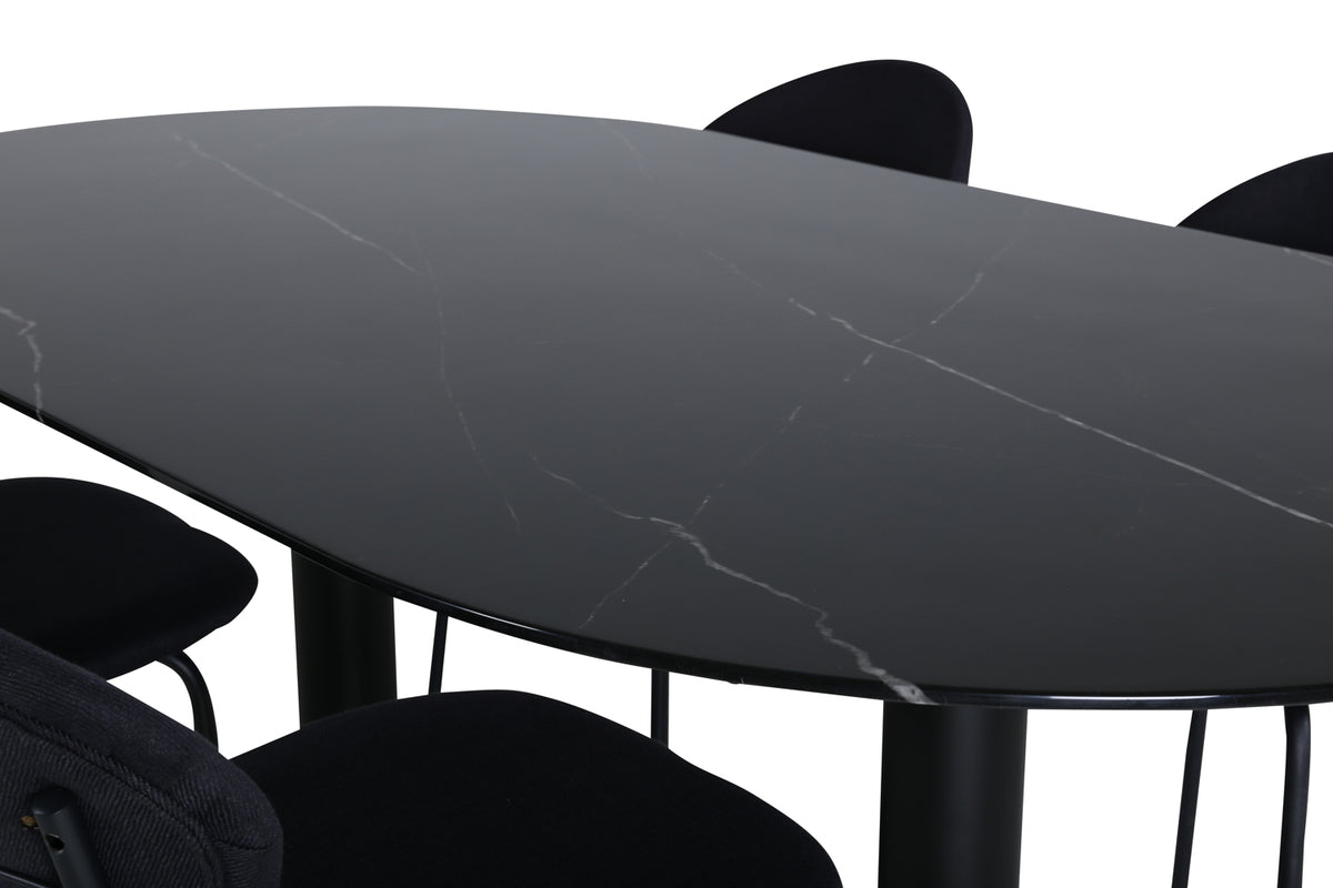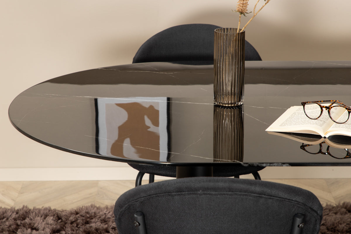 Spisebordet Pillan skaber et modebevidst indtryk og en behagelig atmosfære i dit hjem! Det ovale design og den overordnede udformning er velovervejet med en tynd topplade i sort marmor glas og to stabile bordben i sort metal. Bordmål: Længde: 180 cm, Bredde: 100 cm, Højde: 74 cm. Her matchet med 4 Vault spiseborde med sorte ben i metal og sorte sæder i polyester. Stolemål: Højde: 80 cm, sædehøjde: 49 cm, bredde: 46 cm, dybde: 61,5 cm. Lad tiden ved spisebordet blive et af dagens højdepunkter!