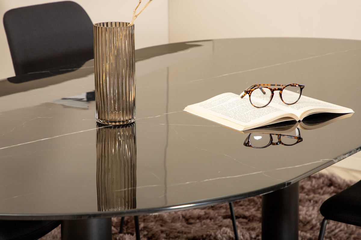 Så stilfuldt som indbydende - spisebordet Pillan skaber et modebevidst indtryk og en behagelig atmosfære i dit hjem! Det ovale design og den overordnede udformning er velovervejet med en tynd topplade i sort marmor glas og to stabile bordben i sort metal. Bordmål: Længde: 180 cm, Bredde: 100 cm, Højde: 74 cm. Matchet med 4 Muce spiseborde i stilfuldt design. Stolbenene er smalle i metal, og sæderne er i sort polyesterstof. Stolemål: Højde: 84 cm, sædehøjde: 47 cm, bredde: 43 cm, dybde: 63 cm. Indret stuen med en familie spisegruppe med moderne følelse!