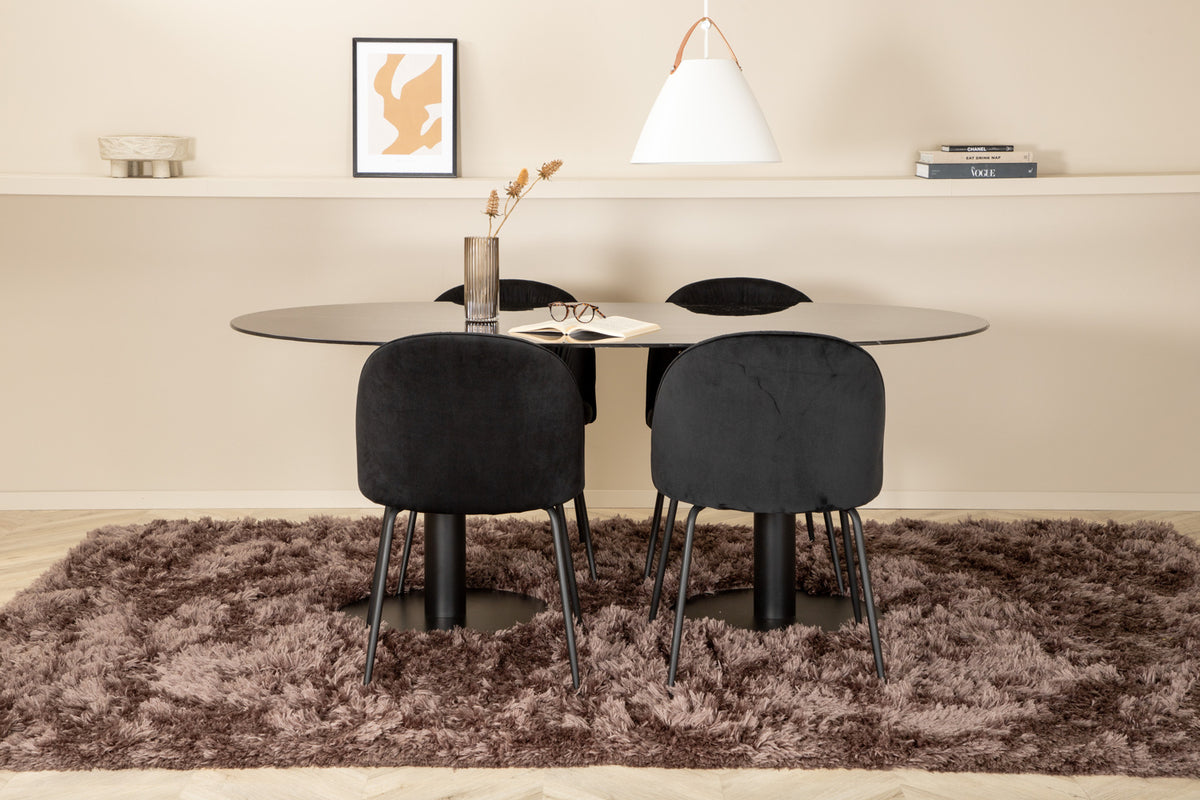 Spisebordet Pillan imponerer med sit elegante design og indbydende, ovale form! Den overordnede udformning er meget velovervejet med en tynd topplade i sort marmor glas og to stabile bordben i sort metal. Bordmål: Længde: 180 cm, Bredde: 100 cm, Højde: 74 cm. Her i perfekt kombination med vores populære spiseborde Wrinkles i luksuriøst design. Stolbenene er i sort metal, og det let rynkede sæde er i blødt velourstof. Stolemål: Højde: 79,5 cm, sædehøjde: 49,5 cm, bredde: 49 cm, dybde: 50 cm. Indret stuen med en moderne følelse!