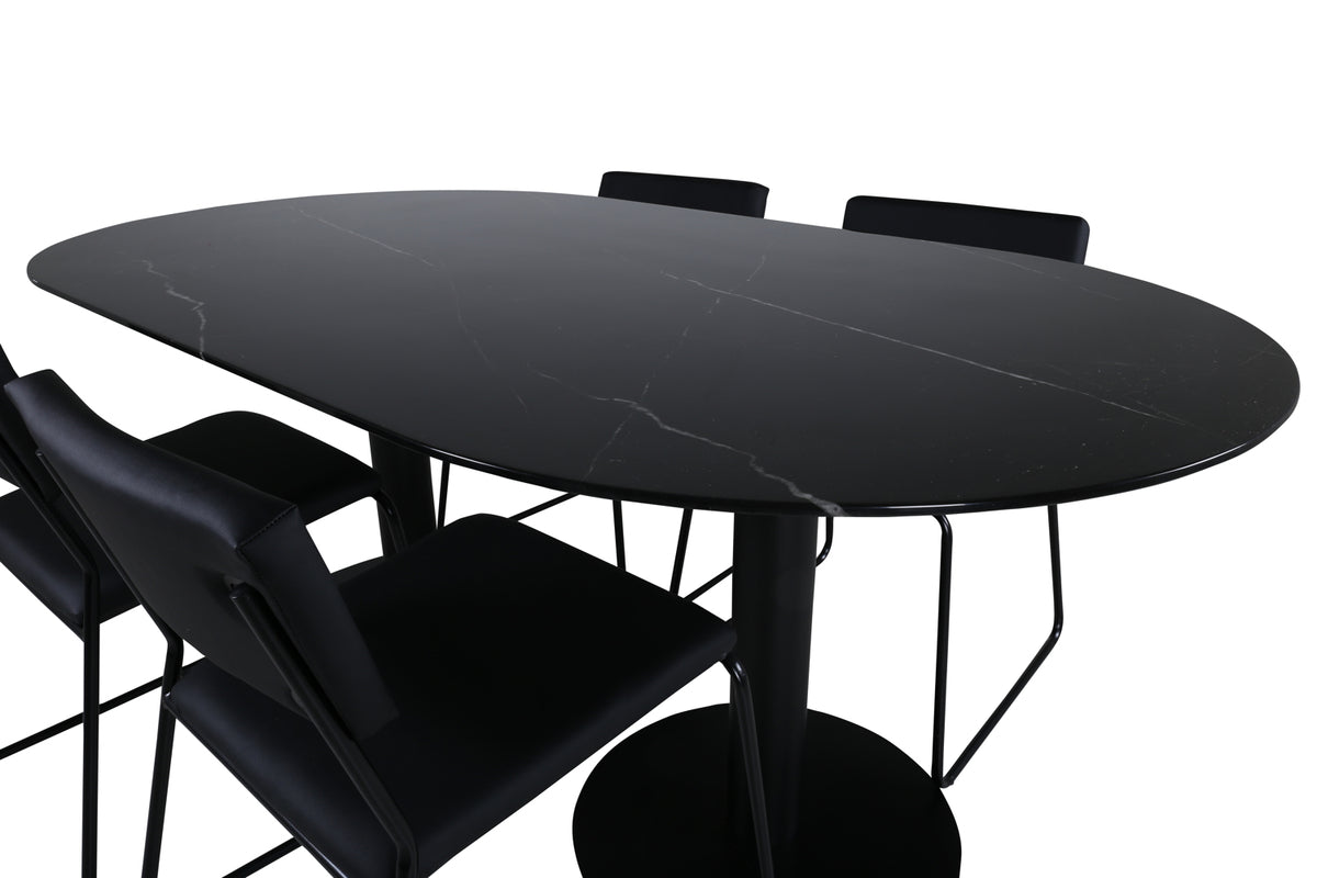 Stilfuld og luftig - en perfekt kombination af elegance og minimalisme! Spisebordet Pillan imponerer med sit elegante design og indbydende, ovale form. Den overordnede udformning er meget velovervejet med en tynd topplade i sort marmor glas og to stabile bordben i sort metal. Bordmål: Længde: 180 cm, Bredde: 100 cm, Højde: 74 cm. Her er det matchet med 4 Kenth spiseborde i smalt design med sorte stolben i jern og sorte sæder i kunstlæder. Stolemål: Højde: 76 cm, sædehøjde: 48,5 cm, bredde: 40 cm, dybde: 52 cm. Lad denne smukt matchede spisegruppe med en moderne følelse blive et naturligt samlingspunkt i dit hjem.