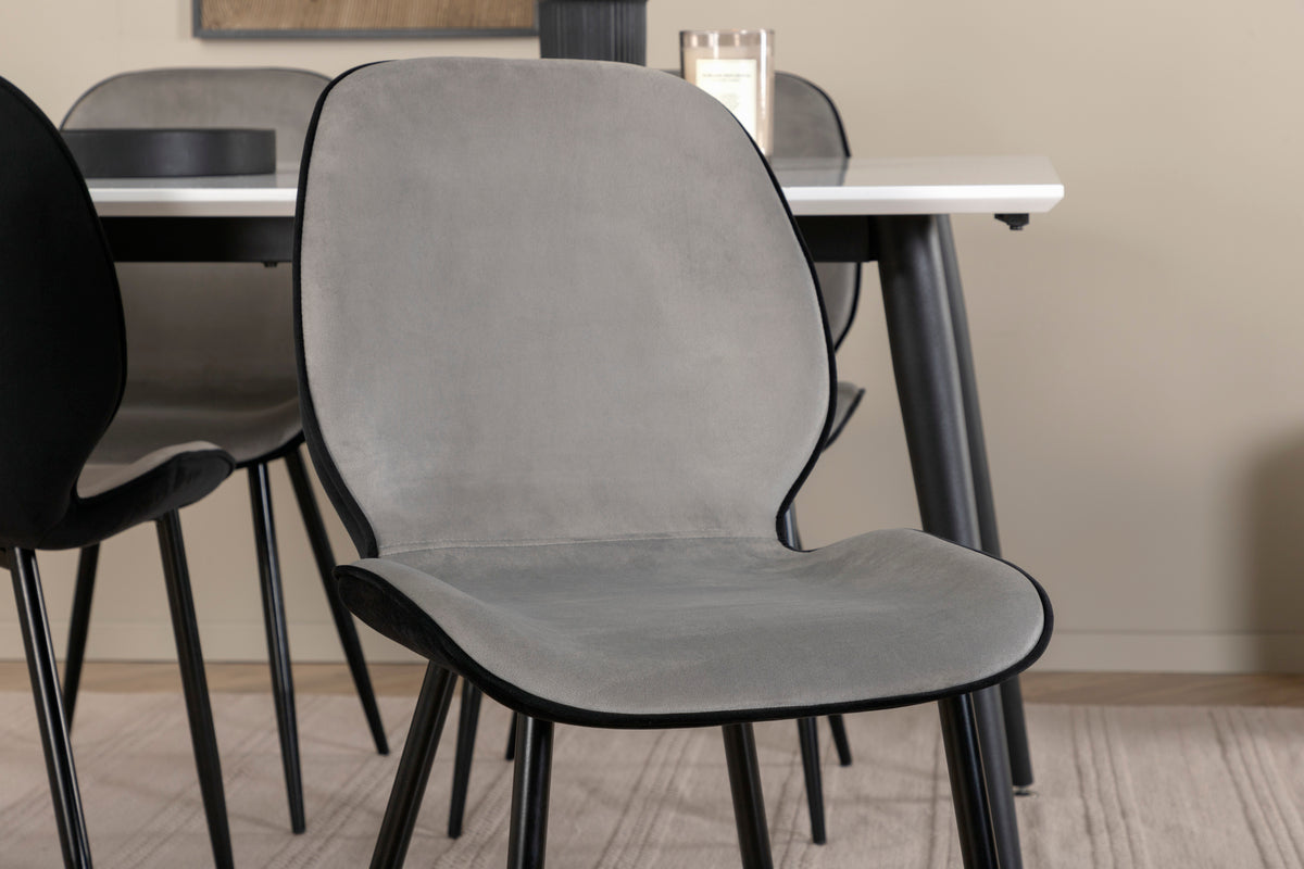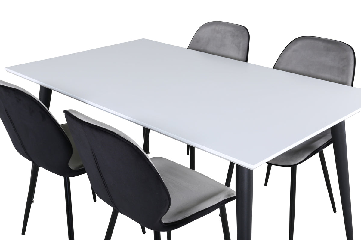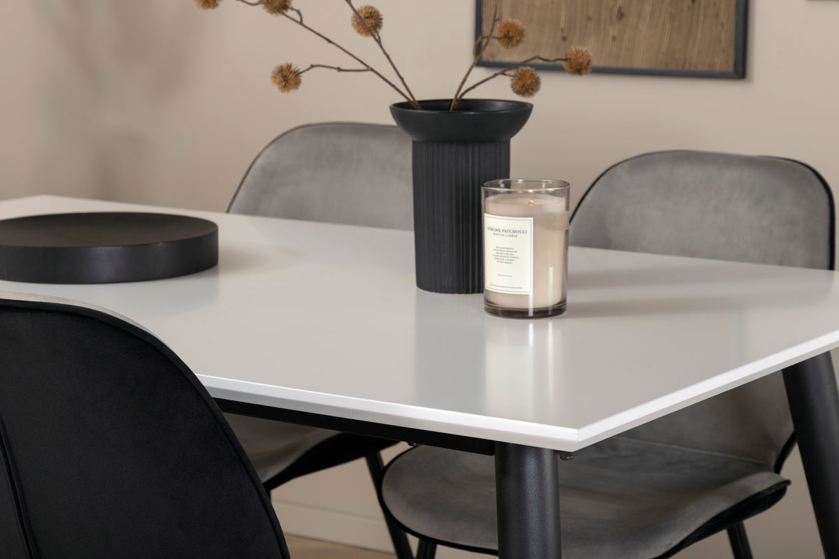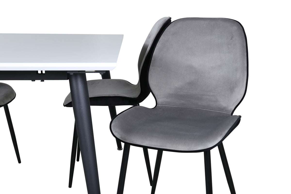 Klassisk, stilfuld og praktisk - Jimmy spisebord er et sikkert valg til alle anledninger! Med en udtrækkelig topplade i hvid HPL og MDF-finer og let svungne ben i sort metal passer dette bord perfekt til alle indretningsstile og hjem. Borddimensioner: Længde udtrækkelig mellem: 150cm og 240cm, bredde: 90cm, højde: 76cm. Matchet her med 4 Emma spisebænke i cool look. Bænkenes ben er i sort jern, og sæderne er lys grå samt sorte i blødt velourstof, hvilket giver en lækker varieret glans til rummet. Bænkens dimensioner: Højde: 89cm, sædehøjde: 45cm, bredde: 47cm, dybde: 57cm.
