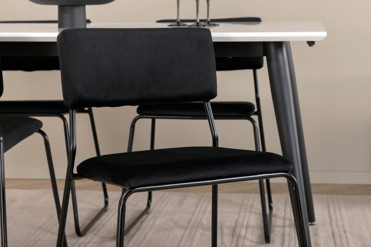 Minimalistisk og stilfuld - en spisegruppe til alle anledninger! Jimmy spisebord har en udtrækkelig topplade i hvid HPL og MDF-finer og let svungne ben i sort metal, et klassisk look der gør dette bord perfekt til alle indretningsstile og hjem. Borddimensioner: Længde udtrækkelig mellem: 150cm og 240cm, bredde: 90cm, højde: 76cm. Her sammen med 4 Kenth spisebænke i smukt design. Bænkenes ben er stilfuldt smalle i sort jern, og sæderne er komfortable i sort velour. Bænkens dimensioner: Højde: 76cm, sædehøjde: 48.5cm, bredde: 40cm, dybde: 52cm.