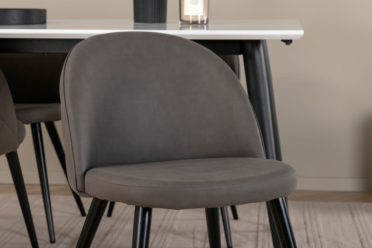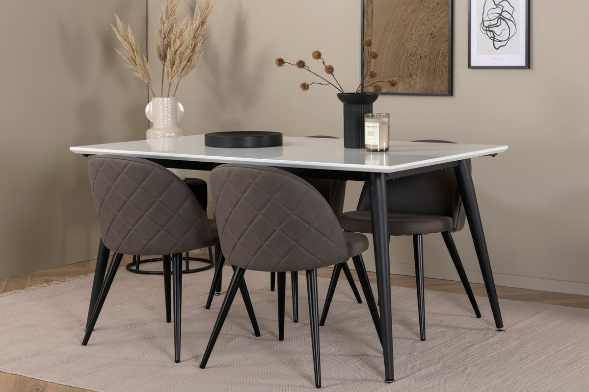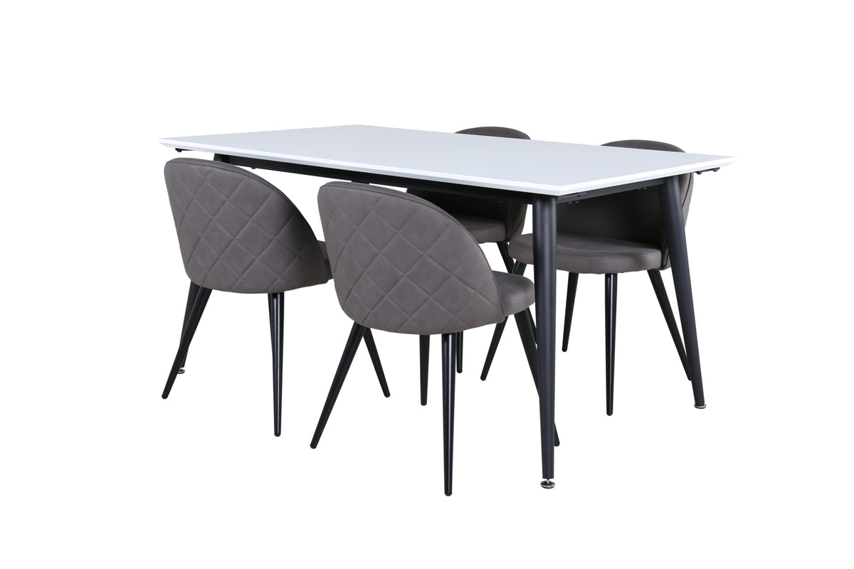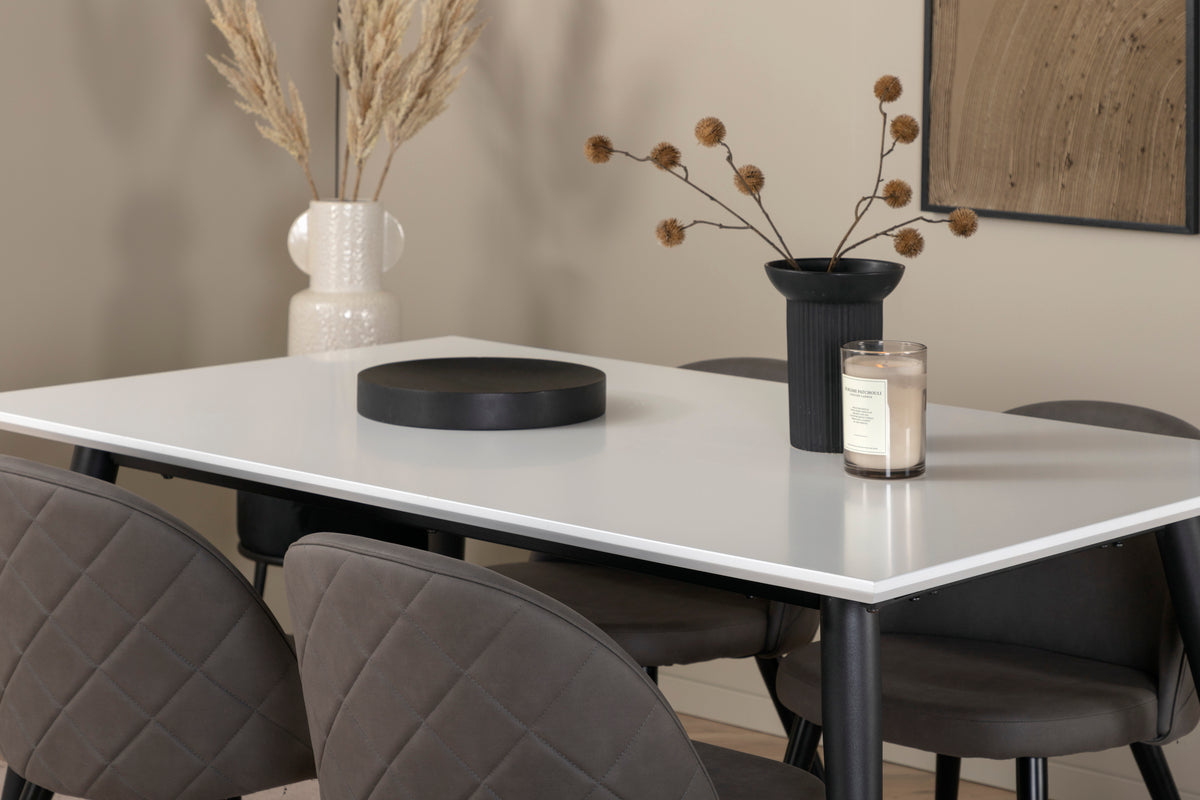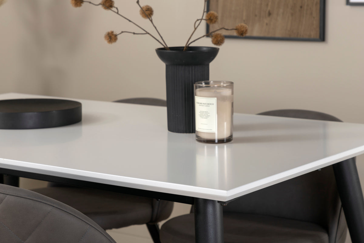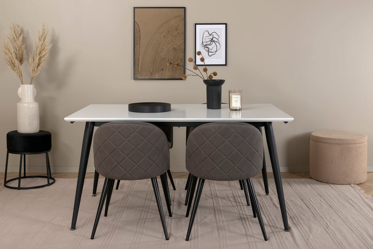 Skab en hjemlig og indbydende atmosfære i hjertet af hjemmet! Jimmy spisebord er et sikkert valg til alle anledninger. Med en udtrækkelig topplade i hvid HPL og MDF-finer og let svungne ben i sort metal passer dette bord perfekt til alle indretningsstile og hjem. Borddimensioner: Længde udtrækkelig mellem: 150cm og 240cm, bredde: 90cm, højde: 76cm. Her i perfekt kombination med 4 af vores populære Velvet Stitches spisebænke. De sorte metalben er svungne i skandinavisk design, og sæderne i grå mikrofiber har en stilfuld dekorationssøm på bagsiden af bænken. Bænkens dimensioner: Højde: 76.5cm, sædehøjde: 46.5cm, bredde: 50cm, dybde: 57cm.