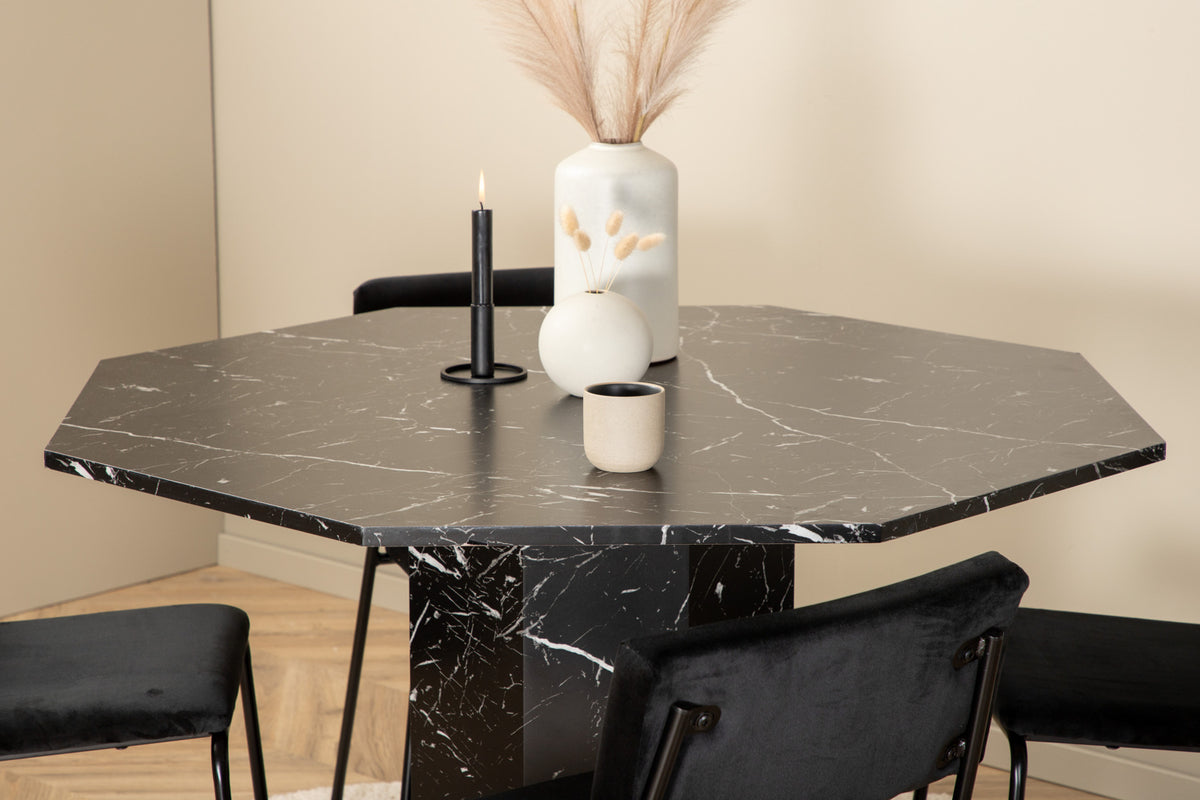 Indbydende og stilfuld - Spisebordet Marbs skaber et modebevidst indtryk i dit hjem! Bordet har en oktagonal form og har et fuldt dækket design med en topplade i sort marmor glas med spraglet hvidt mønster og bordben i MDF og marmorpapir. Borddimensioner: Diameter: 110cm, Højde: 75cm. Matchet her med 4 Kenth spisebordsstole i sort farve med jern og sæder i blødt velourstof. Stolens dimensioner: Højde: 76cm, sædehøjde: 48.5cm, bredde: 40cm, dybde: 52cm. Lad hjemmets hjerte blive prydet af denne iøjnefaldende spisegruppe!